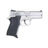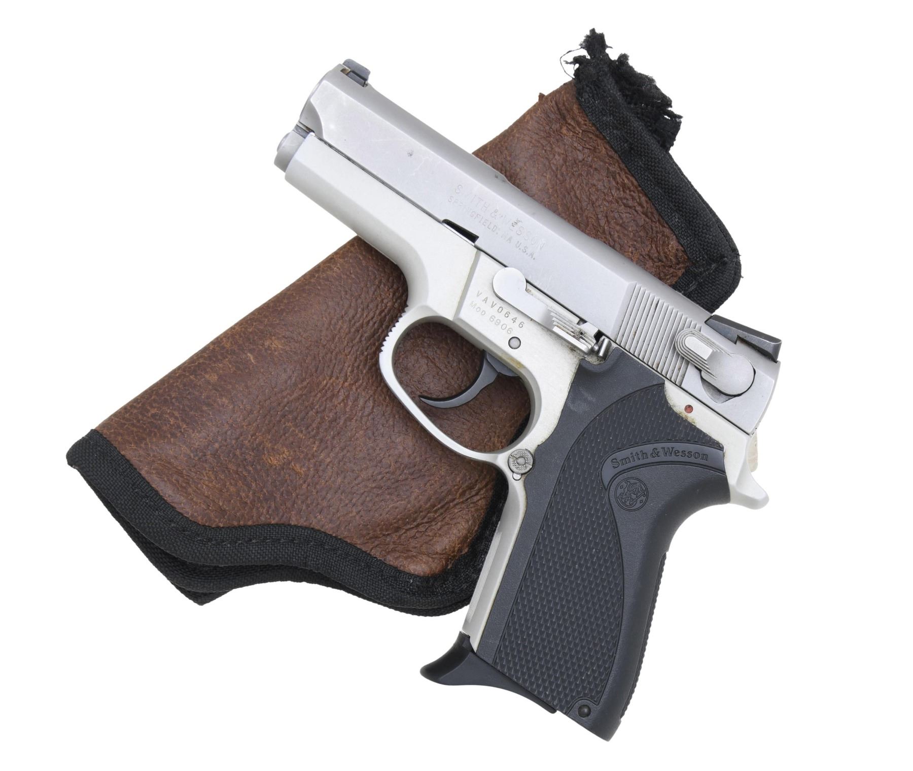 Cal. 9x19. S# VAV0646. Bbl. 3 1/2". Three-dot sights with Novak rear. Double-action semi-auto pistol with shrouded hammer and mag-disconnect safety. Stainless finish. Checkered black grips with S&W logo. MAGS: one 10-rd. UNATTACHED ACCESSORIES: right-handed aftermarket holster. CONDITION: grips show scattered handling marks. Bottom of the trigger guard has a cleaned area with some oxidation; the metal otherwise shows some grease staining, small spots of oxidation, and edge and handling wear. Action functions properly when hand-cycled. Very good, bright bore. PROVENANCE: from the lifelong collection of Bill Peterken. (24-6058/MJC). MODERN. $300-450.