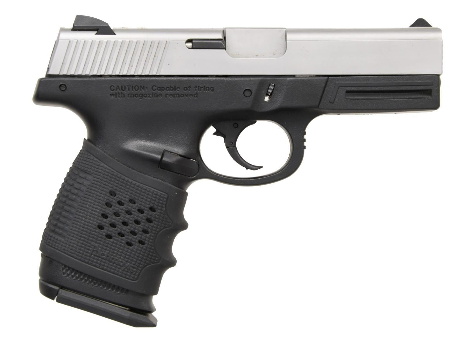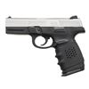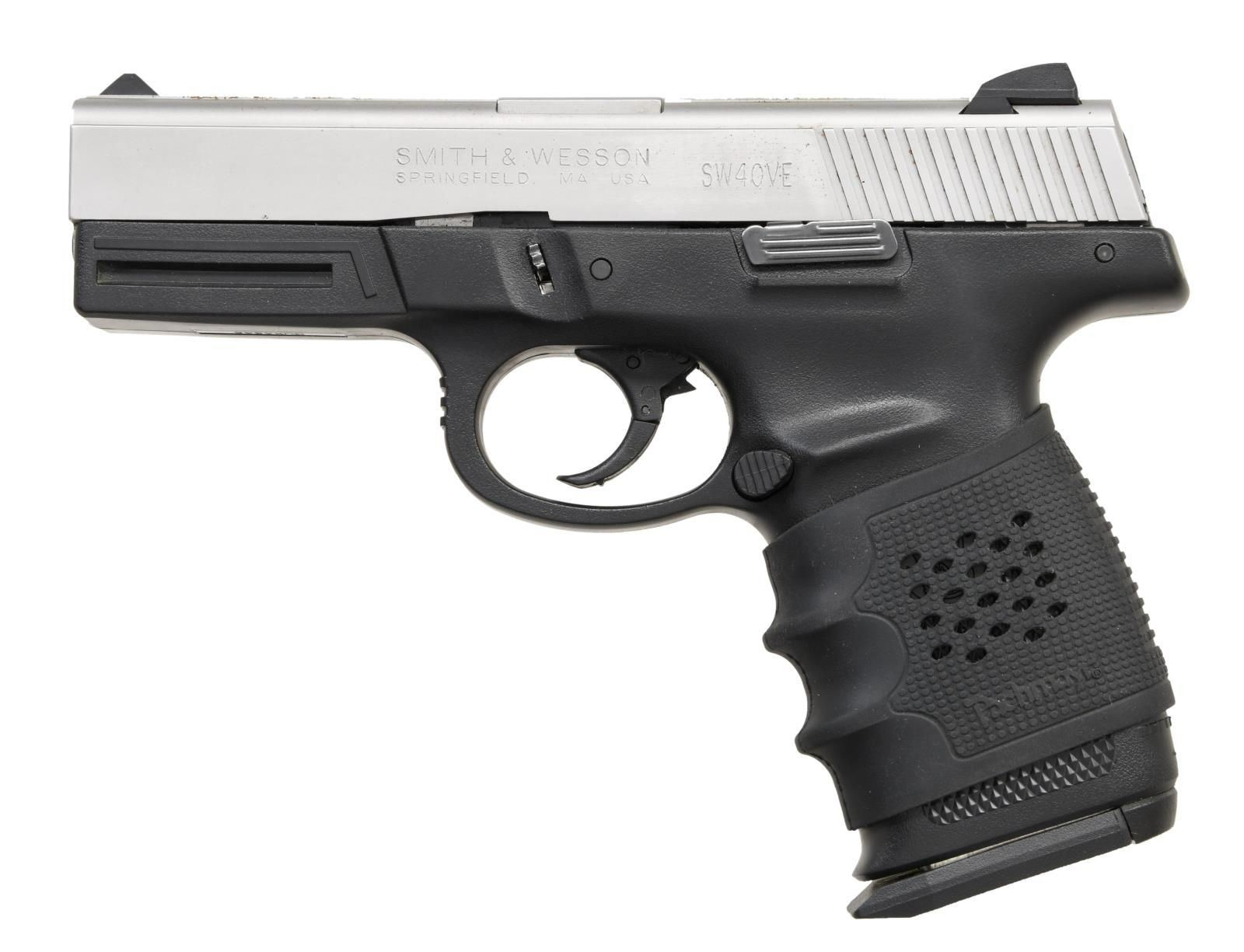 Cal. 40 S&W. S# DUX4845. Bbl 3 7/8". Model SW40VE manufactured by Smith & Wesson. Left side of slide is stamped with the manufacturer information and model designation, with the top of the barrel being marked with the caliber designation. Stainless steel slide with black polymer frame. Frame is mounted with a black rubber Pachmayr grip sleeve. MAGS: 2 14 rnd. CONDITION: slide exhibits some scattered spots of light oxidation and a few superficial marks from handling. Mirror bore, exhibiting strong rifling throughout. Frame shows a few light superficial marks from handling and storage. (23-2701/MLW). MODERN. $400-600.
