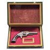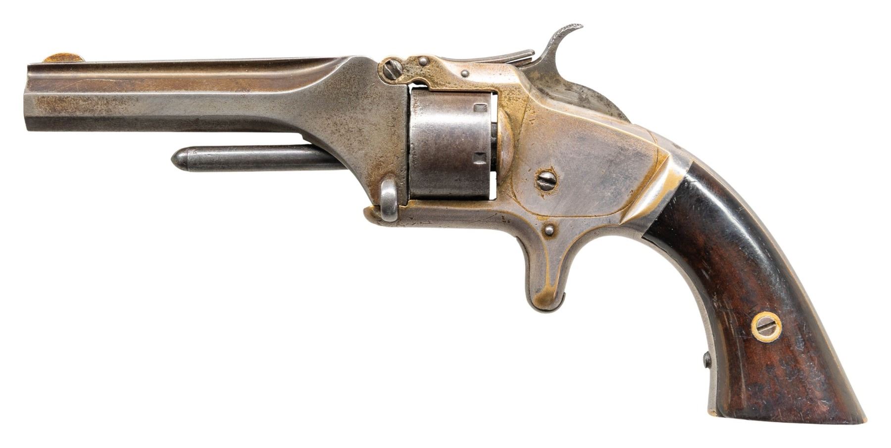 Cal. 22 S. S# 34159. Bbl. 3 1/4". Round brass blade front sight. Frame & bbl. have matching assembly numbers. Cyl. has different assembly number. No. 1 2nd issue revolver. There is a faint inscribed name on bottom of grip frame that appears to read "HUGHES". Consignor states this was J.R. Hughes who rode with infamous Texas Outlaw Johnny Ringo. Hughes died in 1899 in New Mexico. Brass frame with silver plated finish. Smooth hardwood grips with matching numbered right panel. UNATTACHED ACCESSORIES: modern fake book gun case. CONDITION: grips have an older dark added varnish with scattered light chipping, flaking & handling marks. Bbl. assembly, ejector & cyl. are mostly a gray patina with oxidation & some moderate pitting. Frame & grip straps retain 30% silver plate with overall flaking showing brass underneath, some light pitting, oxidation spots & handling marks. Cyl. spins freely when hammer is at full cock & will require attention to fix. Bore shows overall pitting but visible rifling. (01-27888/MJC). ANTIQUE. $800-1,200.