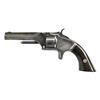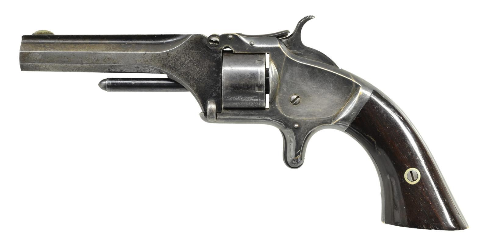 Cal. 22 Short. S# 71203. Bbl. 3 3/16" oct. w/ circular front sight & rib marked "SMITH & WESSON. SPRINGFIELD, MASS". Blue finished bbl. & silver finished receiver. 7 Shot cyl. marked "PATENTED APRIL 3, 1855, JULY, 5, 1859 & DEC. 13, 1860". 2 Piece rosewood square butt grips. CONDITION: fair bbl. blue fading to gray/brown w/ peppery oxidation. Dark tarnished receiver has pinprick oxidation. Good varnish on grips w/ handling marks. Good bore w/ strong rifling has area of pitting forward of chamber. (01-20277/MD). ANTIQUE. $400-600.