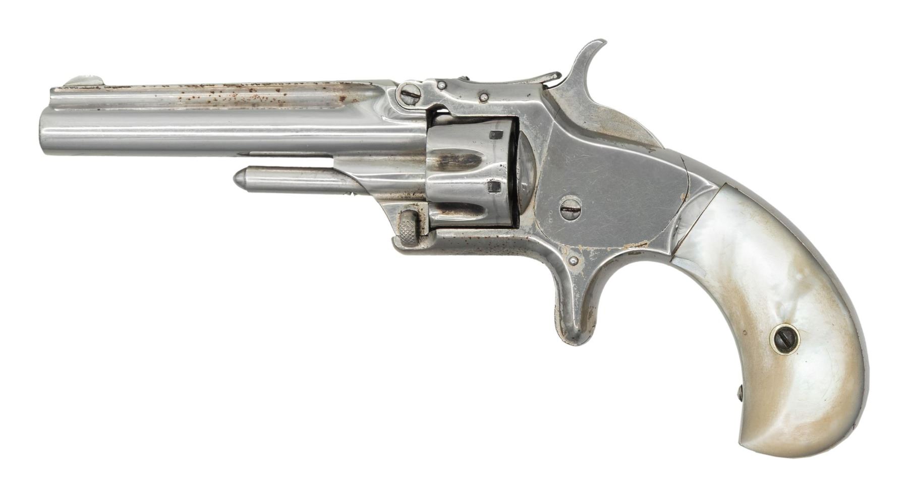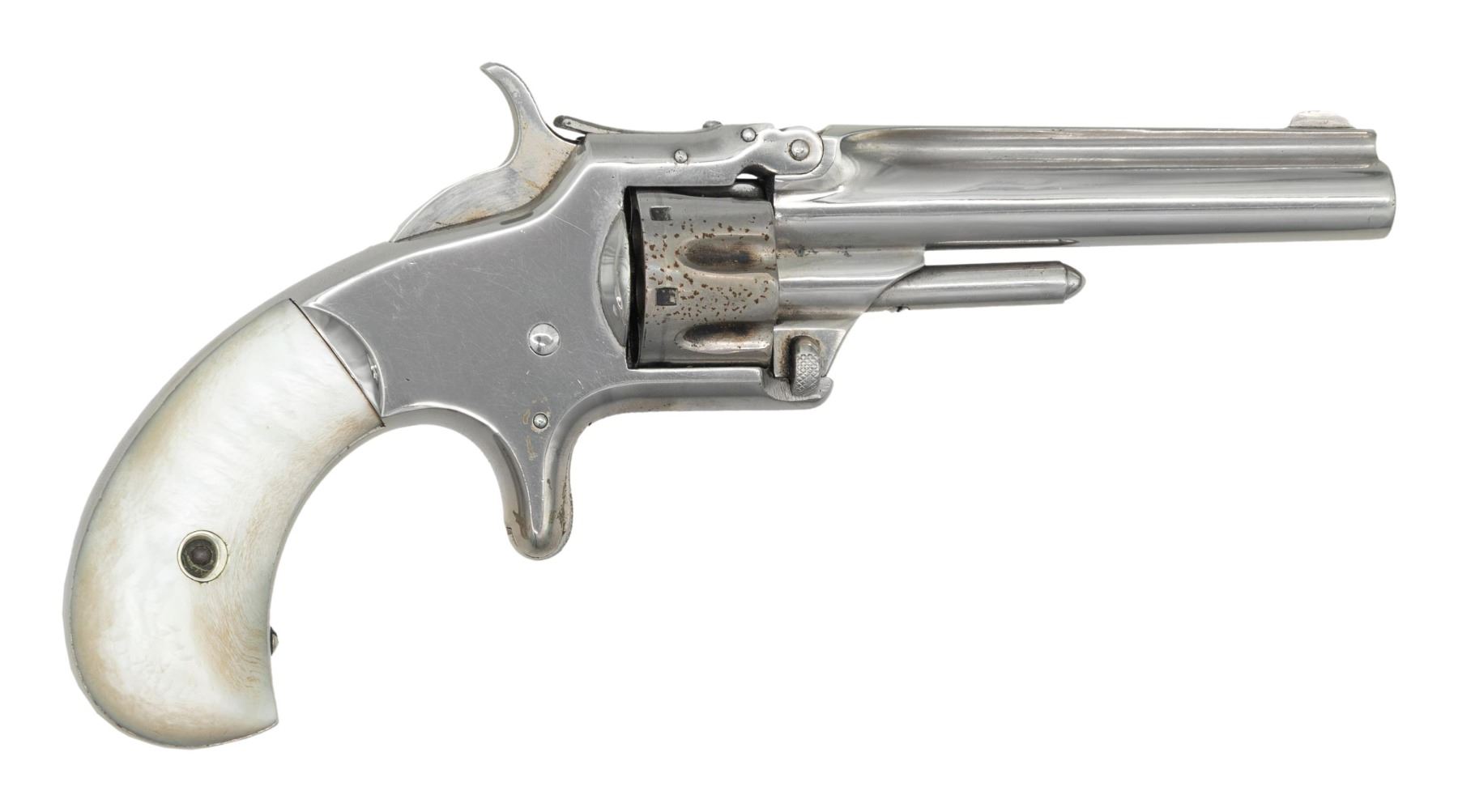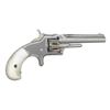 Cal. 22 S. S# 52839. Bbl. 3 3/16". Blade front sight. Fixed rear sight. Matching assembly numbers on grip frame, bbl. & cyl. 3rd issue No. 1 revolver. 7-shot cyl. Renickeled finish. Pearl type grips. CONDITION: grips show a chip on front of left panel, some dings & handling marks. Metal retains 90% reapplied nickel with some light oxidation, flaking & handling marks. Cyl. spins freely when hammer is at full cock & will need attention to fix. Bore shows scattered oxidation & pitting but strong rifling. (01-28660/MJC). ANTIQUE. $200-300.
