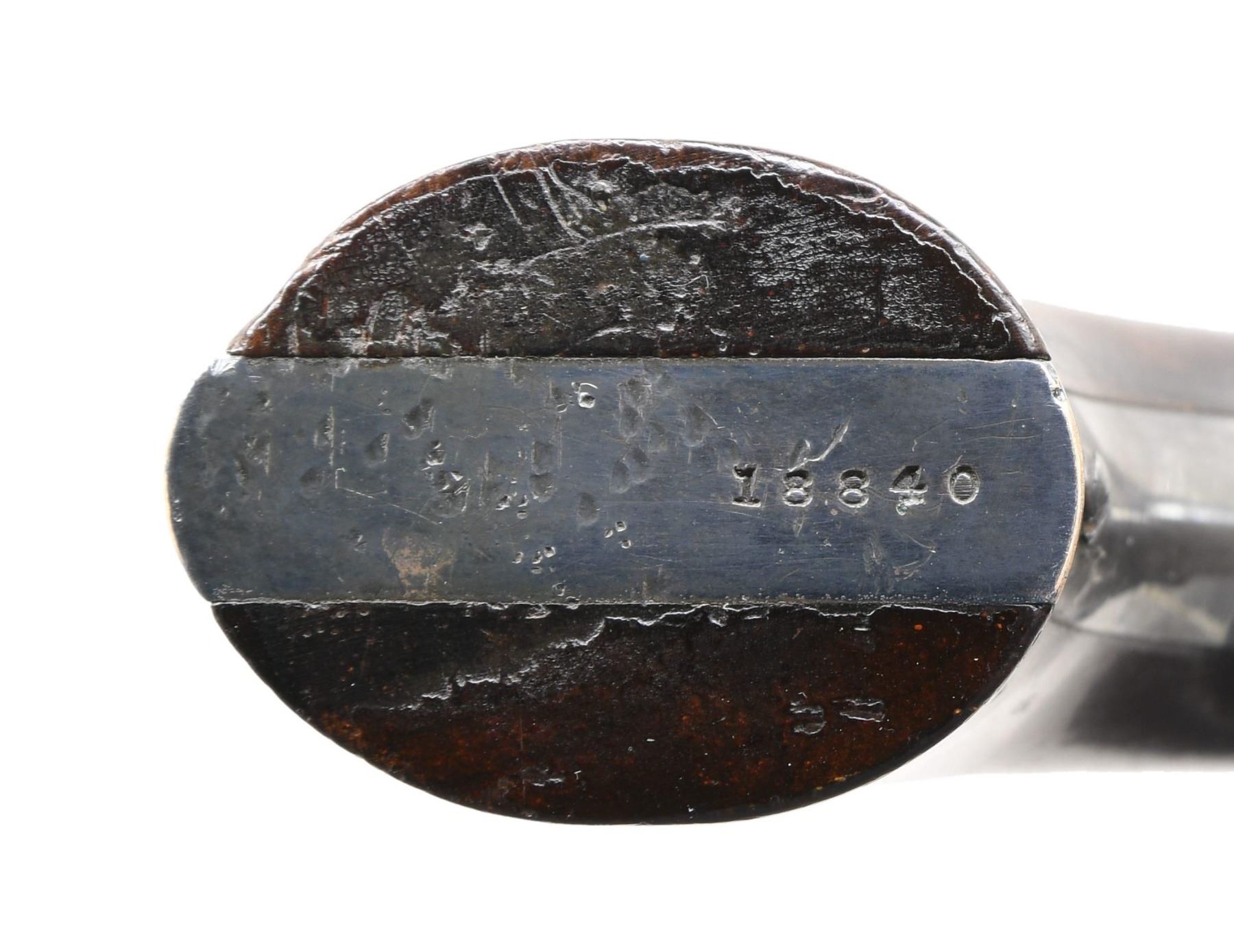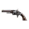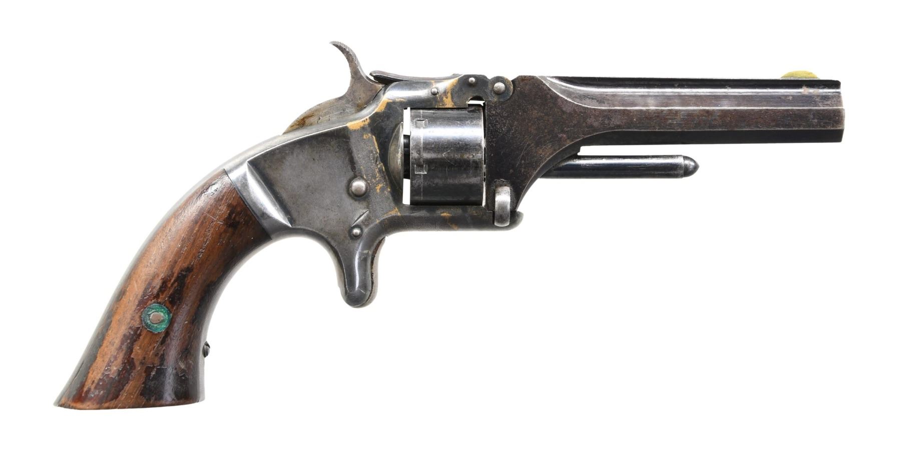 Cal. 22 Short. S# 18840. Bbl. 3 1/4", octagon with semi-circular German silver sight. Seven-shot round cyl. Tip-up action with brass frame having spur trigger. Blue finished bbl. and cyl. with silver finished action. Two-piece rosewood grips. Total of about 117,000 mfg. 1860-68. CONDITION: bbl. and cyl. retain 70% lightly faded blue, showing areas of corrosion. Frame has over 90% silver finish, showing an attractive dark tarnish, with small marks at the butt. Grips show areas of worn and peeling finish. Cyl. does not rotate properly when action is cycled. Bore retains good rifling, showing some light pitting. (01-25807/DS). ANTIQUE. $1,200-1,800.