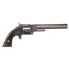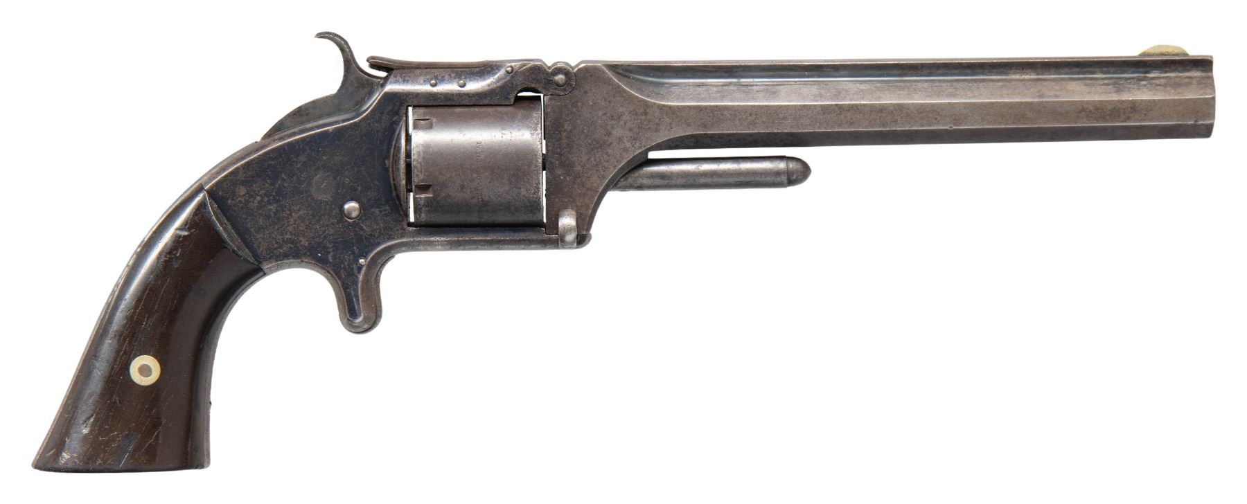 Cal. 32 RF. S# 19087. Bbl. 6". Round blade front sight. Matching assembly numbers on bbl., cyl. & grip frame. Blued finish. Smooth hardwood grips with matching numbered right panel. CONDITION: grips have an old added finish with scattered finish loss, dings & some thin cracks. Metal retains 30% original blue with overall fading to gray, scattered oxidation, handling marks & edge wear. Action has three clicks & is functional when hand cycled. Bore shows overall pitting with good rifling. (01-27908/MJC). ANTIQUE. $500-800.