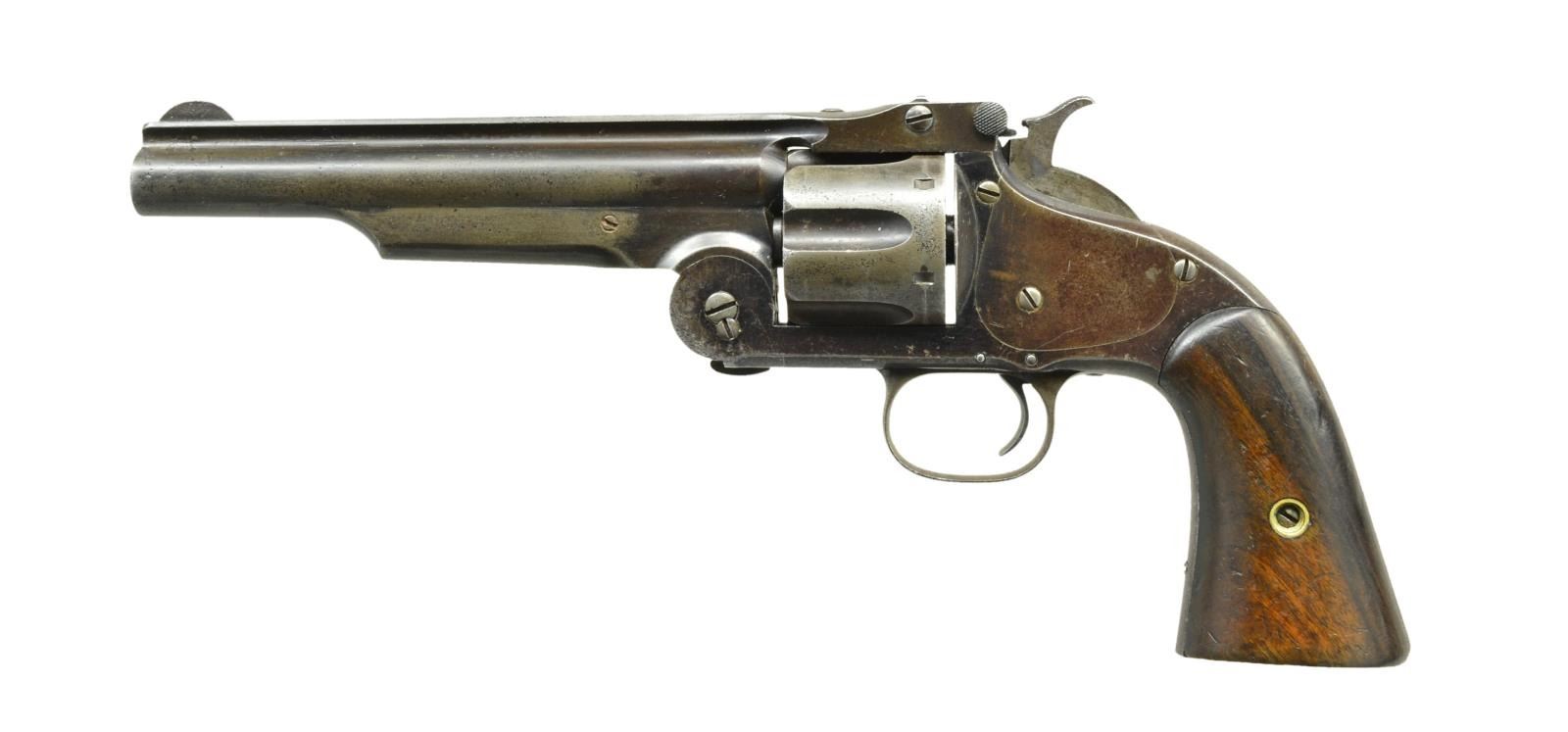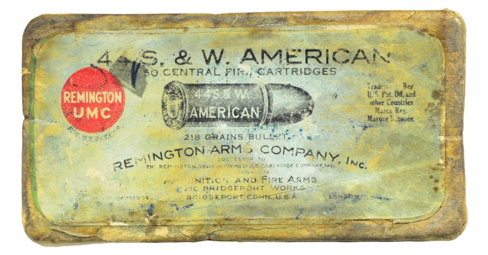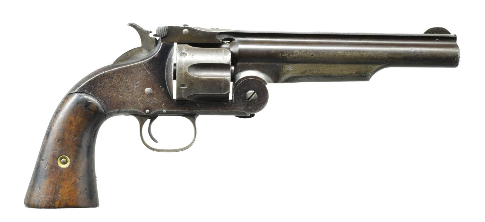 REVOLVER. Cal. 44 S& W. S# 15507. Bbl. altered to 6 1/4" w/ rib. Pinned semi circular blade front sight. 6 Shot fluted cyl. Top break action. Identifying features include the notch at top of the hammer & bump on each side of the frame above the trigger. Blue finish. 2 Piece walnut grips. UNATTACHED ACCESSORIES: modern wood shooter's box w/ red velvet interior. Top of lid marked w/ S& W logo. Full 50 rd. box of Remington UMC 44 S& W American ammo w/ 218 gr. bullets. 2 Piece green box shows discoloration, tattering w/ some portions of label missing. CONDITION: action retains blue in protected areas fading to gray showing light pitting. Bbl. has gray brown coloration w/ evidence of touch up finish. Grips show heavy wear w/ scratches & marks having sm. chips & some warpage creating grips around the front grip strap. Bore retains strong rifling showing scattered spots of pitting. The cylinder lock up is not solid & can be pushed off. (01-19872/DS). ANTIQUE. $2,000-3,000.