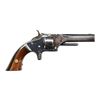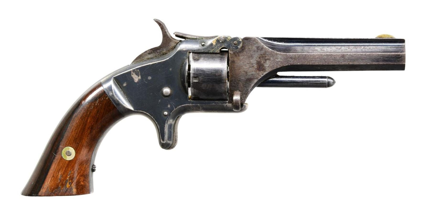 Cal. 22 S RF. S# 20917. Bbl. 3". Round brass blade front sight. Fixed rear sight. Mfg. 1860-1868. Blued finish. Smooth hardwood grips. CONDITION: hardwood grips have added varnish with scattered flaking and handling wear. Metal retains 50% blue with overall fading to gray and scattered oxidation. Hammer is stiff but functional when hand-cycled. Bore shows scattered pitting but evident rifling. (01-25270/MJC). ANTIQUE. $400-600.