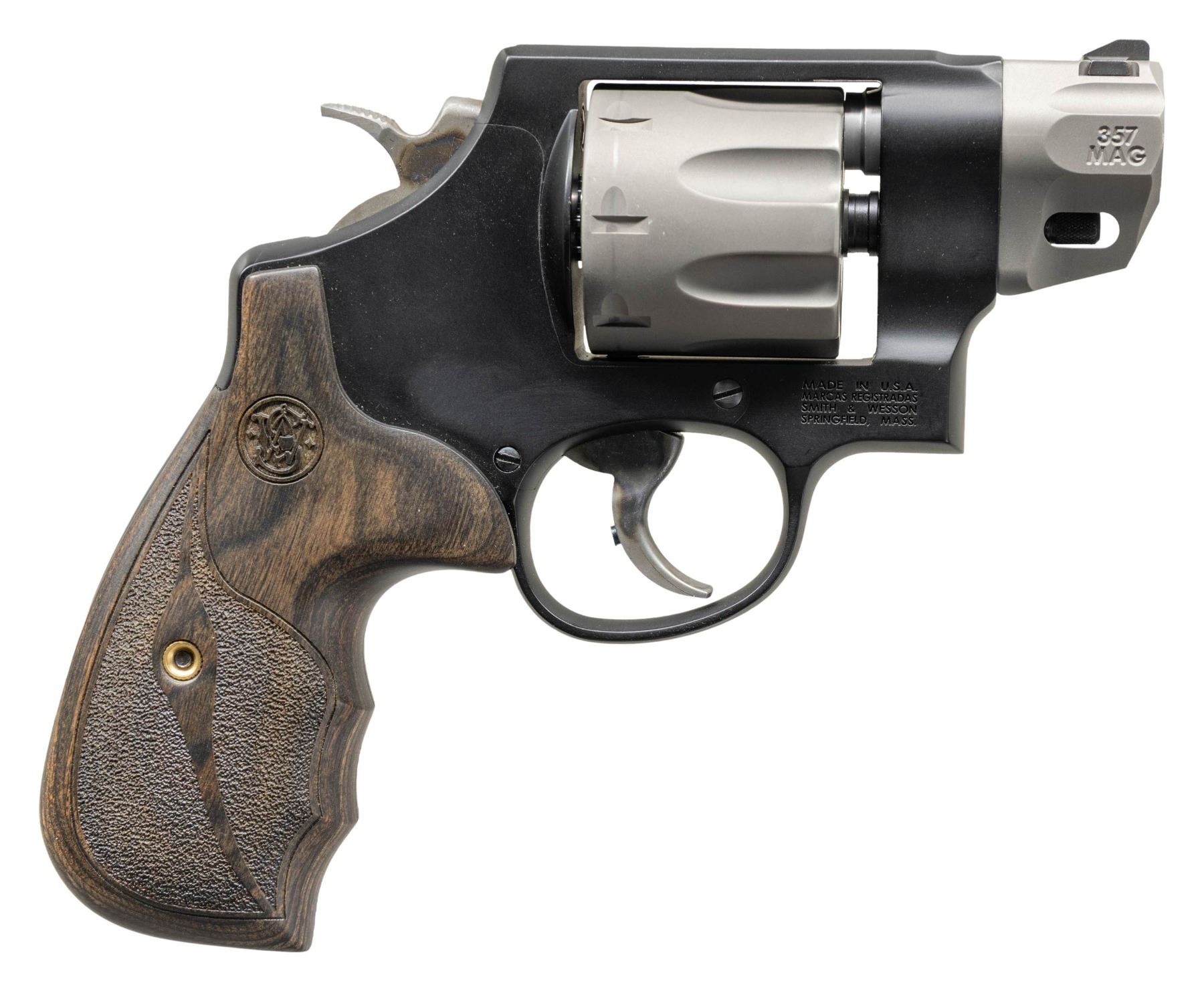 Cal. 357 Mag. S# DZF8588. Bbl. 2". Ramped blade front sight with orange insert. Fixed rear sight. 8-shot titanium cyl. Case colored hammer & trigger. Black finished scandium frame. Checkered hardwood grips with S&W logos. CONDITION: grips & metal show light handling marks & operational wear. Action functions properly when hand cycled. Bright near excellent bore. (25-4649/MJC). MODERN. $600-900.