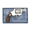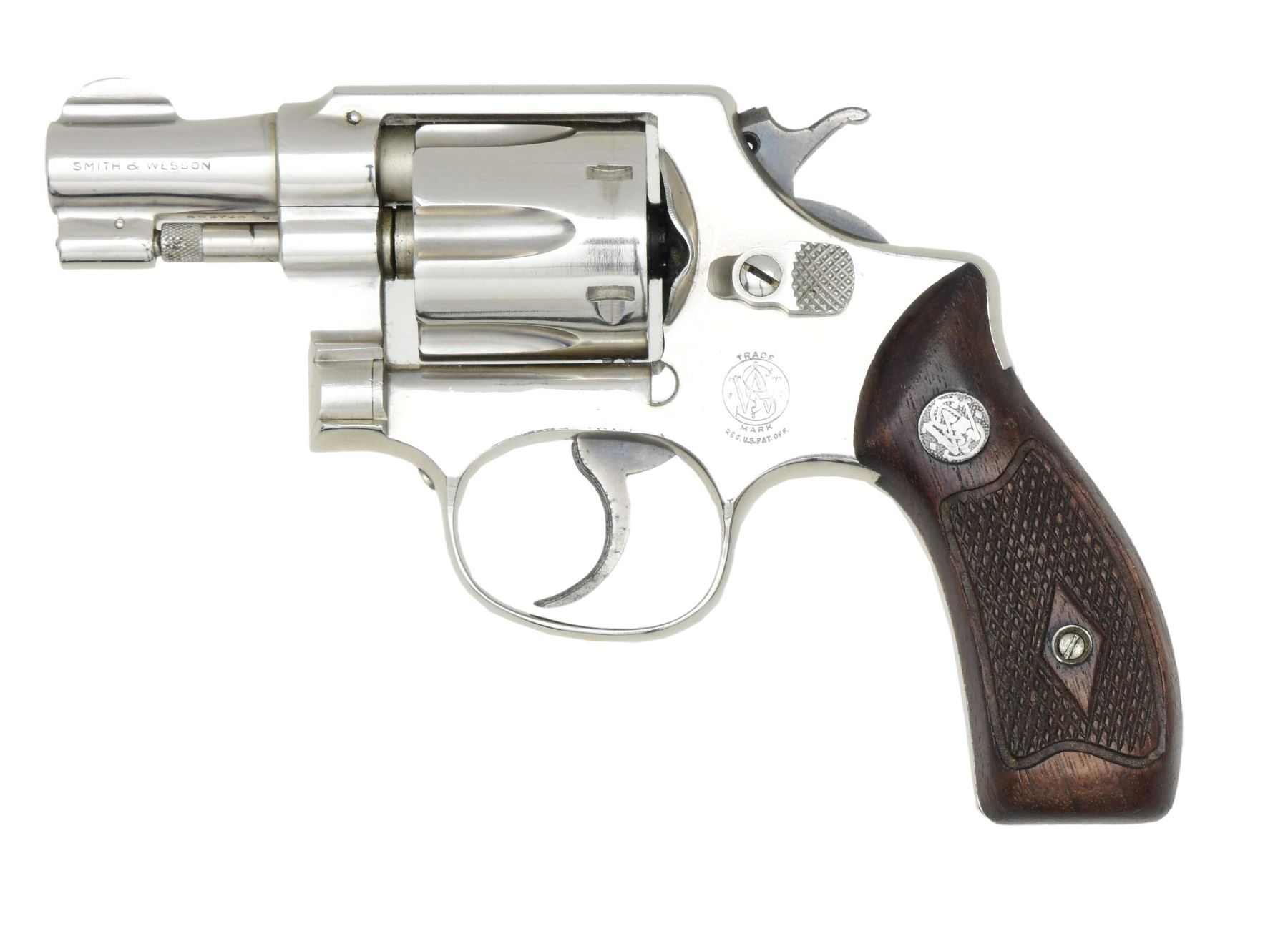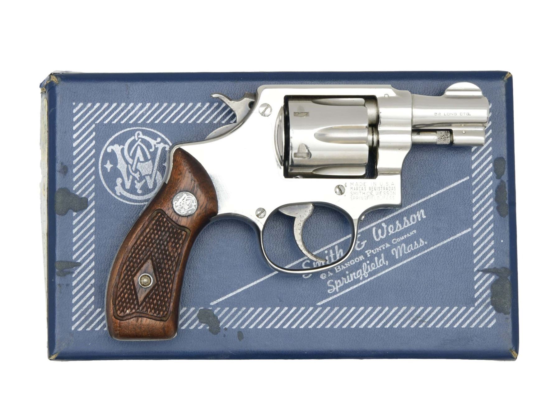 Cal. 32 Long. S# 596740. Bbl. 2", pinned. Round blade front sight. Fixed rear sight. Five-screw Pre Model 30 revolver. Six-shot cyl. Matching numbers on frame, cyl., bbl., extractor, and right grip panel. Nickel finish with case-colored trigger and hammer. Checkered walnut grips with silver S&W medallions. UNATTACHED ACCESSORIES: incorrect replacement S&W 36 box with paperwork. CONDITION: back of right grip panel shows a small crack; grips otherwise show a couple flattened checkering points and some handling wear. Trigger and hammer retain strong traces of case colors, with some fading to gray and oxidation mostly on trigger. Balance of metal retains 95-97% original nickel with a drag line on cyl. and some light handling wear. Action functions properly when hand-cycled. Very good+, bright bore. (24-5625/MJC). CURIO. $700-1,000.