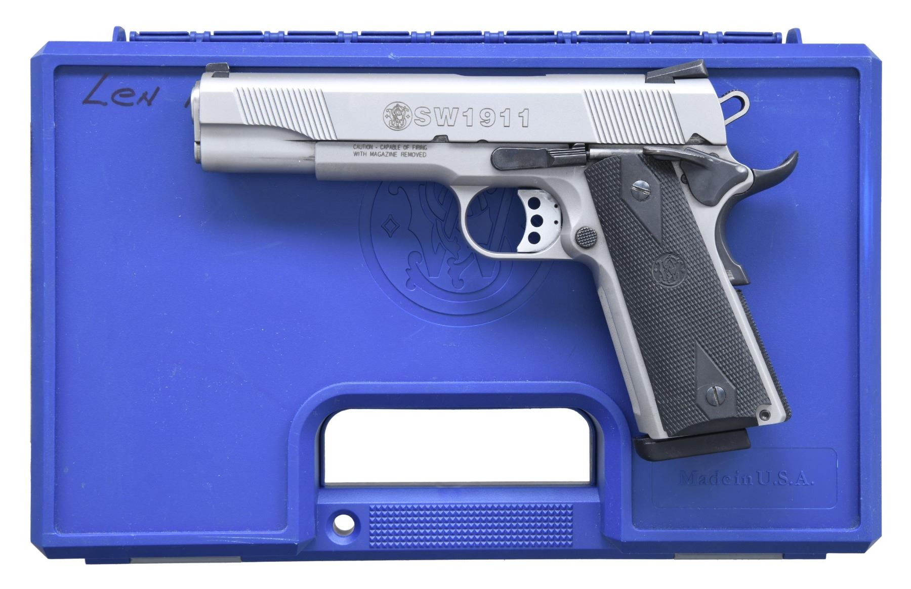 w/ CASE Cal. 45 ACP. S# JRD9389. Bbl. 5". Three dot sights with Novak's rear. Early production S&W 1911 pistol made 2003-2004. Extended beavertail grip safety. Extended right hand safety. Stainless finish with matte black small parts. Checkered black rubber grips with S&W monograms. MAGS: 2-7 rd. UNATTACHED ACCESSORIES: matching numbered factory hardcase with manual & fired case. CONDITION: grips & metal show some light handling & operational wear. Action functions properly when hand cycled. Bright near excellent bore. PROVENANCE: From the Lifelong Collection of George Staden S&W Member #3451. (25-190/MJC). MODERN. $500-800.