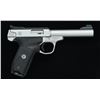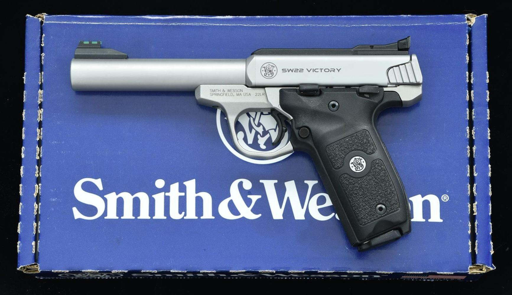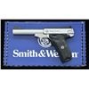 Cal. 22 LR. S# UEA2903. Bbl. 5 1/2". Yellow fiber optic front sight. Adjustable yellow fiber optic rear sight. Stainless finish. Black polymer grip frame w/ S&W logo. MAGS: 2-10 rd. UNATTACHED ACCESSORIES: matching numbered factory box w/ cable lock, picatinny rail, manual, right hand leather S&W holster, a boxed Volquartsen I-fluted stainless bbl. & a boxed Volquartsen Carbon Fiber Lightweight bbl. CONDITION: all aspects rate very good plus or better w/ some light handling wear. (23-5076/MJC). MODERN. $500-800.