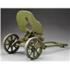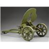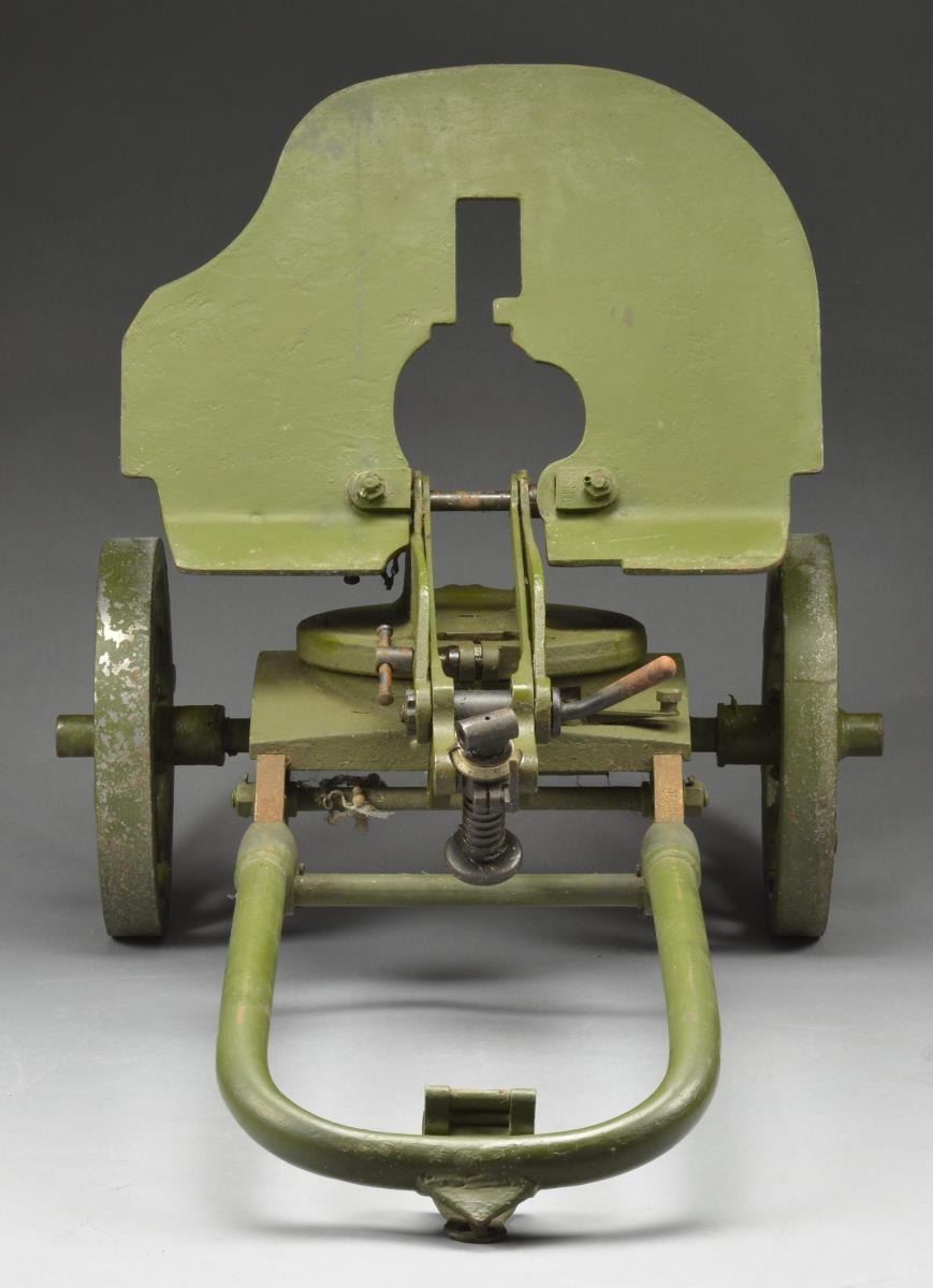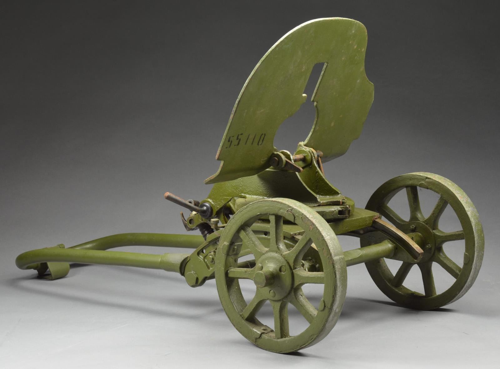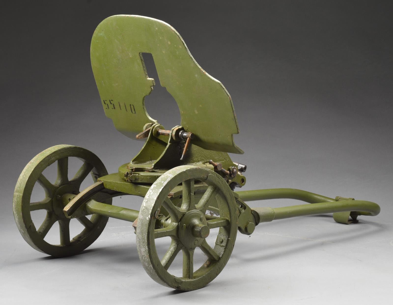 Sokolov wheeled mount w/ the original bullet shield armor plate stenciled in black w/ "55110". This mount was designed to be utilized w/ the Maxim M-1910 heavy machine gun. This system was utilized by the Imperial Russian Army during WW1 & the Red Army during the Russian Civil War & WW2. The 1910 Maxim was chambered in 7.62x54R & worked in conjunction w/ this armored, wheeled mount until it was replaced by the SG43 Goryunov in 1943. Interestingly enough, the SG43 also utilized the same armor mount. The mount is painted green paint which should be shielding the original materials from the forces of nature. CONDITION: cradle & mechanism moves & rotates freely. PROVENANCE: from the estate collections of Charles P. Obremski (02-16636/JZ). $300-500.