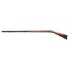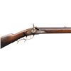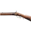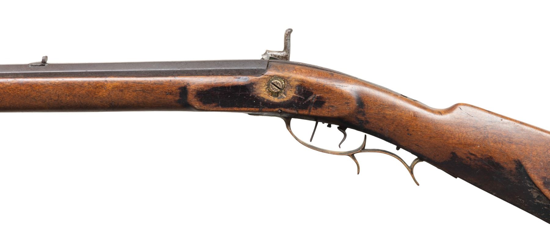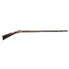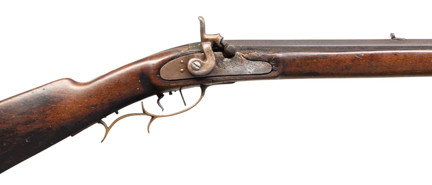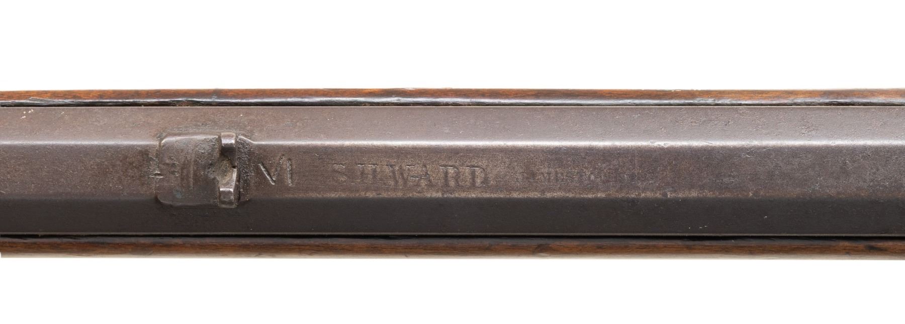 HALF STOCK PERCUSSION RIFLE. Cal. 45. NSN. Solomon H. Ward, so of James Ward, operated from 1865-1884 (death) in Jamestown, North Carolina. Oct. 41.5" w/ German silver blade front sight & notch rear sight. Top of barrel marked "VI S.H.WARD JAMESTOWN, N.C.". Bottom of barrel has iron underrib with 2 pipes holding replacement undersized hardwood ramrod. Poorly fitted percussion lock; dbl. triggers. Half stock pinned walnut stock w/ beavertail cheekpiece; brass furniture includes nose cap, thimble, finger curl triggerguard & crescent buttplate. CONDITION: barrel has dark brown corroded appearance with cleaning around maker's stamp. Lock has pitted cleaned gray appearance; appears mechanically fine when cycled by hand. Wood shows numerous dings & marks with pinned plate near hammer, cracks near lock screw & peeling finish around toeline. Dark pitted bore. (01-28303/MD). ANTIQUE. $500-800.