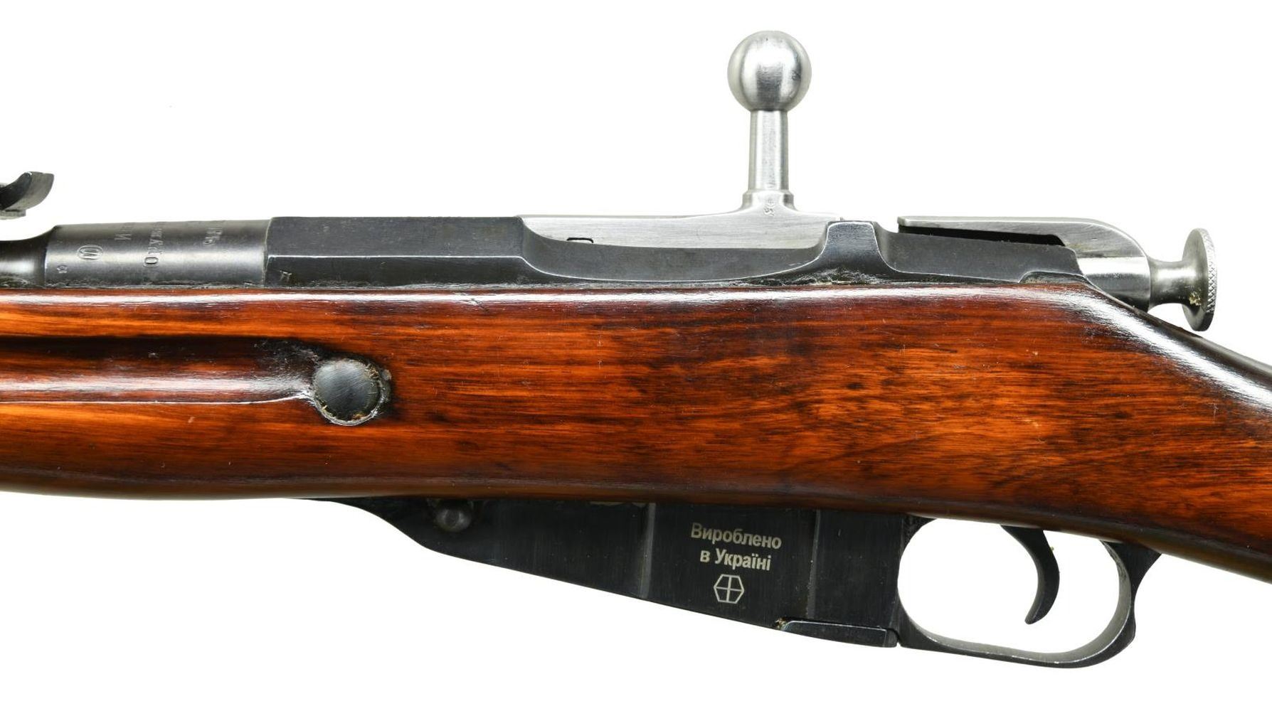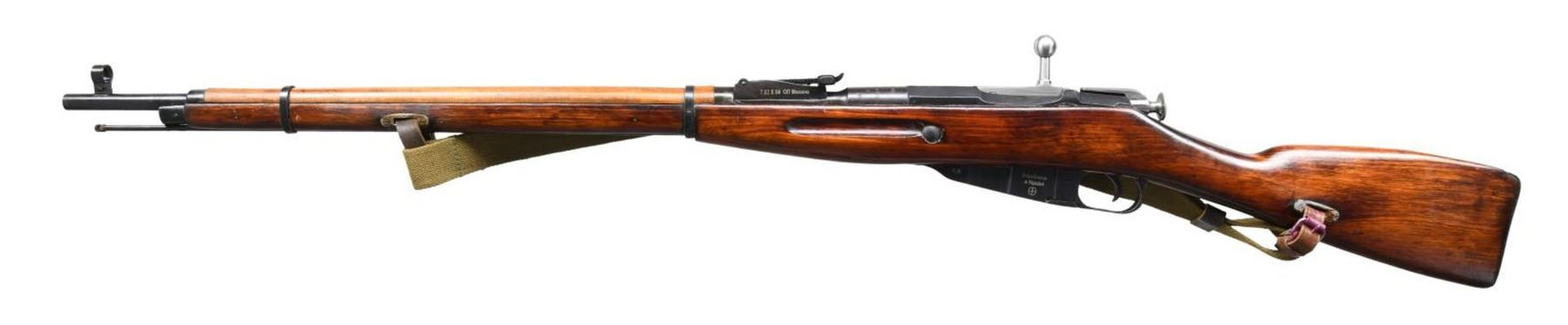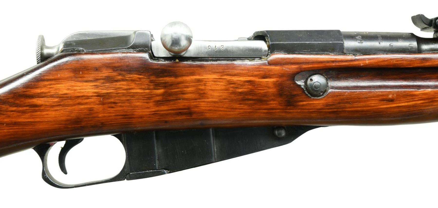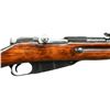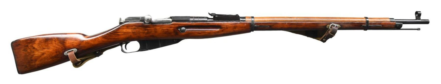 Cal. 7.62x54R. S# IOM3566. Bbl. 29" w/ import marking on top. Dragoon rifle that was arsenal converted to 91/30 config. All matching numbers as arsenal refurbished. Top of bbl. has Izhevsk markings w/ 1927 date & "Triangle 1" arsenal refurb making. Top of receiver has Izhevsk marking & importer added serial. Left side of rear sight base & mag body have importer added Cyrillic markings. Post front sight w/ hood. Tangent rear sight graduated to 2000m. Hardwood stock set w/ screw in sling slots & Com Bloc style sling. Cleaning rod present. CONDITION: arsenal reworked stock set has shellac finish w/ a couple armorer repairs, scattered light flaking & handling wear. Metal retains 95% arsenal rework blue. Inside of action & stock have a lot of cosmoline present. Good bright bore w/ some light pitting & frosting. (23-2692/MJC). CURIO. $400-600.