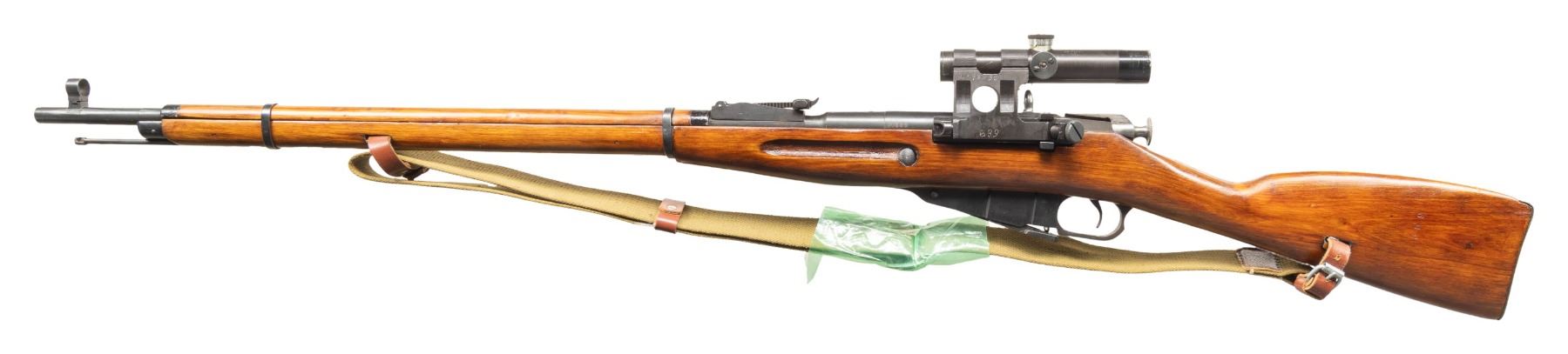 Cal. 7.62x54R. S# PI699. Bbl. 29" with Century import marking. Standard 91/30 sights. Rifle is equipped with an original Factory 357 PU scope on what appears to be an original mount that is electropenciled matching to both the bbl. shank & scope number. Scope has good optics & post reticle. Scope covers present. Bolt, left side of butt & floorplate have been both force matched to receiver likely arsenal done. Buttplate appears unnumbered. Bbl. has Tula star, 1944 date & sniper "CH" marking. Arsenal rework blue finish. Hardwood stock set with bottom mounted sling slots & canvas sling. Cleaning rod present. CONDITION: stock set has arsenal rework finish with scattered shellac wear, dings & handling marks. Metal retains 95% arsenal rework blue with some blued over pitting, light oxidation, fading ,handling marks & edge wear. Bolt functions properly when hand cycled but mag door will not shut & will require attention to fix. Very good bore with strong rifling. PROVENANCE: Paul Birkenstamm Collection. (25-6312/MJC). CURIO. $700-1000.