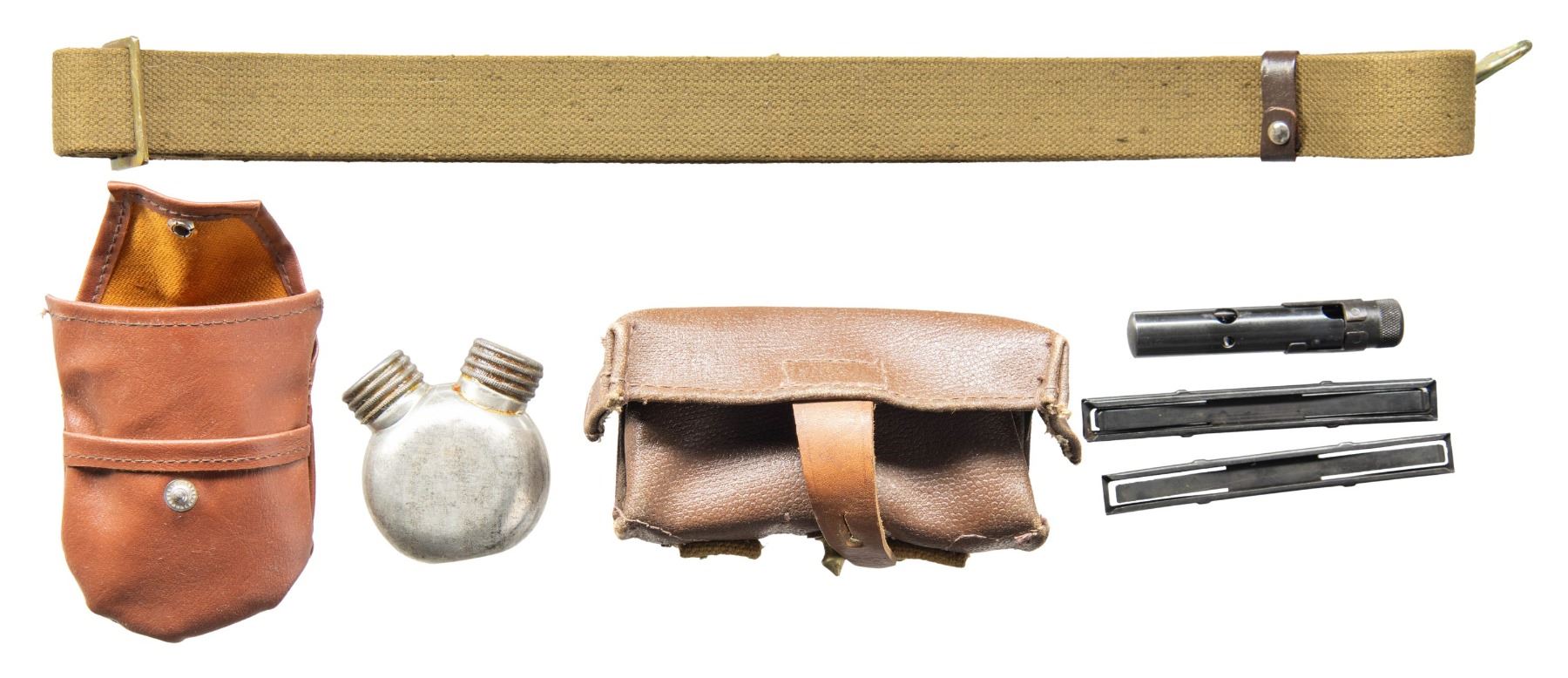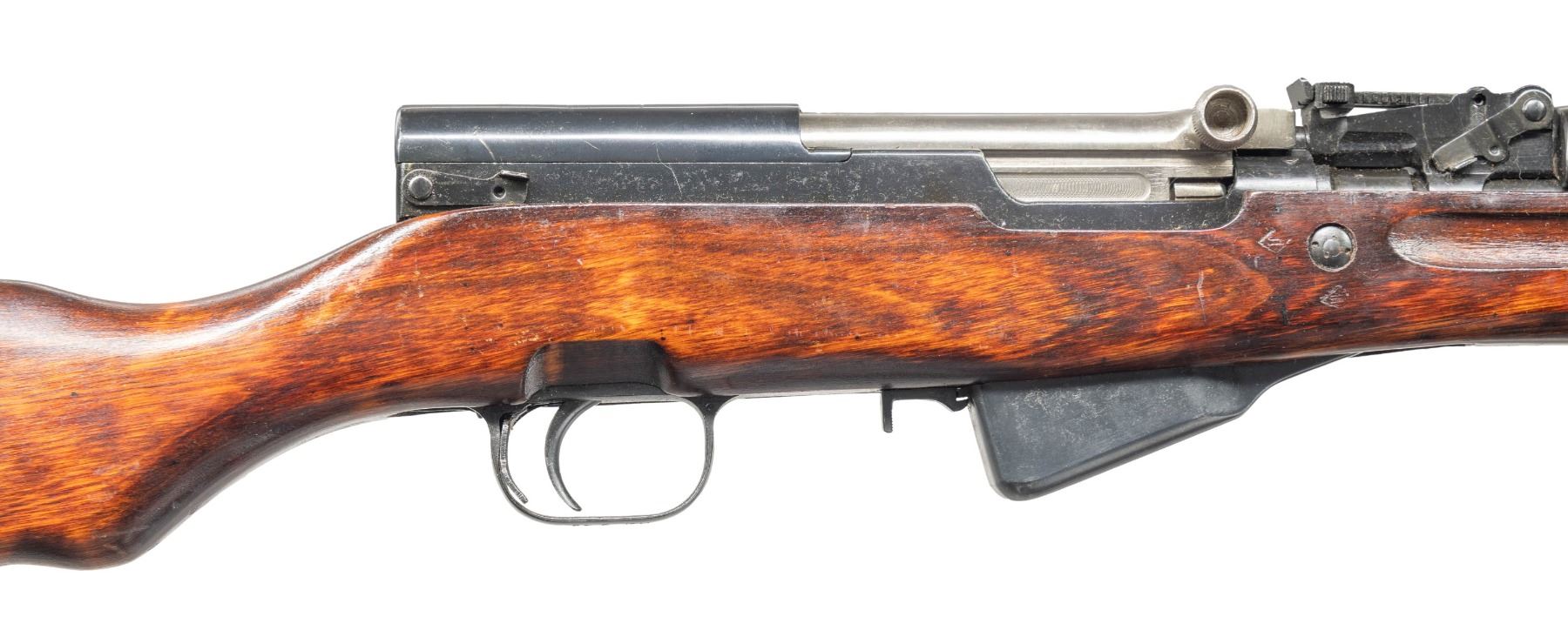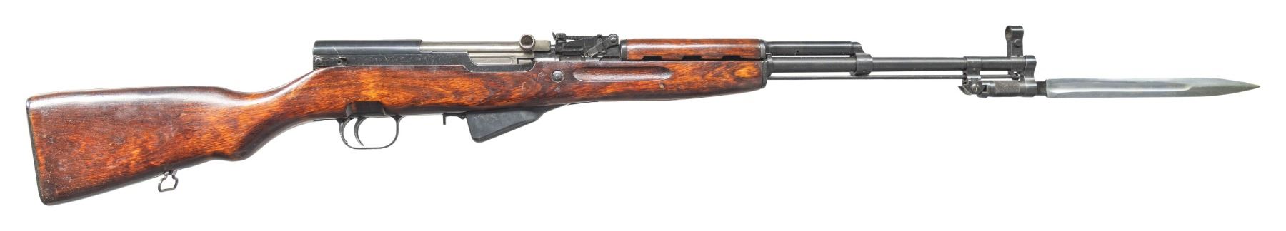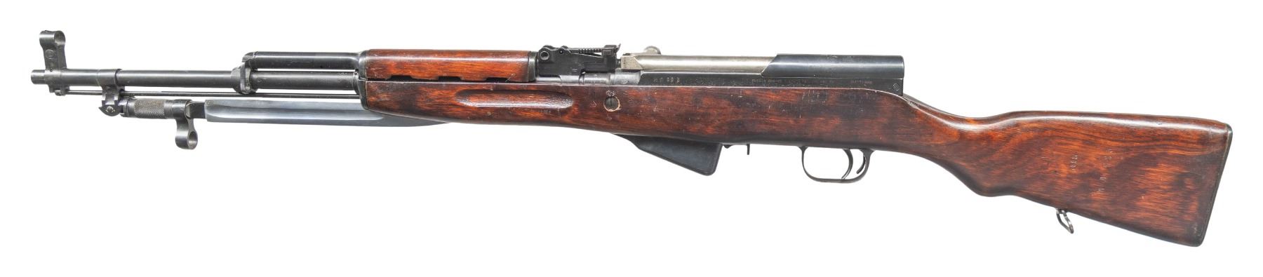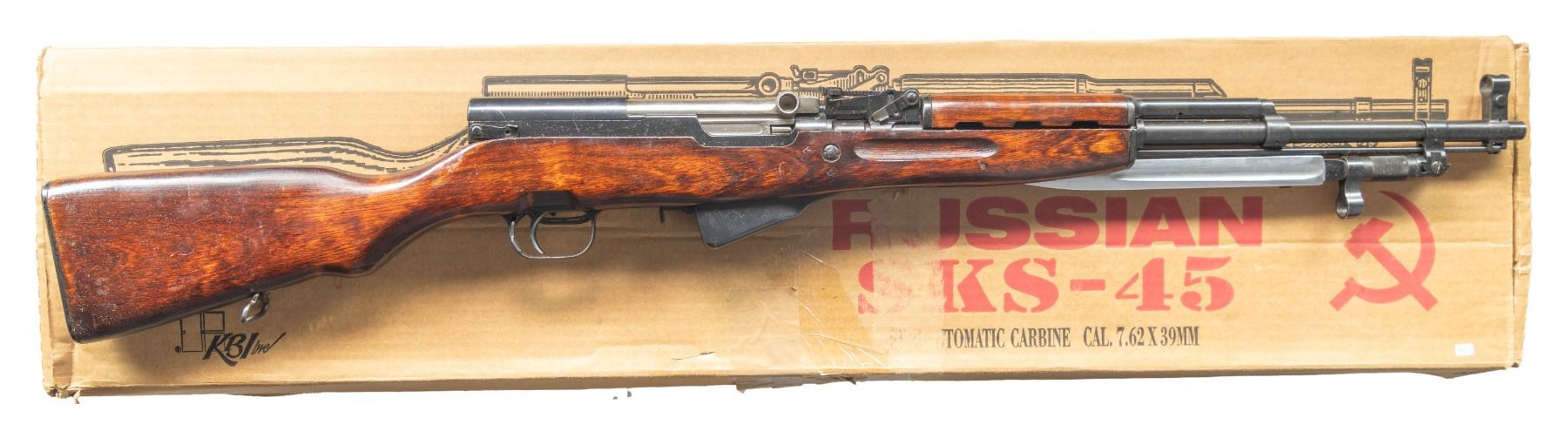 Cal. 7.62x39. S# RH231888. Bbl. 20 1/2". Standard SKS style sights with hooded front. All visible matching numbers. Top cover has Tula star & 1952 date. Left side of receiver has KBI import marking & importer added serial number. Arsenal blue finish. Hardwood stock set with bottom mounted sling swivels. Left side of butt has Tula star & 1952 date. Cleaning rod & blade bayonet present. UNATTACHED ACCESSORIES: matching numbered KBI SKS box with two pouches, canvas sling, oiler & three stripper clips. CONDITION: stock has arsenal rework finish with some handling marks, scratches & light wear. Metal retains 95% arsenal rework blue with some handling marks, operational & edge wear. Action functions properly when hand cycled. Bright near excellent bore. PROVENANCE: Estate Collection of John "Jack" Dhooghe. (25-5564/MJC). CURIO. $300-500.