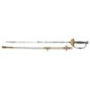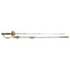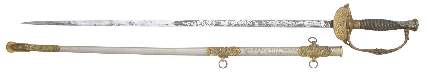 STAFF & FIELD OFFICER’S SABER. Overall length: 37 3/4". Blade length: 30". The etched blade has a raised medial ridge with etching over the first 16". Etching includes military, patriotic, and foliate motifs that include a large "US", furled American flags, and a spread-wing American eagle. The ricasso is etched "J.A. MERRILL & CO PORTLAND ME". Gilded brass hilt featuring an American eagle on the stationary guard and a spray of arms with a federal shield on the folding guard. Highly embellished knuckle bow with an eagle on the pommel. Wire-wrapped, silver grip. Gilded brass-mounted, plated scabbard. Mounts have intricate, pierced scrollwork. Scabbard is engraved "Lieut. M. F. Dooley. Co. F. 1st. Maine Regt. From his Maine Central. R. R. Friends." Michael Dooley served in the 1st Maine Regiment during the Spanish American War. Before and after the war, he was employed by the Maine Central Railroad, where he worked until his retirement. It is quite rare to find a sword from any period presented by a railroad. CONDITION: blade has a pleasing, light gray patina with bold etching. Hilt shows areas of original gilded finish mixed with a rich mustard patina. Scabbard also shows areas of original gilded finish with the same mustard patina. Plating is a bit dirty but appears complete. Engraved presentation is bold and easily read. (02-23326/BF). $400-600.