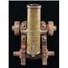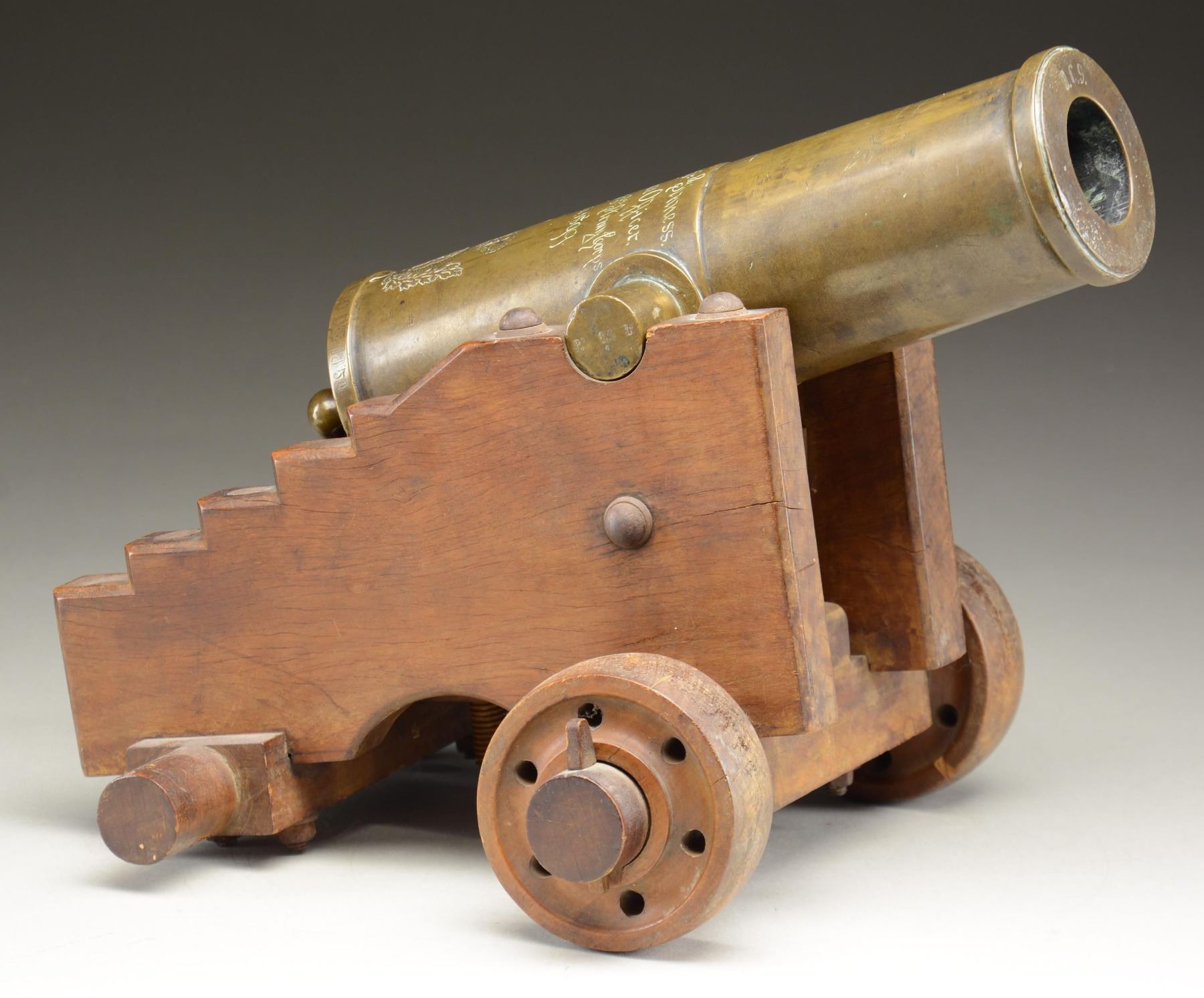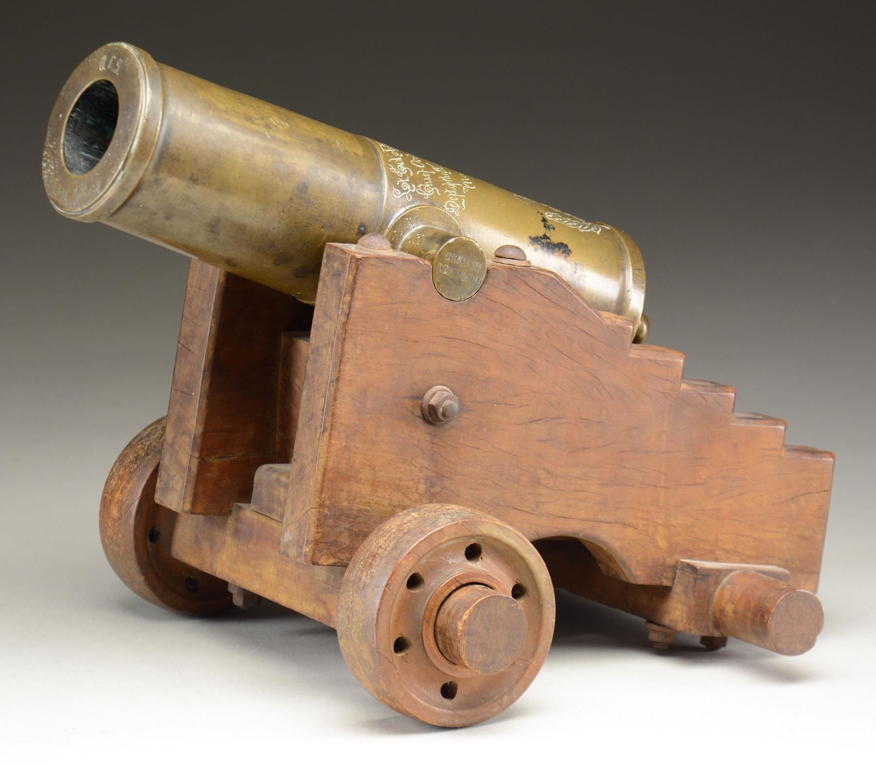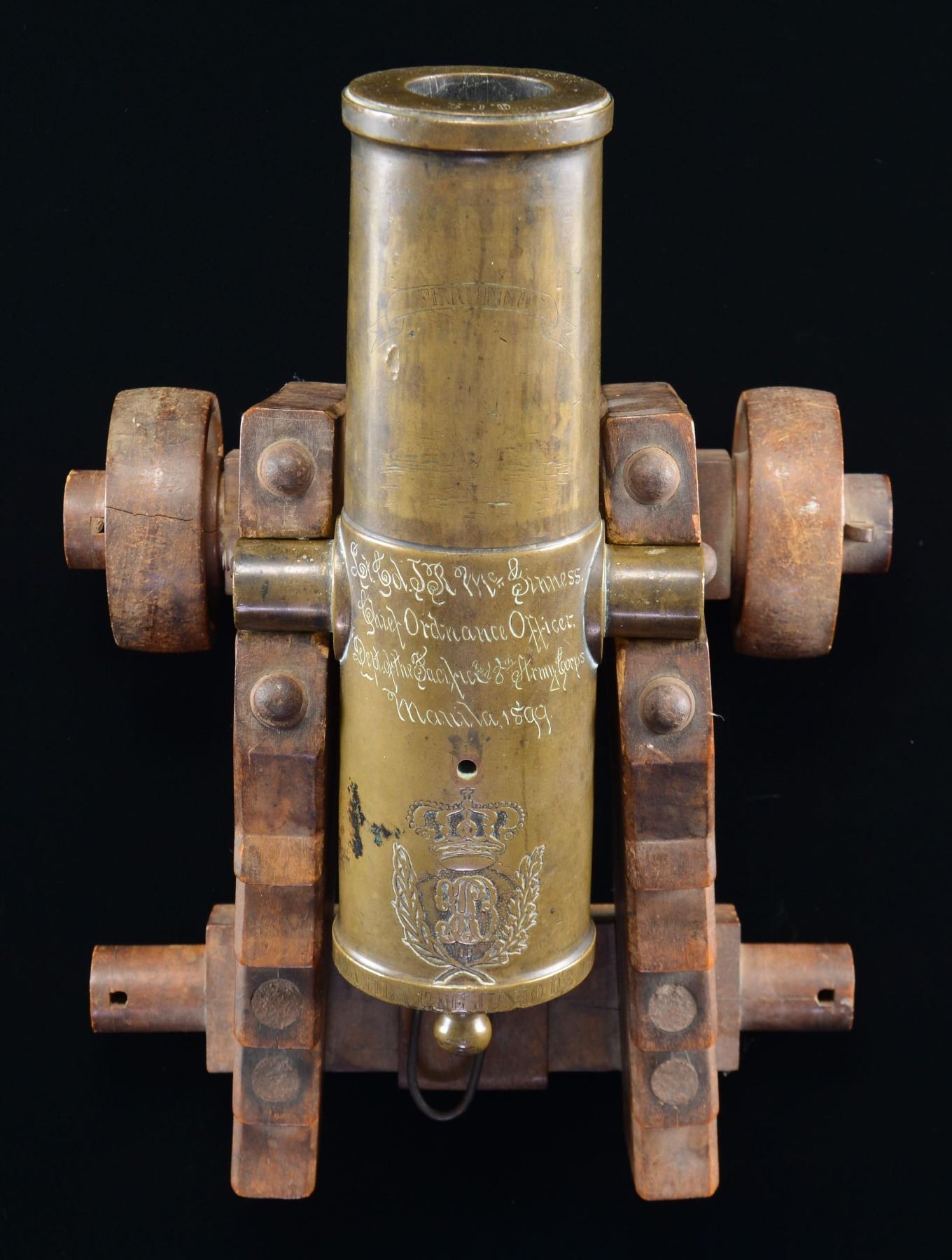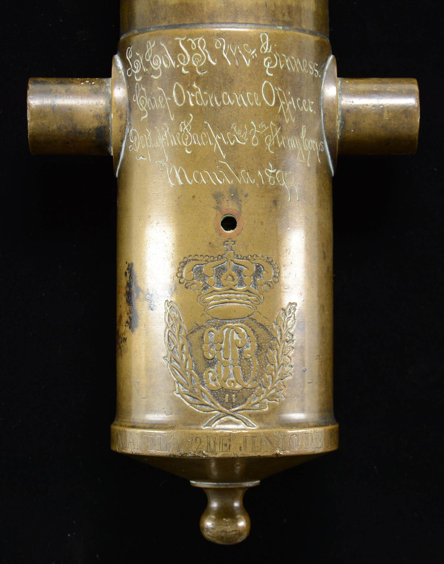 PRESENTED TO LT. COL. McGINNESS. This intriguing bronze cannon measures 12 1/2" in length, 3 1/4" across the muzzle with a 1 3/4" bore, and 6" across at the trunnions. The most prominent original marking on the cannon is a crowned royal cipher just above the base ring and below the vent. The base ring is engraved "MANILA 12 DE JUNIO DE 1851." The neck of the cannon has an engraved riband that reads "FIRRUFINO," which is likely a tribute to Julio Cesar Firrufino, a 16th/17th century engineer and mathematician who was a master artillerist and Chair of mathematics and fortifications at the University of Madrid. He wrote several books and publications relating to artillery, mathematics, and the use of fortifications in the first half of the 17th century. The left trunnion is marked "BRONCES REFUNDIDOS," which translates to "RECAST BRONZES." The other trunnion is marked "P.o 23 Ls". The lip of the cannon is marked "O.C.9." Perhaps the most fascinating part of this cannon is the engraved presentation between the trunnions that reads "Lt. Col. J R McGinness. Chief Ordnance Officer. Dept. of the Pacific and 8th Army Corps Manila, 1899." This cannon was obviously presented to McGinness during the Spanish American War. John R. McGinness graduated from the Military Academy in June of 1863. He saw service during the Civil War and was breveted for gallant and meritorious service. He served with distinction in the military for many years, rising to the rank of Lieutenant Colonel. Lt. Col. McGinness was appointed Chief Ordnance Officer of the Department of the Pacific and the 8th Army Corps on December 31st of 1898. He served at this post until April of 1901 and ultimately retired from active service in 1904 after 45 years in uniform. The cannon is mounted on what is likely a 19th century naval carriage with wooden wheels on the front. The wheels on the back are missing. CONDITION: the cannon is quite solid and has a pleasing, early patina. Marks and engravings are easily read and well executed. The carriage remains quite solid, with a few scuffs and scrapes to the wood. PROVENANCE: From the Collection of a Tennessee Gentleman. (02-23042/BF). $6,000-8,000.