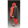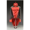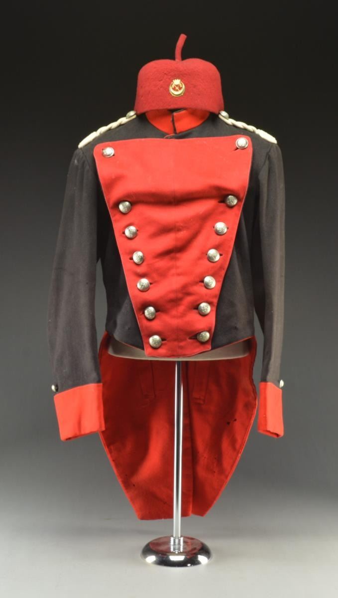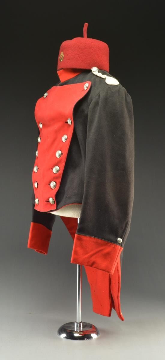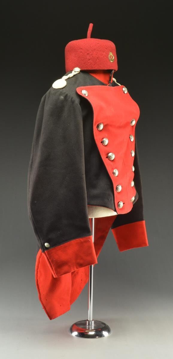 A good example of a 1930s era Spanish 1st Guard Cavalry dress uniform. Uniform is black & red w/ silver colored buttons bearing a shield superimposed by "GC". White braided shoulder knots. Tails bear the embroidered Arms of Castille castle & rampant lion. Uniform also includes an unassociated Spanish red fez with a crown over crossed lances & crescent insignia on the front. CONDITION: uniform shows scattered moth tracks but remains solid. All buttons are present as is the tail insignia. Collar insignia are missing. Fez shows scattered moth damage but remains solid. (02-16354/BF). $200-400.