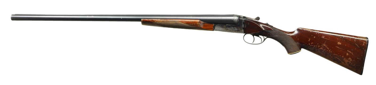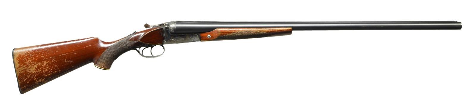 Cal. 12 Ga., 3". S# 26223 (1972). Bbls. 27 3/4", have raised matted rib & bright front bead. Full & Mod chokes. Case hardened boxlock action w/ light floral & scroll engraving featuring dbl. triggers, extractors & automatic safety. Matching numbered beavertail forearm & pistol grip stock. LOP:14" & 13" to basket weave buttplate. WEIGHT: 6.27 lbs. CONDITION: good lightly faded blue has spots of finish loss along w/ peppery oxidation & marks throughout. Good vibrant colors w/ silvering to gray on bottom metal & edges. Wood has fair finish showing large portions missing along w/ impressions & small cracks throughout. Bottom of forearm has large crack extending from forearm iron w/ screw repair on right side. Fair buttplate. Good shiny bores w/ fouling. (23-538/MD). CURIO. $300-500.