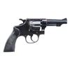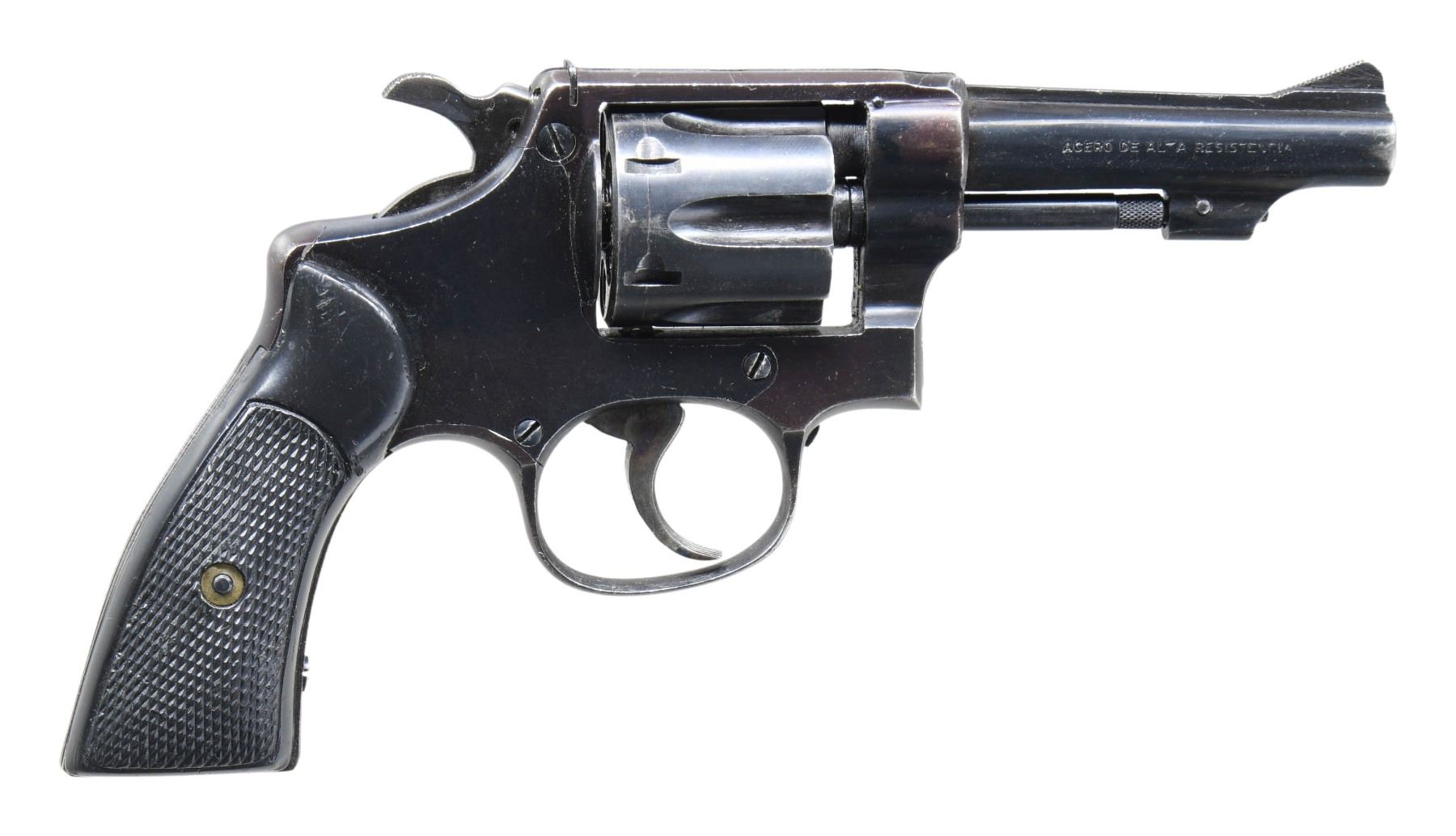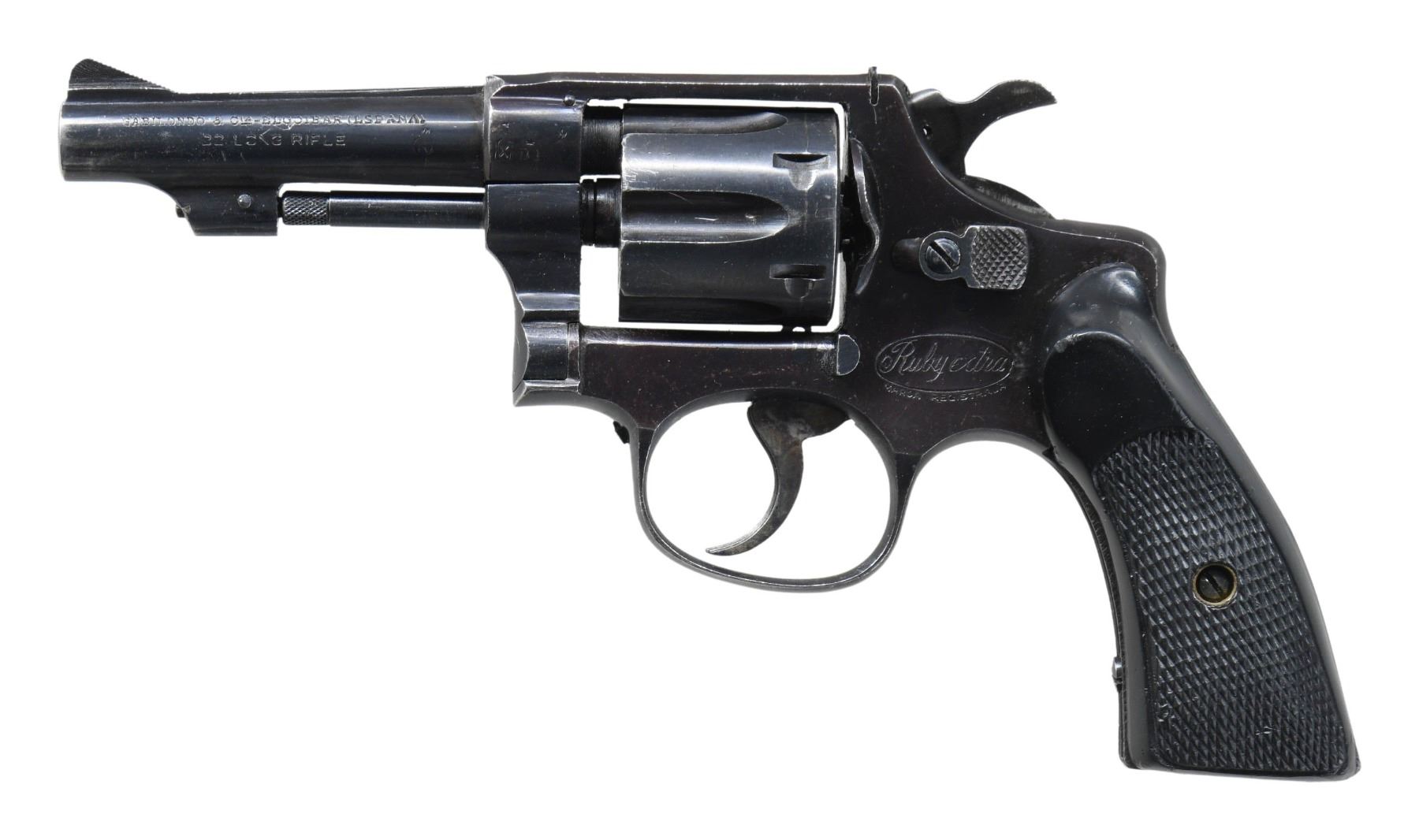 REVOLVER. Cal. 22 LR. S# 555930. Bbl. 3 1/4". Ruby Extra double action revolver mfg. in Spain byy Gabilondo & Cia circa. 1955-1970. Left side of the bbl. is marked with mfg. information above the cal. designation, with "ACERO DE ALTA RESISTENCIA" marked on the right. Left side of the frame is marked with Spanish proof and "Ruby extra" in script. Metal components exhibit a blue finish overall, save for on the trigger and hammer, which are case colored. Frame is fitted with 2-piece checkered black synthetic thumbrest grips. Frame and bbl. feature a matte grooved top strap, with a serrated ramp front sight and square notch rear sight. CONDITION: metal components retain large amounts of their original factory blue finish, showing some areas of wear and thinning and scattered superficial handling marks overall. Very bright bore, exhibiting a few small spots of pitting, while retaining well defined rifling throughout. Proper manual mechanics in SA and DA. Grips show some smoothing and scattered marks from handling and storage, but otherwise remain sound. (25-2699/MLW). CURIO. $200-300.