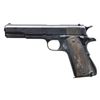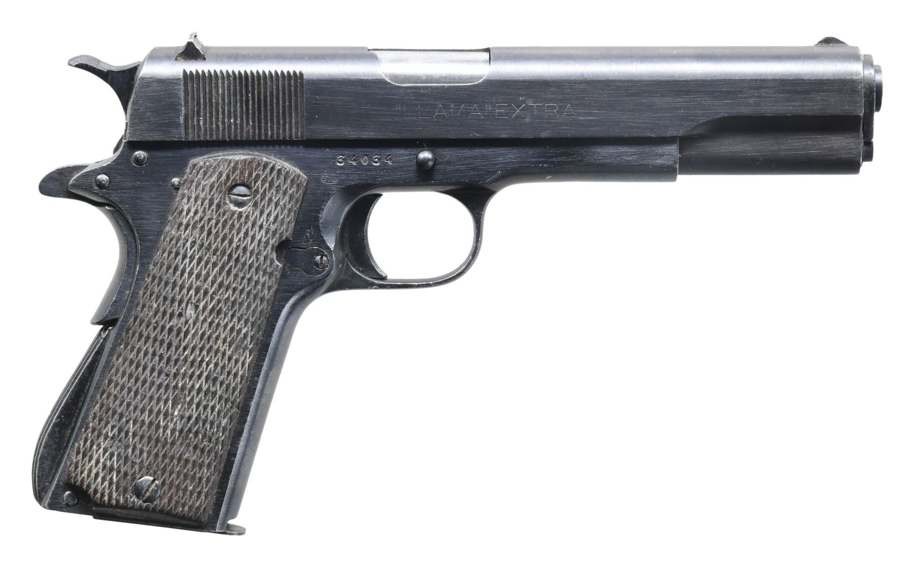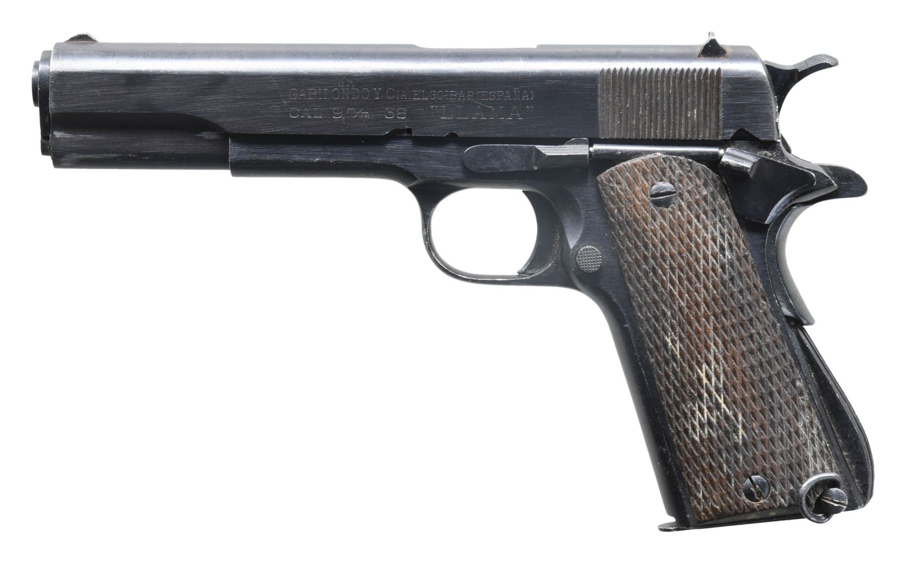 PISTOL. Cal. 9x23mm Largo. S# 34034. Bbl. 5 1/2". Llama Special semi-automatic pistol mfg. in Spain by Gabilondo Y Cia. Left side of the slide is marked with Gabilondo's mfg. information above the cal. designation and "LLAMA", with "LLAMA" in quotes followed by "EXTRA" marked on the right. Right side of the frame is marked with the S# above a small oval cartouche. Metal components exhibit a blue finish overall, save for on the chamber area of the bbl., which is polished in-the-white. Frame is mounted with 2-piece checkered wood grips and features a lanyard ring on the left side at the butt. All serialized parts are matching and include the frame, slide catch lever, slide, bbl. bushing, and bbl. MAGS: 1 8-rd. CONDITION: metal components retain the majority of their blue finish, showing light edge wear, scattered superficial handling marks, and some scattered spots of light surface oxidation. Relatively bright bore, exhibiting consistent light to mild pitting, while retaining strong rifling throughout. Proper manual mechanics. Grips show some wear and smoothing, but otherwise remain sound. (25-5060/MLW). CURIO. $300-500.