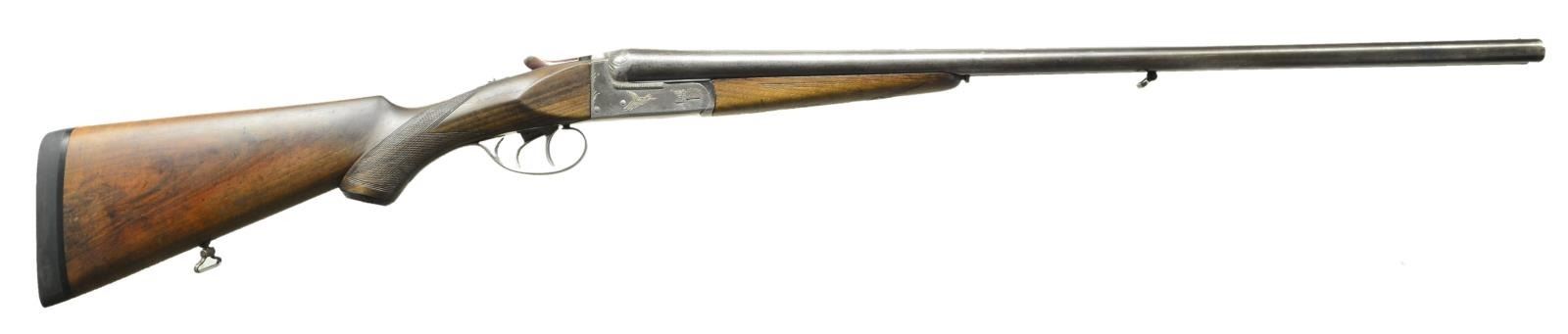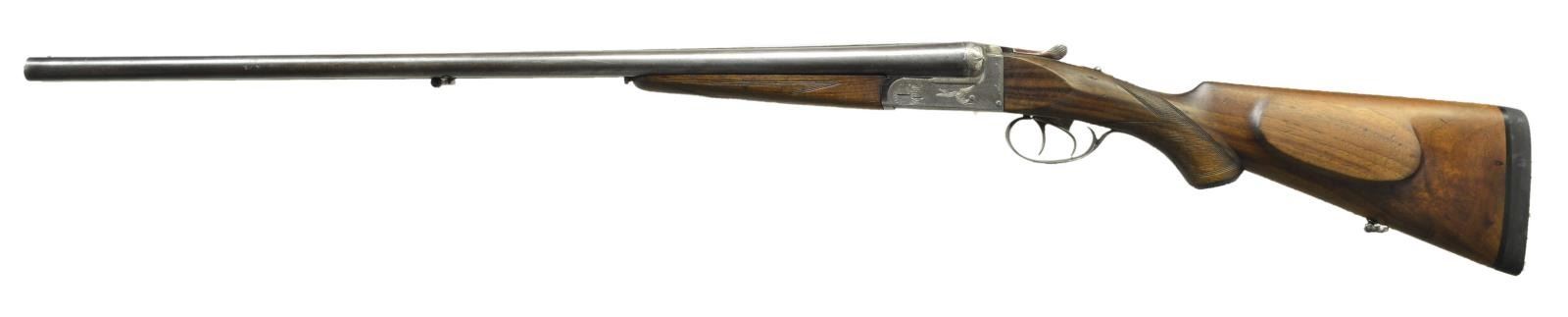 Cal. 16 Ga. S# 1628. Bbls. 27 5/8" w/ matted solid rib & steel front bead, choked “FULL” & “FULL”. Matching S#s, dbl. triggers & extractors. Tastefully engraved frame w/ moderate scroll on fences & bird in flight either side & light scroll on belly. Checkered splinter forend w/ ebony capped semi pistol grip buttstock, raised cheek rest, sling swivels & 14" & 14 7/8" LOP to added Pachmayr recoil pad. Importer marked. UNATTACHED ACCESSORIES: black plastic case. CONDITION: metal is a blue/gray patina w/ frame a gunmetal gray. Scattered dings, light rust & pinpricks of pitting. Stock set has been sanded leaving checkering nearly smooth & scattered dings. Bores are quite bright w/ streaky residue breech end & light pitting mid bore. PROVENANCE: "Save the Fine Guns". T&G German Gun Imports, bringing fine German guns to a more appreciative market. (22-5122/CW). MODERN. $300-500.
