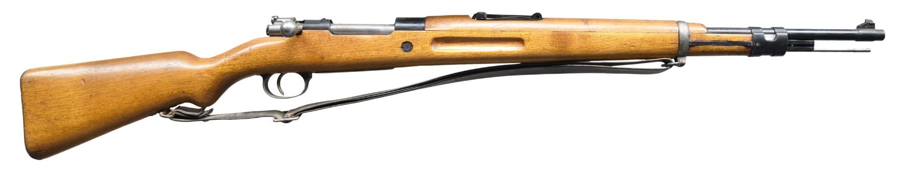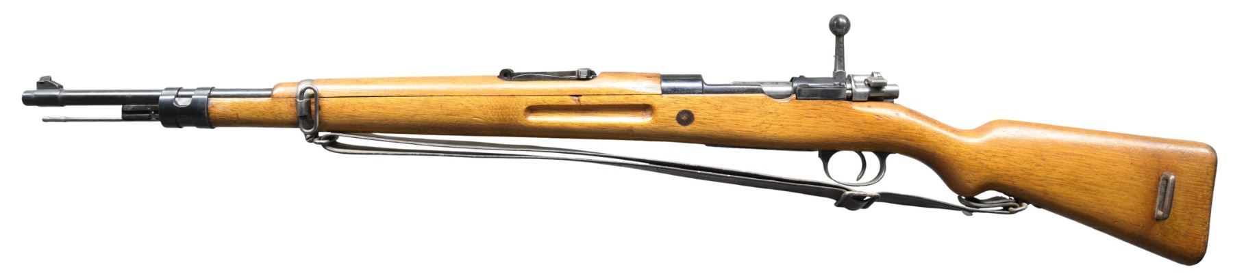 Cal. 8mm Mauser. S# W1455. Bbl. 24". Blade front sight. Tangent rear sight graduated to 2000m. All visible parts are matching to receiver. M43 Spanish Mauser with Civil Guard crest. Arseanl rework type blue finish. Hardwood stock set with bottom mounted sling swivels, leather sling & additional left side sling swivels. Rifle has a standard Mauser bayonet lug not the Ricchieri style. Cleaning rod also present. CONDITION: refinished stock set shows a few cracks at rear of handguard, a shallow chip on left side above grasping grooves, some dings & handling marks. Metal retains 60% arsenal rework type blue with bottom metal & rear band being a gray patina, some blued over pitting, scattered oxidation, dings, handling marks & edge wear. Action functions properly when hand cycled. Worn bore with scattered frosting. (25-3845/MJC). CURIO. $300-400.