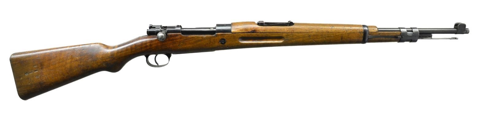 SHORT RIFLE. Cal. 8mm Mauser. S# EA31383. Bbl. 23 5/8". S# matches on receiver, bolt, trigger guard & floorplate. These rifles were mfg. by Spain at La Coruna Arsenal, for the Spanish Air Force. Receiver ring marked w/ the Spanish Air Force eagle crest. Receiver range additionally marked on left side w/ "cal. 7.92". Straight bolt handle. Tangent rear sight graduated to 2000m. Inverted V front sight w/ protective ears. Cleaning rod & bayonet bar are present. All milled furniture. Provision for side sling. Walnut stock & handguard. Buttstock marked underneath w/ acceptance marks; No. on right side of butt "110" over "10". Has additional scratched name "Daniel P". CONDITION: original finish stock set w/ wear staining & handling marks throughout. Metal has 70% thinning, worn original finish. Shiny bore w/ lightly worn lands. PROVENANCE: Estate Collection of Kenneth Horn (Grandson of JC Higgins). (22-415/RW). CURIO. $300-500.
