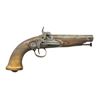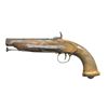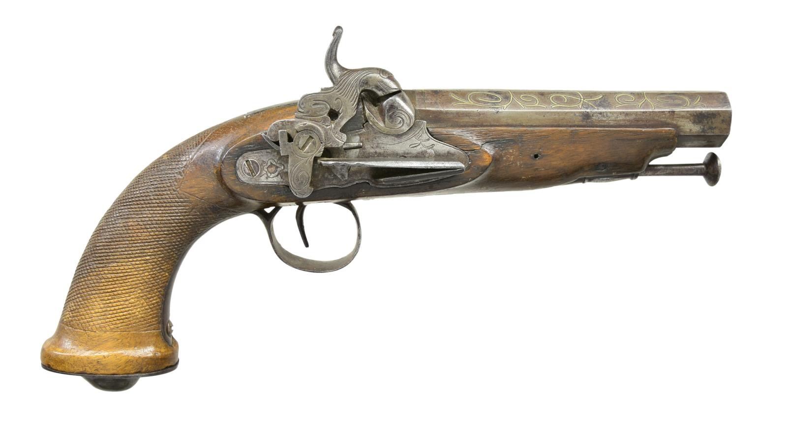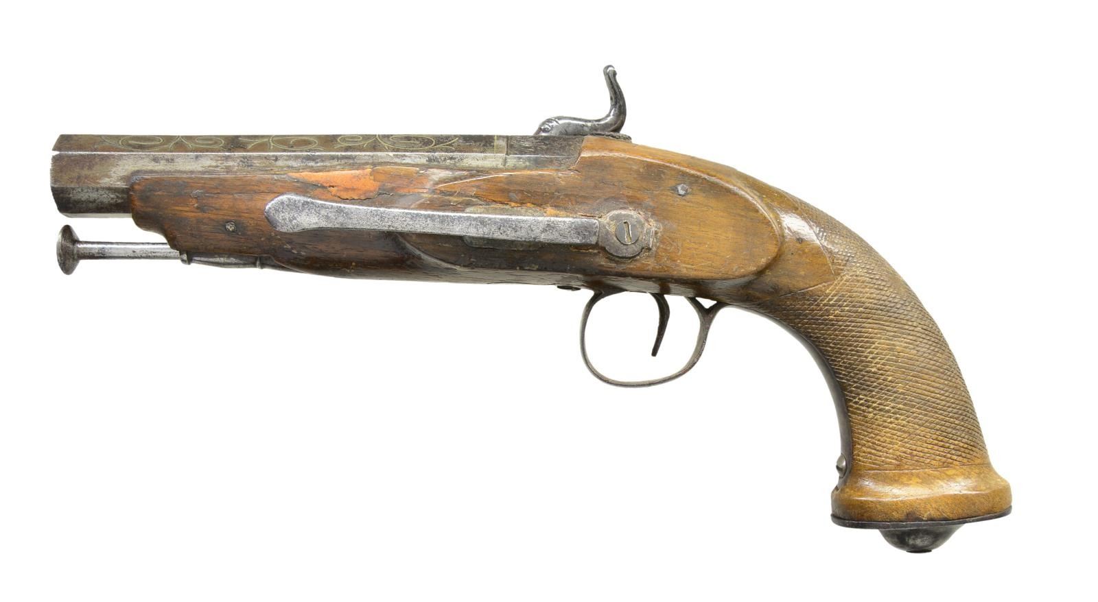 PISTOL. Cal. 70. NSN. Mfg. in Eibar, Spain circa 1830's. Oct. 4 3/4" bbl. has German silver scroll & "PEDRO GUISASOLA." Hardwood stock w/ checkered grip, belt hook on left side. Iron tulip tipped ramrod, thimble, trigger guard & buttcap. CONDITION: bbl. has faint traces of blue; balance brown gray patina showing heavy pitting around nipple, along with light pitting & marks throughout. Stock has worn finish & checkering, large repaired chip & break on left side partially hidden by hook, along w/ sm. chips & cracks throughout. Dark heavily pitted bore. (01-23080/MD). ANTIQUE. $500-750.