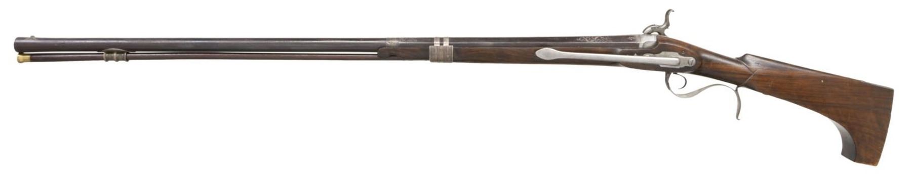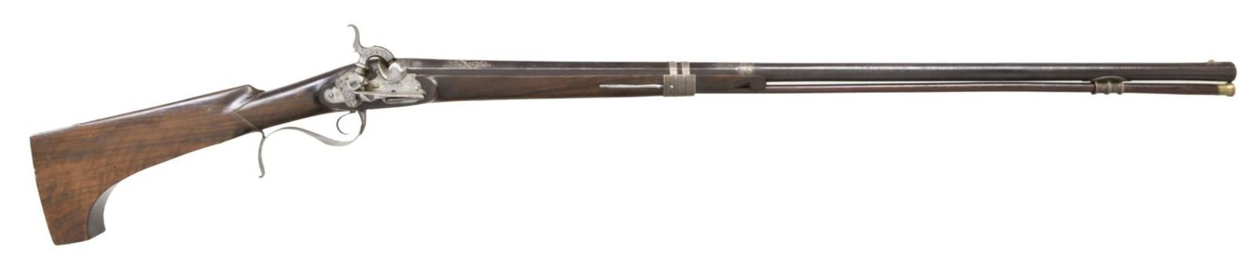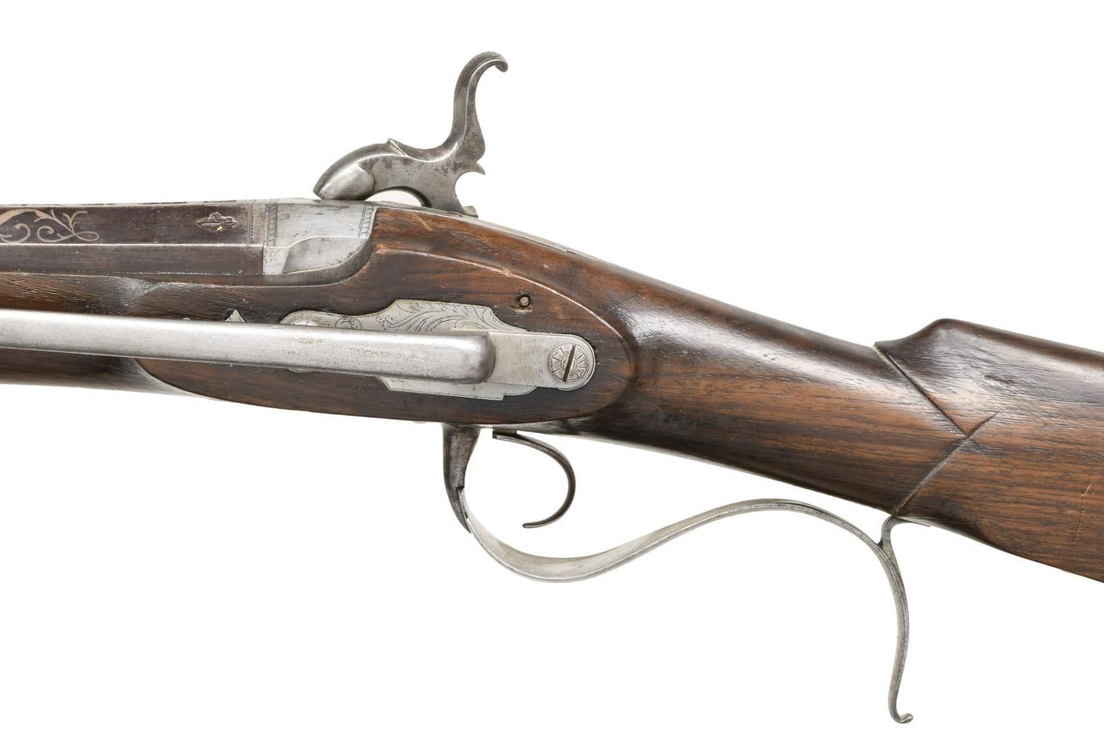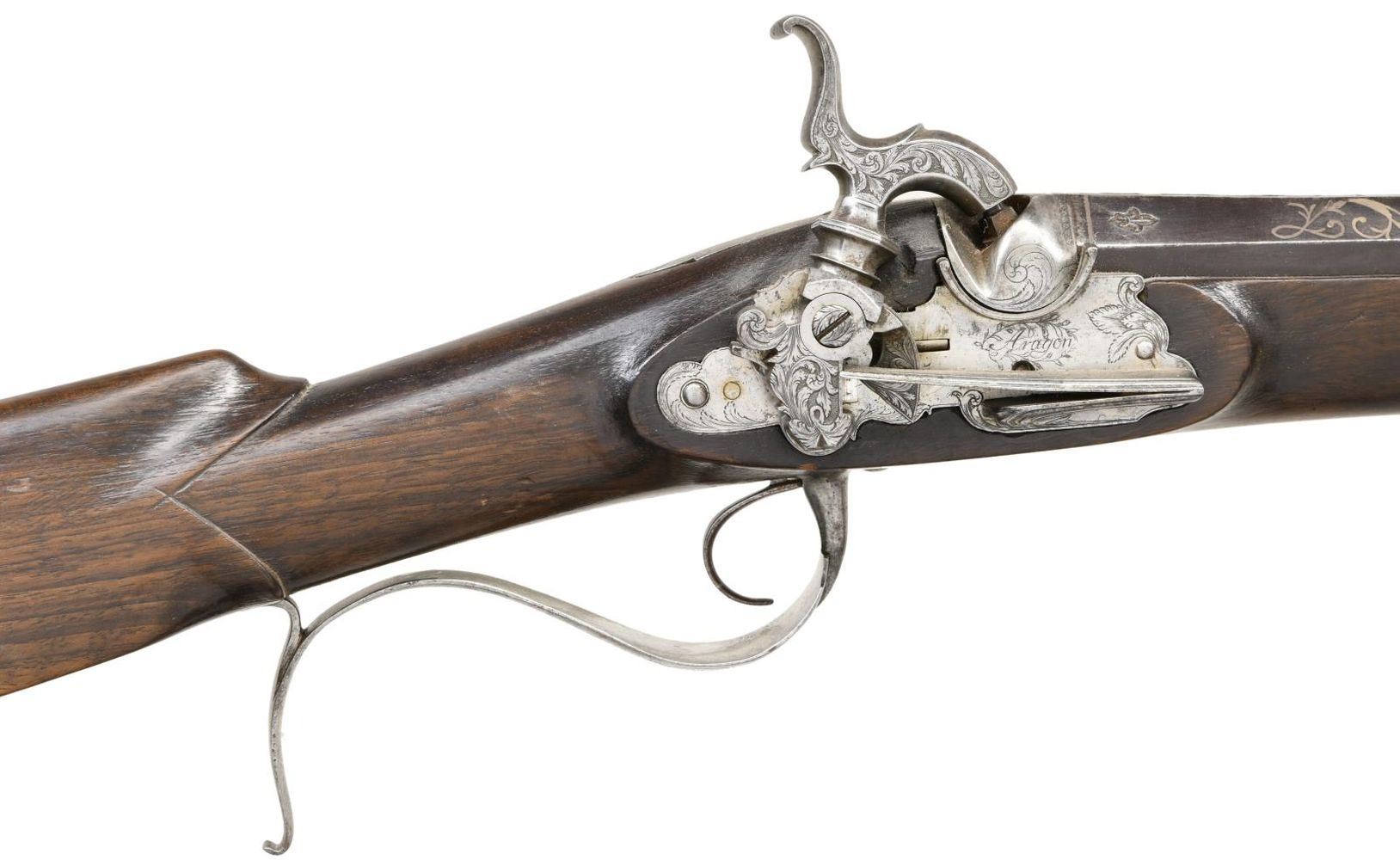 Cal. 75. NSN. Bbl. 36" part-oct part-rnd. Silver blade front sight. Rear of bbl. has three Fleur De Lis markings, a cross marking, a lion shield & a faint crown marking. Bbl. also marked "EIBAR 1818" & has floral decorations. Lock marked "ARAGON" for the Spanish gunmaker. Hammer & lock have floral engraving. Hammer appears functional. Hardwood half-length stock w/ 8" side clip. Brass tipped ramrod secured by one band & a silver pipe. CONDITION: stock shows scattered dings & handling wear from the years. Bbl. is a dull gray patina w/ scattered oxidation & some light pitting. Balance of metal appears cleaned long ago w/ some scattered oxidation & pitting. Smoothbore shows some scattered oxidation but is generally good. PROVENANCE: from The Collection of James B. Taylor. (01-23881/MJC). ANTIQUE. $1,500-2,000.