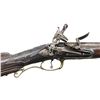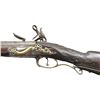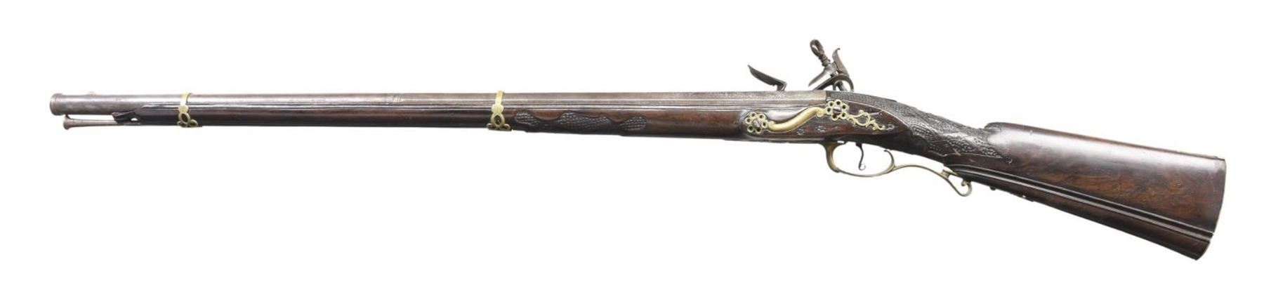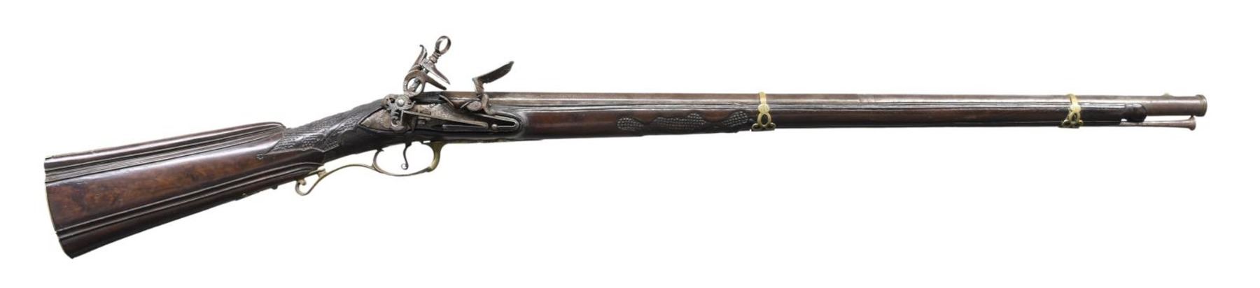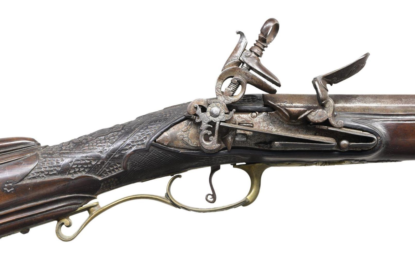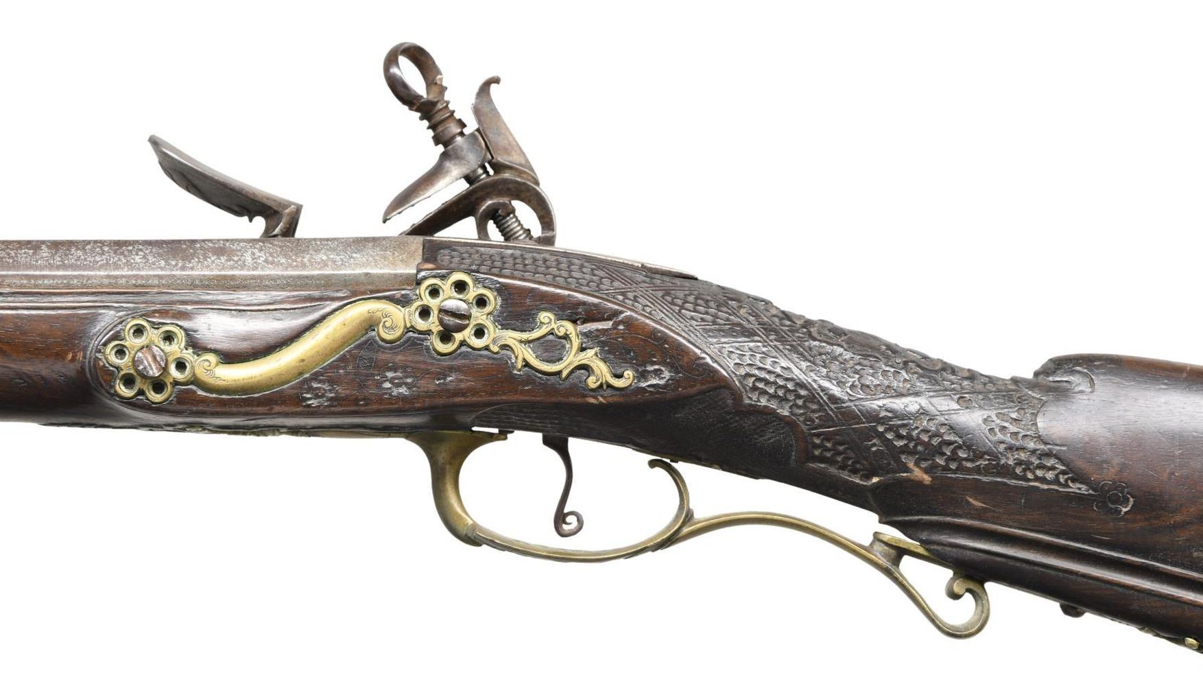 Cal. 75. S# NSN. The 27-3/4" barrel has a long octagonal breech section that transitions to a round through the wedding band and has a cannon-turned muzzle; no marks are present. A good-quality miquelet lock with an arched and rounded plate has a fancy scroll-filed bridle to contain an external main spring. The cock is of early style with a reinforced head. Lock also features an inset faceted pan, bridled friction frizzen, and a feather spring with a file-decorated top leaf. The rear of the lockplate and the back face of the frizzen are relief-engraved. The remains of the plate are engraved with some scroll and the maker's name, "Mic. Ricxxx," last letters obscured by the main spring finial. Dense European walnut stock extends to within 3" of muzzle and is of early style with pronounced carved flutes along the comb and toeline. The grip area shows some checkering divided by ribbons from a large area of geometric chip carving that wraps over top of the grip. Similar treatment is on the forepiece; other fluted moldings are along barrels and ramrod channels. Mounts are made of pierced brass and nicely engraved. Buttplate has foliate finials. The trigger guard with a loop-forming grip has acanthus motifs at the front and rear. The sideplate is nicely scrolled and has a pierced extension to the rear. The stock attaches to the barrel with two brass slip-on rings. A turned steel ramrod appears to be original. CONDITION: good. Barrel and lock with old cleaning to silver and brown patina. Stock retains most of an old oil refinish. Carving shows considerable wear. Brass is nicely toned. Wrist escutcheon is missing, as is the band at the muzzle end of the stock. The stock shows some missing wood at the same place, but otherwise it appears sound with some cracks around the bottom of the lockplate. Bore is pitted. Lock is good. A good-looking early gun. (01-24336/MGM). ANTIQUE. $1,500-2,500.