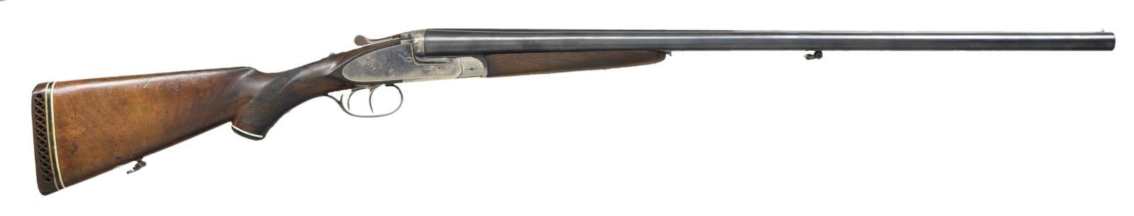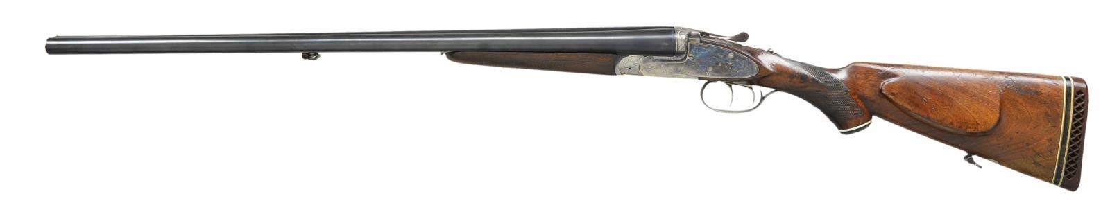 Cal. 12 Ga. S# 42377. Bbls. 27 9/16" solid matted rib w/ front bead sight. Chambers are 2 3/4" & choked “FULL” & “FULL” w/ ejectors. Blued bbls. & trigger guard w/ engraved case colored frame & upper tang w/ gold colored inlay “RENO” atop the lever. Frame sides w/ dog on point w/ game bird & light scroll engraving while the belly has a lone bird w/ more scroll. Fences feature more elaborate floral engraving. Checkered splinter forend & pistol grip stock w/ raised cheek rest, ebony grip cap & white spacer. Sling swivels & LOP is 14” & 14 7/8” to Pachmayr recoil pad. UNATTACHED ACCESSORIES: black plastic case. CONDITION: bbls. have been nicely reblued; leaving most markings legible. Frame retains about 20% case, tang about 40% w/ balance in the white. Stock set has been sanded w/ numerous dings, dents & shallow gouges. Bores are bright w/ some streaking, fine scattered pits & some very tiny dents. PROVENANCE: "Save the Fine Guns". T&G German Gun Imports, bringing fine German guns to a more appreciative market. (22-5004/CW). MODERN. $350-550.
