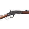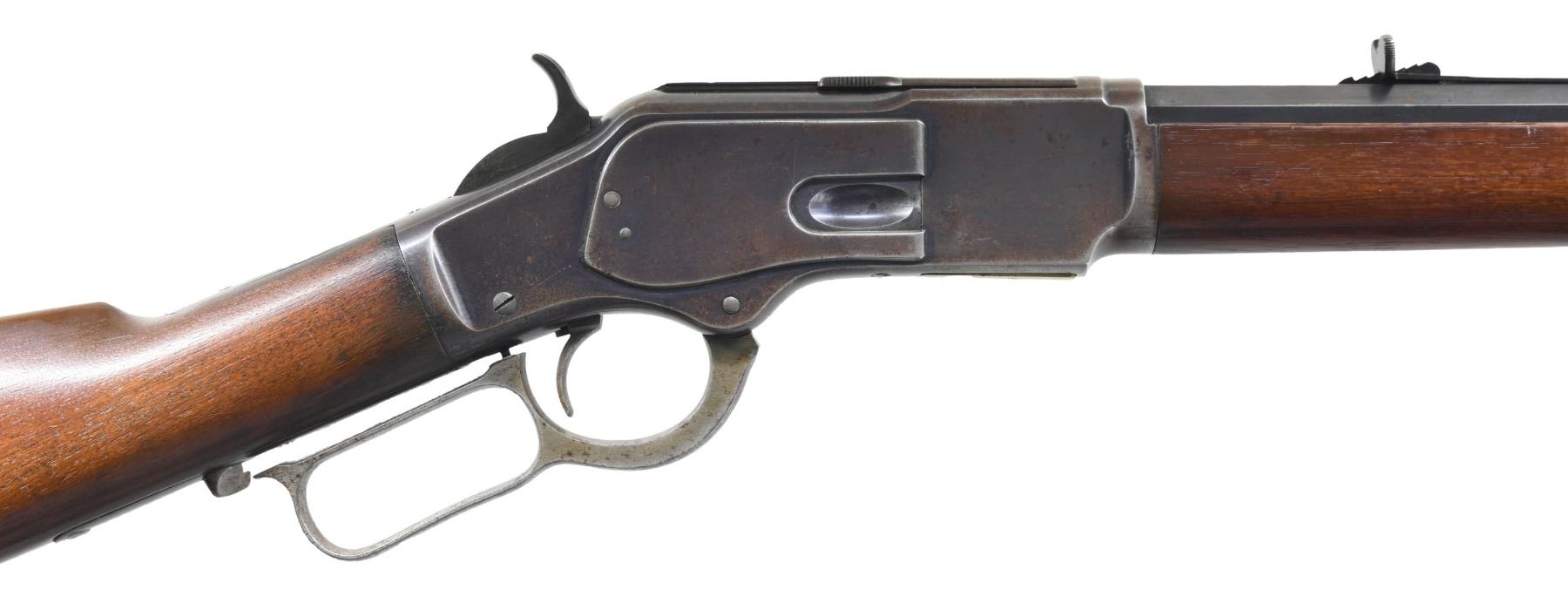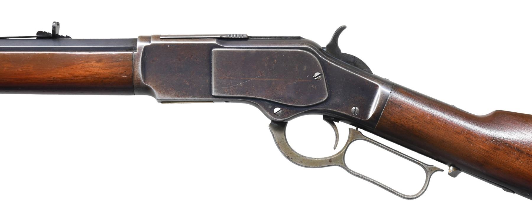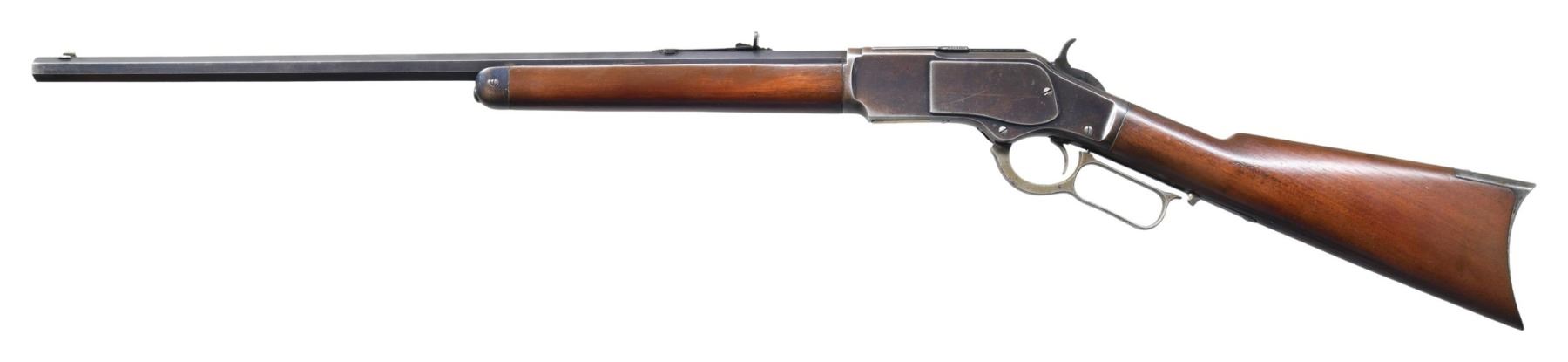 MODEL LEVER ACTION RIFLE. Cal. 38 WCF (38-40). S# 248515B. Bbl. 24" octagon, with original sporting sights. Button mag. Blue finish, with case colored hammer and lever. Walnut forearm and straight grip stock, with crescent steel trapdoor buttplate. Mfg. 1888. CONDITION: 80% original blue, showing edge and carry wear, with scattered spots of surface freckling and very light pitting. Lever retains faint traces of case colors. Lightly sanded and refinished wood shows scattered scratches and marks. Full length repaired crack on left side of forearm and 1" hairline extending from forend cap. Mechanically fine. Bore retains strong rifling, showing scattered light pitting. (01-27045/DS). ANTIQUE. $3,500-5,000.