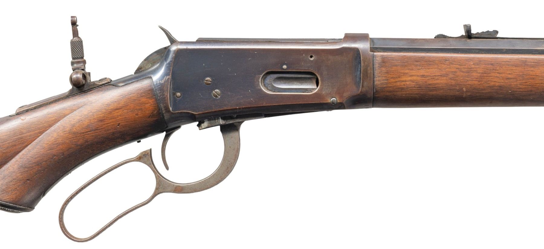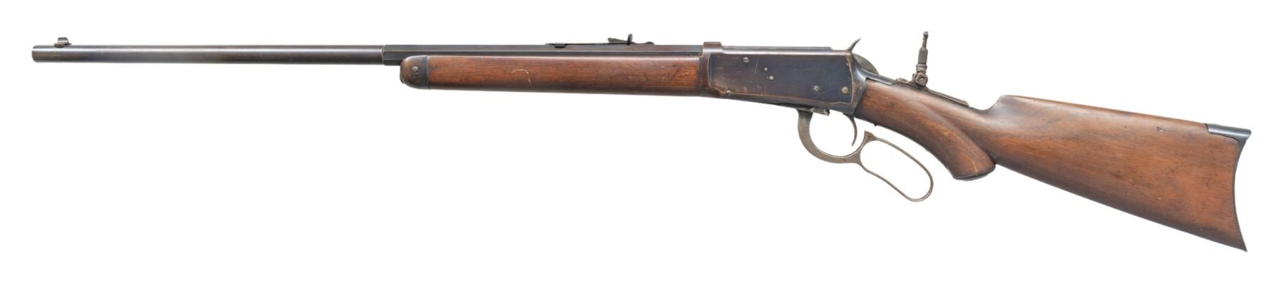 ACTION RIFLE. Cal. 32-40. S# 190688. Mfg. 1903. Bbl. 24" part rd - oct. with Lyman bead front sight (bead missing), elevator adjustable sporting rear sight. "Manufactured by the Winchester Repeating Arms Co. / New Haven. Conn. U.S.A. Patented August 21. 1894." Marked on the top flat. Button mag. Plain trigger. Lyman No.1 2nd variation tang sight. Lower receiver tang marked "17331 CH". Plain pistol grip walnut stock set with replacement blued crescent smooth buttplate & Winchester Repeating Arms hard rubber pistol grip cap. The butt is marked "94 / 17331" under the buttplate. CONDITION: overall good. Bbl has thinning original blue with approx 70% coverage showing some high edge wear, a few dings at the muzzle, and some scattered light freckled oxidation. Receiver has thinning finish in the carry areas with exposed areas turning to a brown patina with some evidence of old touch up bluing. The original receiver blue has approx 70% coverage with some scattered light handling marks and light scratches. The stock set has been sanded and refinished and the replacement buttplate is not a great fit. Nose cap has thinning finish with the balance showing a brown patina. Lever has traces of case coloring in the protected areas. Loading gate retains 30% fire blue. Buttplate has 95% reblued finish. Bore shows light frosting and some scattered pitting with distinct rifling. (25-1311/ZAL). CURIO. $1,000-1,500.