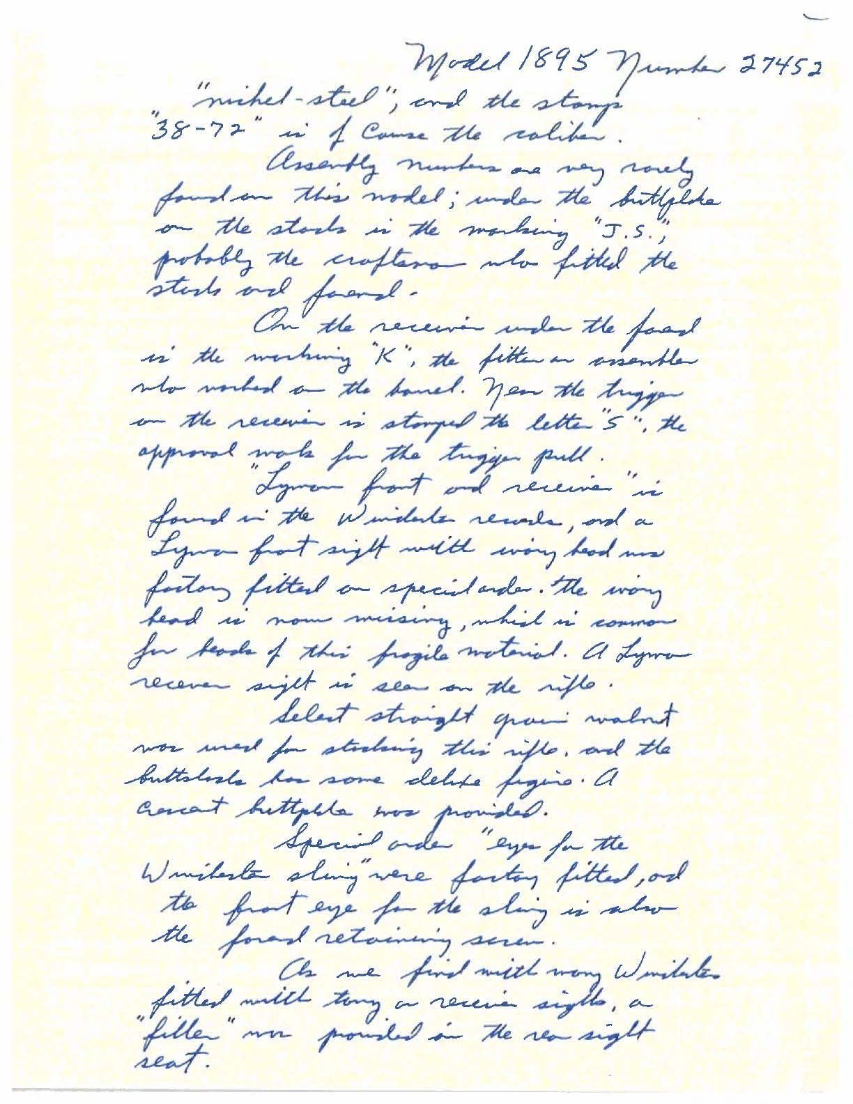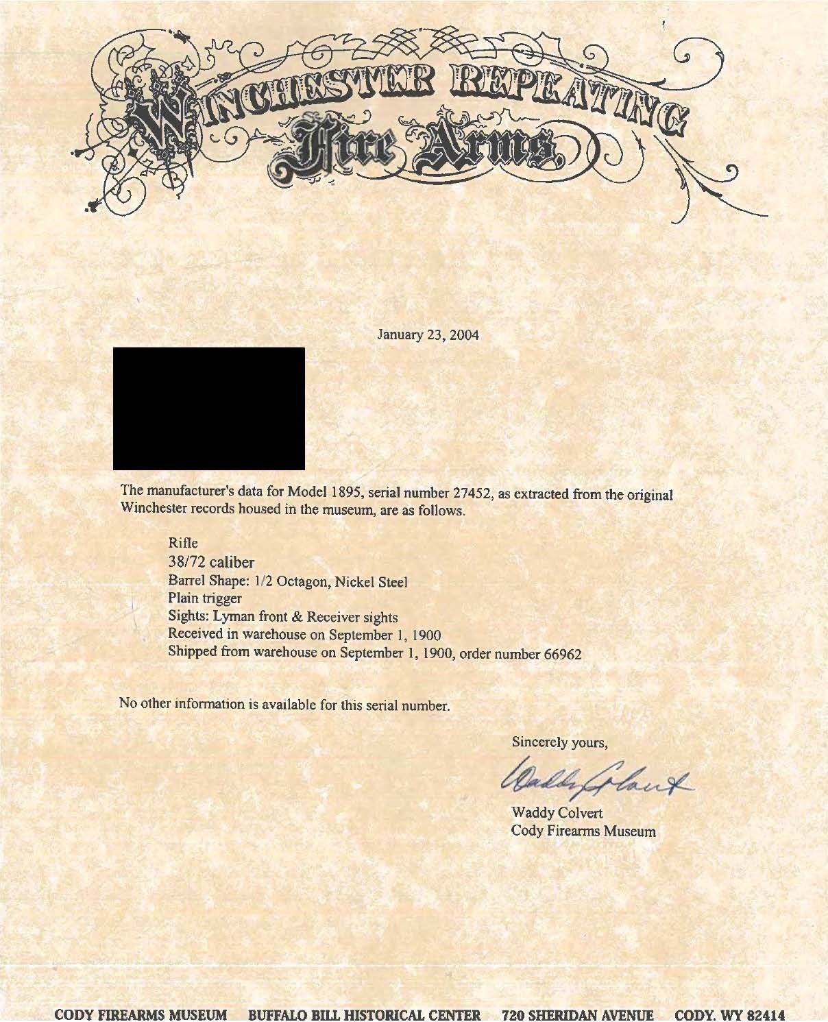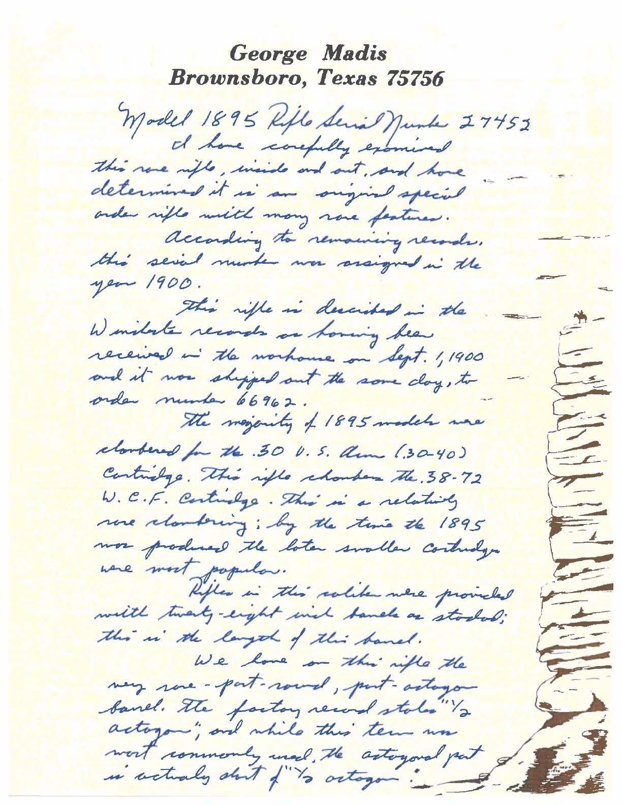 IN SCARCE 38-72 WCF WITH GEORGE MADIS LETTER. Cal. 38-72 WCF. S# 27452. Mfg. 1900. Bbl. 26" Nickel Steel 1/2 Oct. with Lyman bead front sight, factory filled rear dovetail. Factory mounted Lyman receiver sight. Straight grip walnut stock set with crescent buttplate, factory mounted sling eyelets, and ebony tipped schnabel forearm. According to George Madis of the first 59,999 producion 1895 rifles only 72 were produced in 38-72 with part round - part oct bbls. UNATTACHED ACCESSORIES: Cody Firearms Museum factory letter confirming configuration & George Madis letter reviewing this rifle and summarizing it as a "rare and fine collectors Winchester, with the age of about one hundred years, rare variations and fine condition it merits a place in any collection of rare arms" CONDITION: overall fine with thinning bluing on the bbl retaining approx. 60-70% coverage showing a fair amount of freckled old spotty oxidation with some shallow pitting, light muzzle/high edge wear and scattered handling marks. Receiver and receiver sight have thinning finish in the carry areas that have faded to a greyish/brown patina. The balance of the metal surfaces have vibrant original bluing that is mildly fading and showing scattered handling marks and light scratches with about a 60% coverage. Stock set has been lightly sanded and refinished with some bubbling to the finish and scattered handling marks and scratches. Buttplate has freckled oxidation present over a grey patina. Bore has light frosting with sharp rifling. (25-1279/ZAL). CURIO. $2,500-4,000.