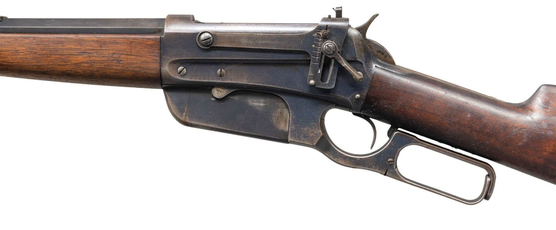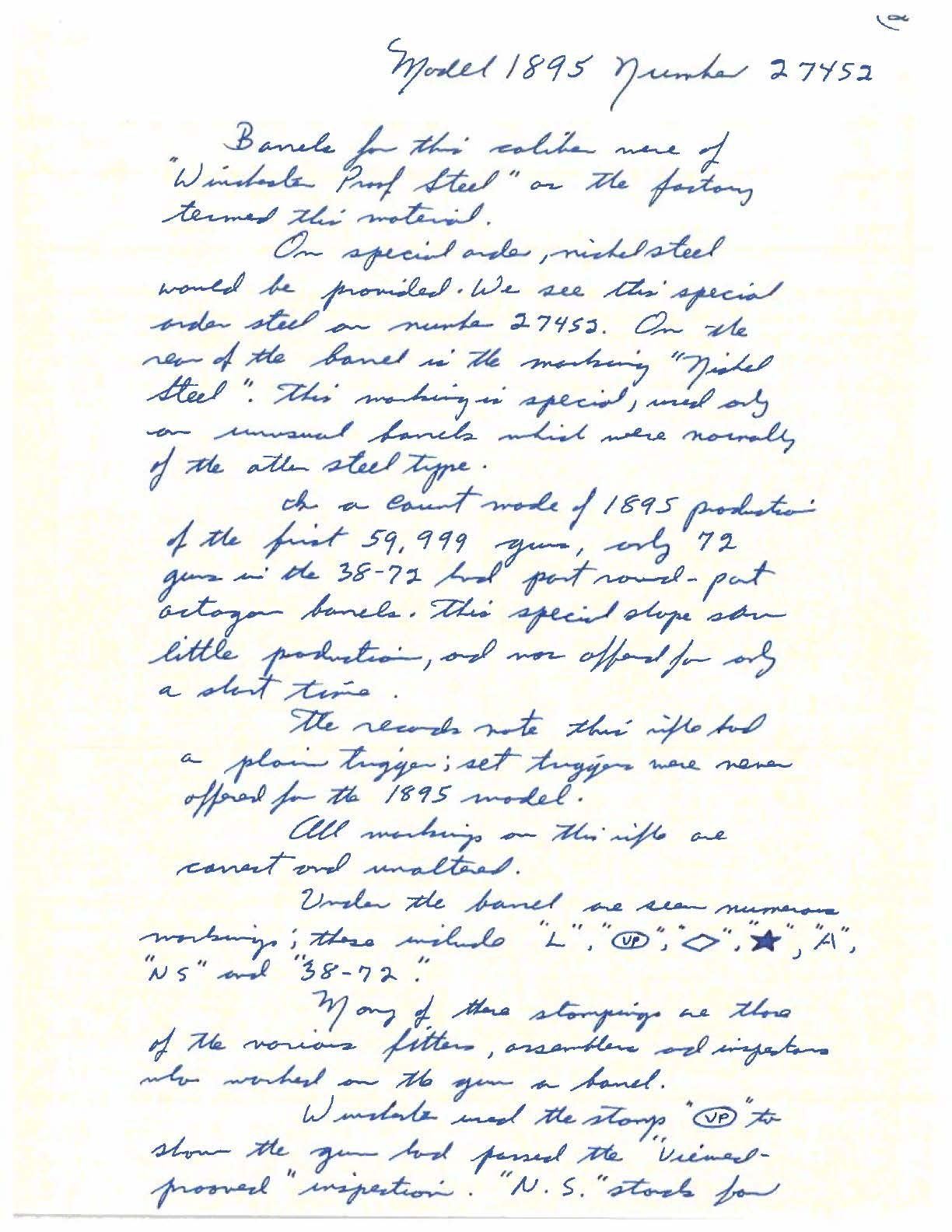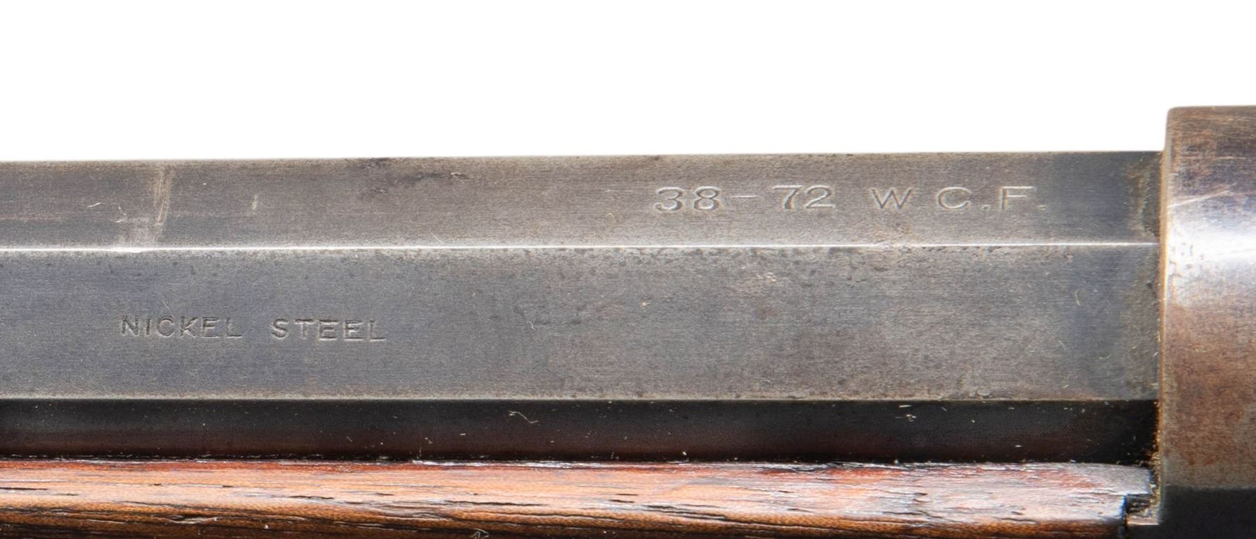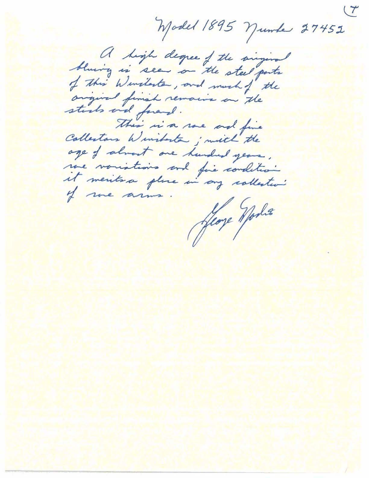 IN SCARCE 38-72 WCF WITH GEORGE MADIS LETTER. Cal. 38-72 WCF. S# 27452. Mfg. 1900. Bbl. 26" Nickel Steel 1/2 Oct. with Lyman bead front sight, factory filled rear dovetail. Factory mounted Lyman receiver sight. Straight grip walnut stock set with crescent buttplate, factory mounted sling eyelets, and ebony tipped schnabel forearm. According to George Madis of the first 59,999 producion 1895 rifles only 72 were produced in 38-72 with part round - part oct bbls. UNATTACHED ACCESSORIES: Cody Firearms Museum factory letter confirming configuration & George Madis letter reviewing this rifle and summarizing it as a "rare and fine collectors Winchester, with the age of about one hundred years, rare variations and fine condition it merits a place in any collection of rare arms" CONDITION: overall fine with thinning bluing on the bbl retaining approx. 60-70% coverage showing a fair amount of freckled old spotty oxidation with some shallow pitting, light muzzle/high edge wear and scattered handling marks. Receiver and receiver sight have thinning finish in the carry areas that have faded to a greyish/brown patina. The balance of the metal surfaces have vibrant original bluing that is mildly fading and showing scattered handling marks and light scratches with about a 60% coverage. Stock set has been lightly sanded and refinished with some bubbling to the finish and scattered handling marks and scratches. Buttplate has freckled oxidation present over a grey patina. Bore has light frosting with sharp rifling. (25-1279/ZAL). CURIO. $2,500-4,000.