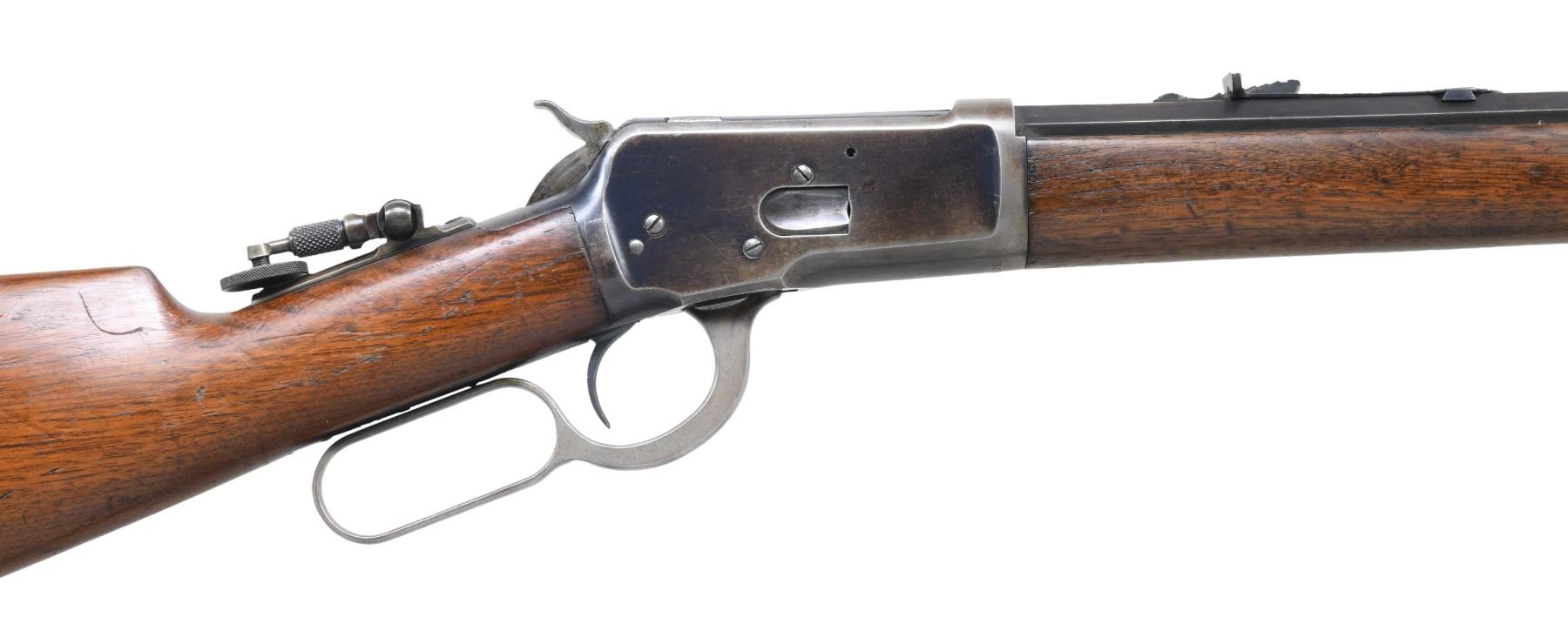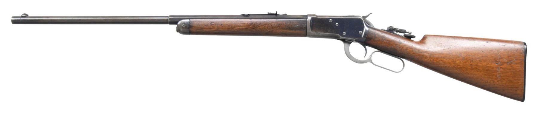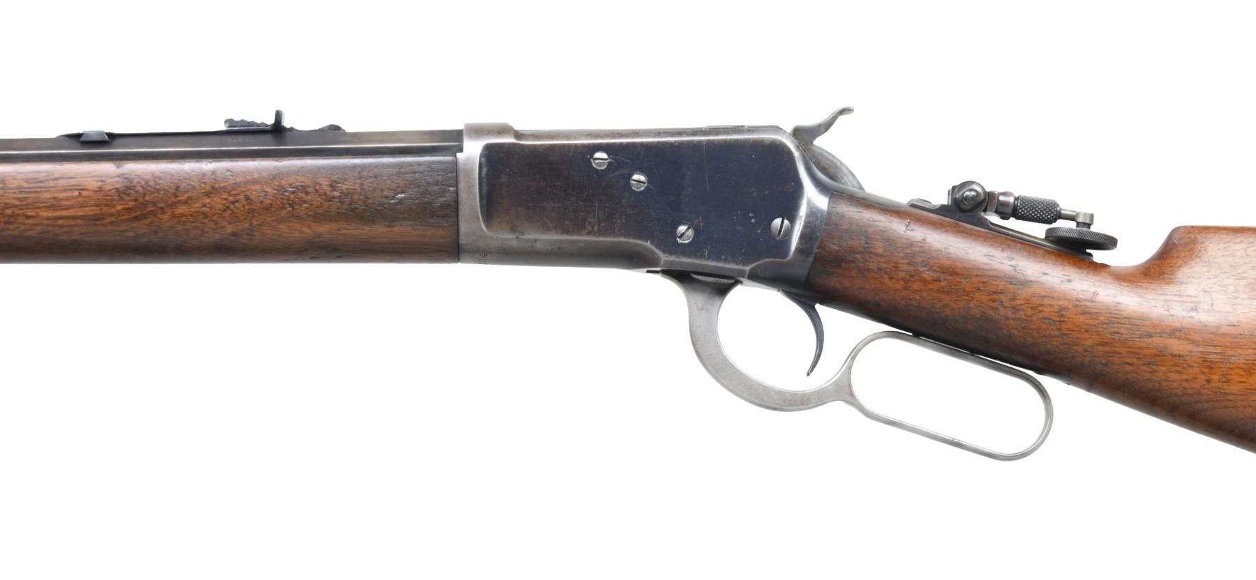 RIFLE. Cal. 44 WCF (44-40). S# 304304. Bbl. 24" octagon to rnd. Lyman No. 4 hunting front sight, with original flat top sporting rear sight, and early Lyman combination tang sight having a large disc aperture. Button mag. Blue finish, with case colored hammer and lever. Walnut forearm and straight grip stock, with factory hard rubber shotgun buttplate. Mfg. in 1905. CONDITION: 40% original blue, showing small scratches and marks, with spots of light pitting. Wood has original finish showing scattered scratches and marks. Mechanically fine. Lightly pitted bore, retains sharp rifling. (25-1721/DS). CURIO. $3,000-4,000.
