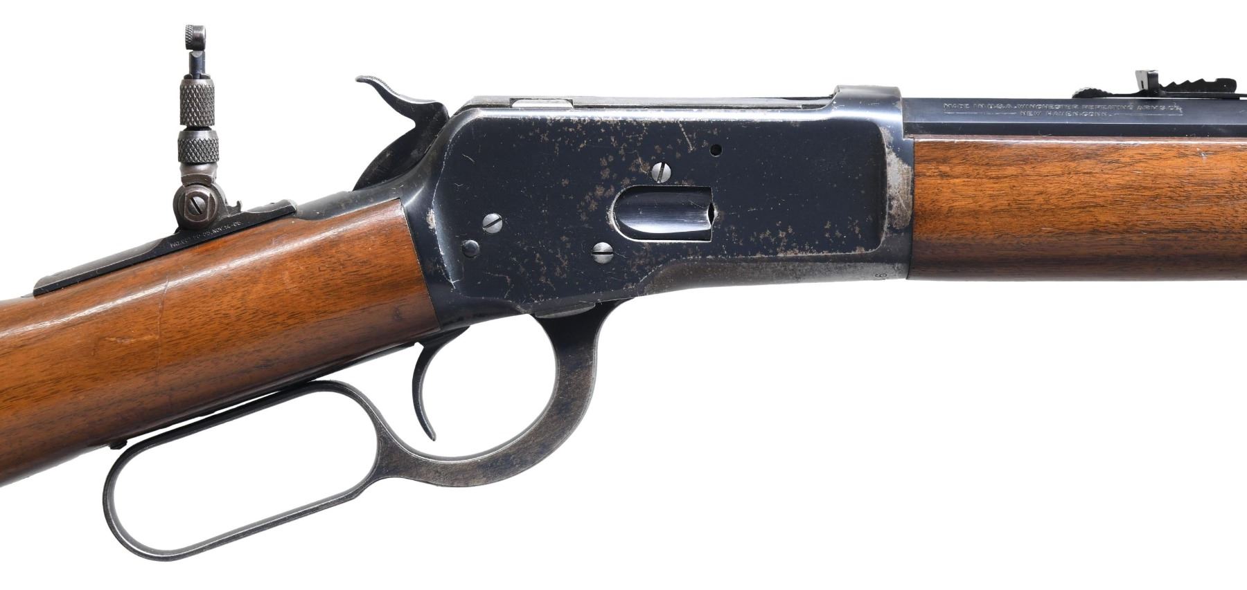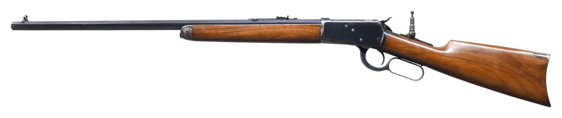 LEVER ACTION RIFLE. Cal. 38 WCF (38-40). S# 970715. Bbl. 24" octagon. Combination folding front sight, flat top sporting rear sight, with Marble combination tang sight. Button mag. Blue finish. Walnut forearm and straight grip stock, with crescent steel buttplate. Mfg. in 1926. CONDITION: bbl. retains over 95% bright original blue, showing very faint edge wear. Action and forearm cap have over 60% original blue, with carry wear, with areas of flaking and scattered spots of very light pitting. Good original wood finish shows small scratches and marks. Sound mechanics. Very good bright bore. (25-1750/DS). CURIO. $3,500-4,500.
