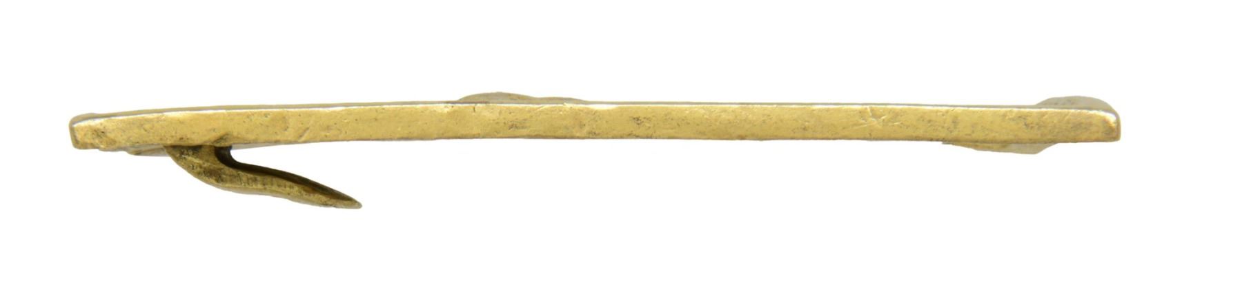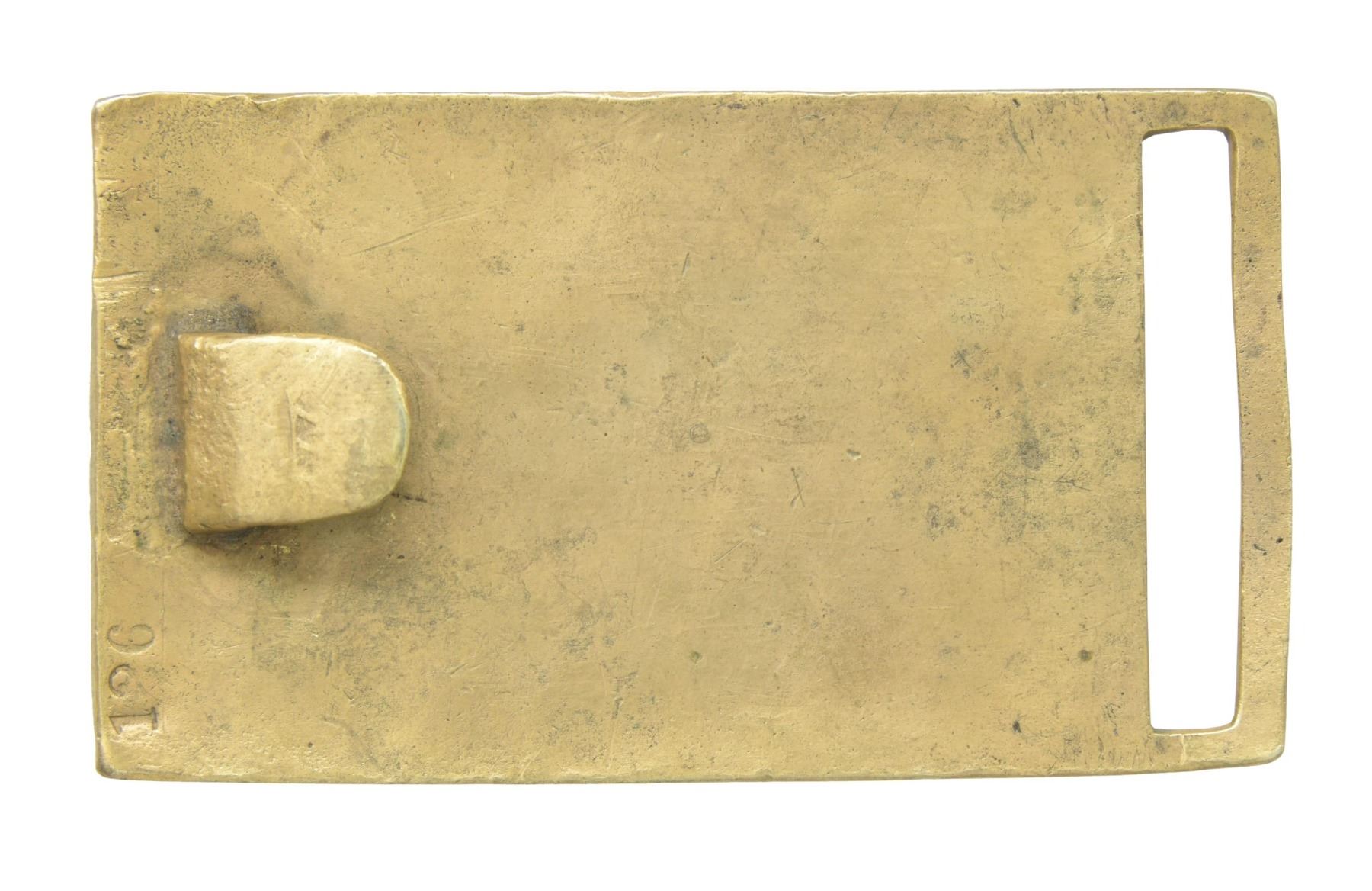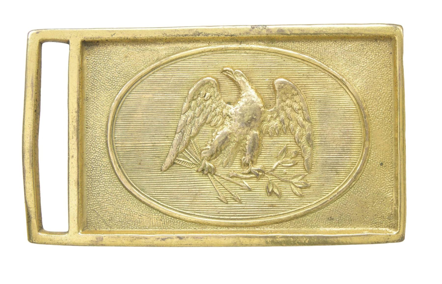 PLATE. 88.4mm x 51.6mm heavily gilded with best detail possible of Mississippi state seal eagle with crisp relief. Benchmark "126" stamped on reverse. This buckle is new to market only recently discovered in Mexico and this is the first time ever offered. CONDITION: very fine overall, buckle is flat, no body curve, keeper is slightly bent, retains most of its gold especially in background. The eagle's feathers & talons, arrow feathering & points, and olive branch are finely detailed and preserved. (02-23308/JS). NON-GUN. $10,000-20,000.