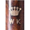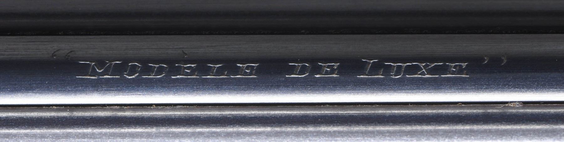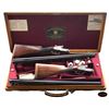 SIDELOCK EJECTOR DOUBLE TRIGGER HEAVY PROOF GAME GUNS MADE FOR R.A.F. WING COMMANDER WOJCIECH KOLACZKOWSKI WITH ORIGINAL CASE & ACCESSORIES. Cal. 12 Ga. 2-3/4" (BOTH). 1. S# 33664 & 2. S# 33665 (1948). Wojciech Kolaczkowski was born in 1908 in Moszenki, Poland to a wealthy noble family. He excelled at skiing, horse riding, shooting, etc., representing Poland at clay pigeon shooting. He joined the Polish Airforce in 1929 and became commander of the 303rd squadron of the Polish Airforce in England. He was also commander of the #2 Polish wing and then took command of the #1 Polish wing in 1943. He won the distinguish Flying Cross in June of 1943. In 1944 he became Deputy Attache to the Polish Embassy in London until the end of the war. After WWII he emigrated to America where he was sales manager for Jaguar and British Leyland in NYC. He had these guns made in 1948. They have 28" chopper lump barrels with raised matted ribs. Rear portions are gold inlaid with the numbers "1" & "2" which also appear on top levers and forend tips denoting a true pair. The exception being the theme of the engraving; dogs & birds on Gun #1; birds only on Gun #2. Maker's name and address are engraved on tops of barrels. 2-1/2" of well cut acanthus scroll tapers from breech ends downward to fronts of actions. Barrel flats are stamped with London nitro proofs for 1-1/4 oz. of shot & "2-3/4" chamber length. S#'s are on bottoms of barrels. Bottom ribs are engraved "Made in England" & "Modele De Luxe". Barrels are fitted with H&H patent self-opening assist springs. Coin finished hand detachable sidelock actions are stocked to the fences and feature automatic safetys ("SAFE" inlaid in gold), hidden third fasteners, bushed strikers, gold band tumbler end cocking indicators, gold plated cocking levers and double triggers (fronts articulated). Actions and lockplates are special order engraved with shaded scroll highlights surrounding game and dog scenes; most likely executed by the revered Harry Kell whose relatively large eyed birds and superb shaded scroll are essentially a signature. Gun #1 depicts a setter retrieving a grouse on bottom of action while possibly the same setter retrieves a pheasant on left lockplate. Right lockplate has a scene of a pointing pointer. Gun #2 shows a nye of three pheasant on bottom (two on ground with one taking wing). Left lockplate has a group of four snipe in grass along brook side. Right lockplate shows three feeding pheasant. Both guns are engraved "Holland & Holland" on each side along with "Made in England" on hinge pin covers and "Modele De Luxe" on top levers. Fences are beautifully relief carved with scrolling acanthus; another Kell feature. Trigger guards with single right hand beads are engraved with standing partridge on gun #2 and setter retrieving on gun #1. S#'s are on short tangs. Straight grip stocks are made of very well matched European walnut with spectacular fiddle back grain and very fine marbling. They measure 14-3/8" over tan pig skin covered pads and also feature classic point pattern checkering on diamond hands and well shaped drop points. The individual gold initials "WK" are inlet on toeline where they are surmounted by the crown of a baron. Matching splinter ejector forends have Anson releases. MEASUREMENTS: Gun #1. BBLS: Bore Diameter: L .729. R .729. Restriction: L .031 (full). R .033 (full). Wall thickness: L .030. R .032. STOCK: DAH: 2-1/8". DAC: 1-7/16". CAST: about 1/2" off. LOP: 14-3/8" WEIGHT: 7 lb. 9 oz. Gun #2. BBLS: Bore Diameter: L .730. R .729. Restriction: L .028 (IMod). R .032 (Full). Wall thickness: L .032. R .032. STOCK: DAH: 2-3/16". DAC: 1-7/16". CAST: about 1/2" off. LOP: 14-3/8". WEIGHT: 7 lb. 8 oz. UNATTACHED ACCESSORIES: guns are housed in their original oak and leather two gun case with leather trimmed canvas outer cover. Top of case has later inset leather rectangle gold embossed "J.S.T.". Outer cover has later stitched on leather label embossed "Made for RAF Wing Cmd." "W. Kolaczkowski in 1948" "currently owned by" "Dr. John Thalgott". Interior is lined in burgundy cloth. Top has gold embossed H&H black Morocco leather label flanked by gun cleaning instruction label at left and charge card for this pair of guns at right. Accessories include: one pair of older H&H marked snap caps along with a newer pair. An older H&H marked pewter oil bottle along with a newer one, a empty bone striker bottle, two piece cleaning rod. Also included are two uncheckered walnut buttplates interchangeable with recoil pads. A covered compartment holds another bone striker bottle holding four screws for attachment of wooden buttplates. Another compartment holds a bottle of "303 Cleaning and Rust Preventer". CONDITION: exceptionally fine. Very close to "as new". Barrels retaining about 98% original blue with some minor marks and light scratches. Actions remain bright with now evidence of cleaning. Stocks show evidence of very light use with some loss of finish on drop points and grips. There are some minor handling marks on left side of Gun #1 buttstock. Checkering on both guns has very light wear and is dark. Pads are relatively new as are wooden buttplate. Bores are superb, bright and shiny with no visible imperfections. Both guns are mechanically fine with tight actions and crisp well timed ejectors. Case leather is very fine with some creases and marks as protected by its outer cover which shows rubs and scuffs. Straps and handle are good although a bit tender. Interior cloth is very fine with some minor rubs and marks. Labels are very fine, very lightly foxed. Accessories are fine. A truly superb pair of guns. A similar pair if ordered today would cost well in excess of $300,000, but would not exude the history and hand craftsmanship exhibited by these fine guns. PROVENANCE: from the renowned collection of quality sporting arms from Lewis Drake together with inventory of Lewis Drake Associates. (24-6560 & 25-246/MGM). CURIO. $50,000-75,000.