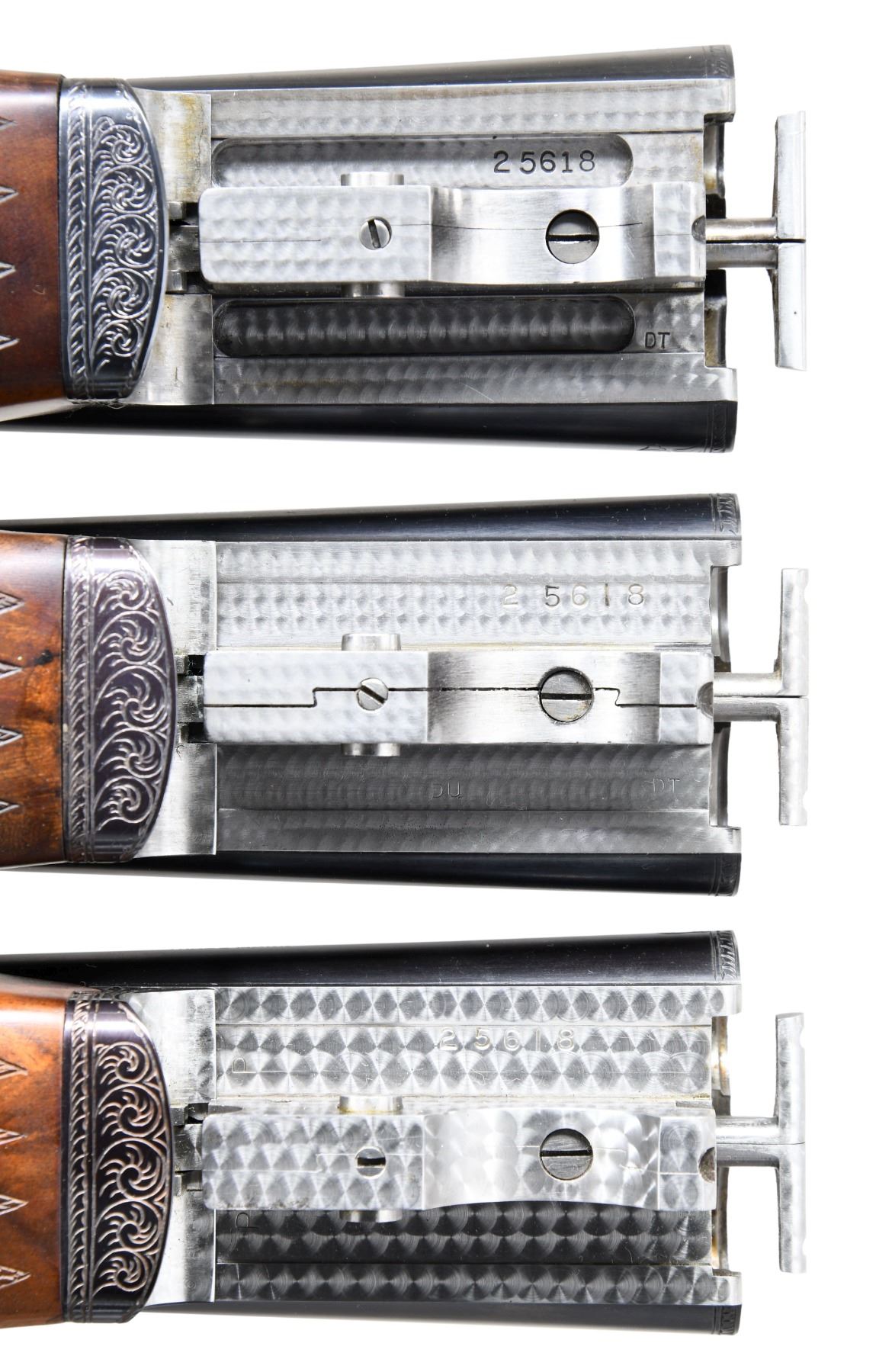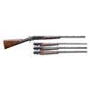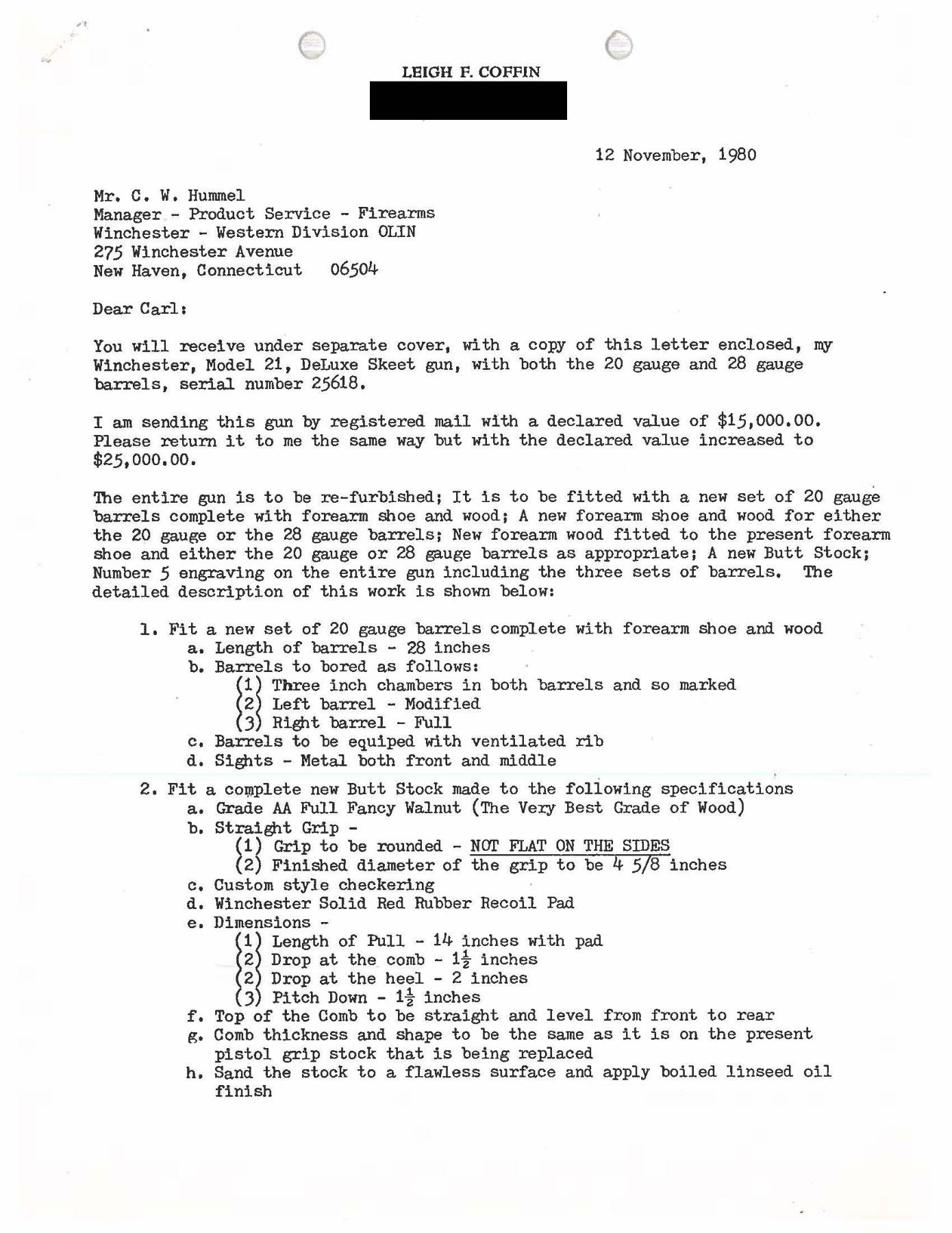 ENGRAVED THREE GAUGE SET SXS SHOTGUN. Cals. 410 ga., 3", 28 ga., 2 7/8", 20 ga., 2 3/4" & 20 ga. 3". S# 25618. The following quote is from an appraisal for Mr. Leigh F. Coffin of Beatrice, Nebraska dated May 17, 2013. "This is one of the very finest multi barrel Model 21 shotguns known and is accompanied by all the invoices as well as correspondence documenting its history.". A letter from C.W. Hummel product service manager at Winchester-Western dated May 20, 1980, prior to the shotgun's upgrade, relays some of the interesting history of this remarkable shotgun, "According to our manufacturing records, Model 21 - #25618 - was built in August of 1950 as a DeLuxe, 20 gauge, Skeet gun, equipped with an extra set of 28 gauge skeet barrels. Why the location of the barrel inscriptions differ is unexplainable, unless one of the sets of barrels was replaced at a later date and not recorded. In any event, the gun does appear to be original. / Attached are some up-to-date photographs, and prices, for the various engraving patterns we offer. We should be able to work the #5 design around the barrel inscriptions without detracting from the appearance of the gun. You can also select substitute figures for those offered in the standard #5 design. This is common practice. The engraving will be still classified as #5 for the record. / I would not consider replacing the trigger plate or removing the inscription 'DeLuxe Skeet'. We can adapt the #5 pattern accordingly. The 'DeLuxe Skeet' designation adds to the gun's value. / Our actual history on gun #25618 is rather limited. We show it was originally built for Kerr's Sporting Goods in California on August 22, 1950. It is a Deluxe Skeet, 20 gauge with 28" ventilated rib barrels choked Skeet #1 and Skeet #1. It has a single trigger, selective ejection, and non-automatic safety. The stock was of pistol grip configuration, with a Winchester recoil pad and it had a 14" length of pull, 2 1/4" drop at heel, 1 7/16" drop at comb, and a 2" pitch down. The interchangeable 28 gauge ventilated rib barrels measured 26" in length and were also choked Skeet #1 and Skeet #1.". The famous Kerr's Sporting Goods of Loa Angeles, CA. was the dealer of choice for many Hollywood celebrities. CURRENT SPECIFICATIONS: Bbls: (1). original set, 20 ga. 2 3/4". 28" vent rib. Fixed WS-1 & WS-1 chokes. (2). original 2nd set, 28 ga. 2 7/8". 26" vent rib. Fixed Skeet & Skeet chokes. Original M21 28 ga. vent rib guns are very rare.(3). Added by Winchester during the 1980/81 upgrade. 20 ga. 3". 28" vent rib Fixed Mod & full chokes. (4). Purchased from Galazan's in 1995. 410 3". 28" vent rib. Fixed Imp-Mod & Full chokes. All bbls. have steel front & mid beads & individual forearms. Bbl. flats,lugs, ejectors & inside of forearms are machine-jeweled. Blue finished boxlock action features No.5 factory engraving added during the 1980/81 upgrade by factory engraver Pauline Murrell. Pauline was the last of 8 Winchester in house engravers and is the one still living. Engraving features vignette of a grouse on the right side, pheasant on left, a setter retrieving a bird on the floorplate & pointing dog on the trigger guard bow. Scenes are surrounded by scroll engraving & fancy borders that continue to upper & lower receiver areas, breech end of bbls. & forearm iron. Floorplate is marked "deluxe/skeet". Breech face and water table are machine-jeweled. Single selective trigger w/ gold finished selector button. Selective ejectors. Non-automatic safety. Straight grip stock & beavertail forearms for the first three barrels were custom built by Winchester during the 1980/81 upgrade. Stocks are of the finest quality black walnut with point pattern borderless hand checkering and boiled Linseed oil finish. All forearms have ebony tips. LOP: 13 7/8" over a solid red Winchester pad. DAC: 1 1/2". DAH: 2". Downward Pitch: 1 1/2". WEIGHT w/ 28 gauge bbls: 7 lbs, 13.4 oz. UNATTACHED ACCESSORIES: thick binder containing over 50 pages of correspondence, history, documentation, appraisals & specifications pertaining to this very special shotgun. Among the many documents is a letter from Mr. Coffin to Mr. C.W. Hummel at Winchester dated November 12th, 1980 detailing the work to be performed by Winchester, including a new set of 20 gauge bbls., new stock & forearms w/ dimensions specified. Additionally, a letter from Mr. Coffin to Bruno W. Pardee at U.S. Repeating Arms dated August 25th, 1981 inquires about a progress report on the work. A letter from Mr. Coffin to Mr. Kirk Merrington of Kerrville, Texas dated January 30th, 1995 confirms that Mr. Merrington fit the 410 bbls. acquired from Mr. Anthony Galazan. Another letter confirms that the engraving on the 410 bbls. was done by former Winchester factory engraver Nick Kusmit. The estate appraisal for Mr. Coffin dated May 17, 2013 lists fair market value at $65,000-70,000. Among the myriad other letters is a bill of sale & receipt dated 2/17/20 confirming sale of the gun from the Leigh Coffin estate. CONDITION: near excellent as upgraded, retaining nearly all wood & metal finish. All bores are bright & near excellent. PROVINANCE: formerly of the Leigh F. Coffin collection. (25-916/DS). MODERN. $40,000-55,000.