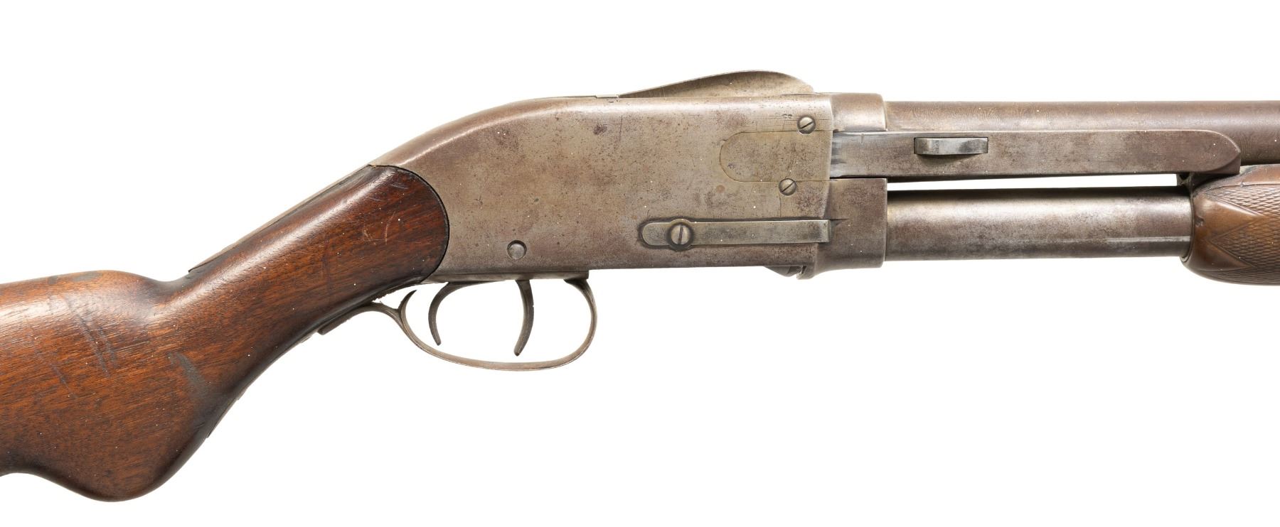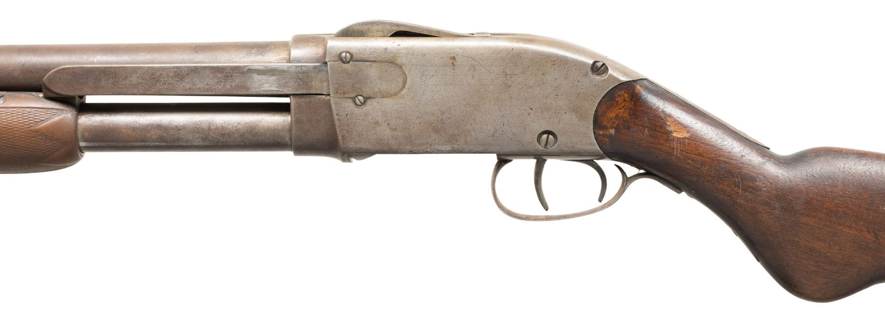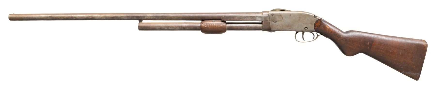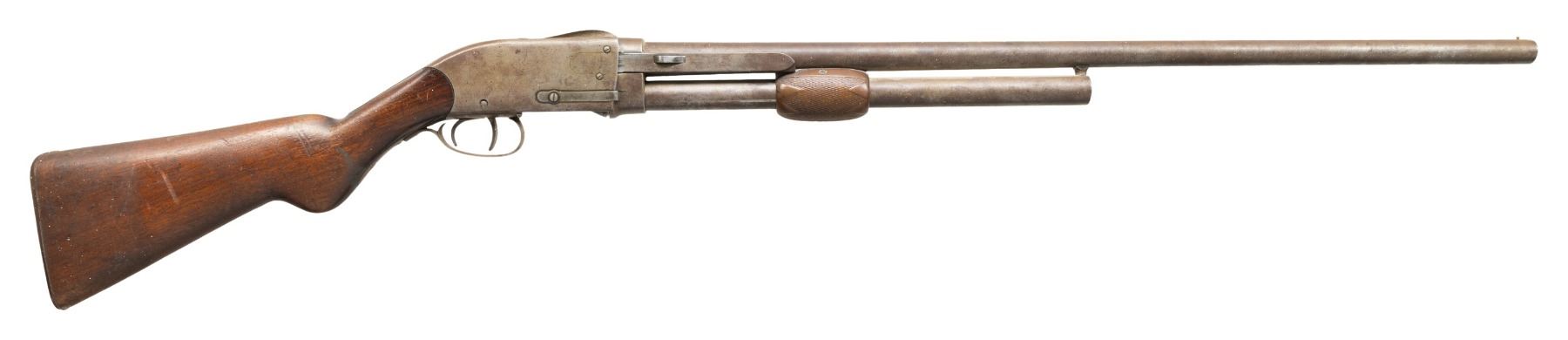 Cal. 12 Ga. NSN. Bbl. 30" w/ steel front bead & Full choke. Tubular mag. Walnut buttstock w/ hard rubber buttplate; hard rubber forearm. CONDITION: metal ahs gray patina appearance with marks & spots of corrosion. Worn wood finish with dings & deep gouges. Good appearing forearm; buttplate shows heavy wear. Bore shows fouling & scratches. (01-28306/MD). ANTIQUE. $200-300.