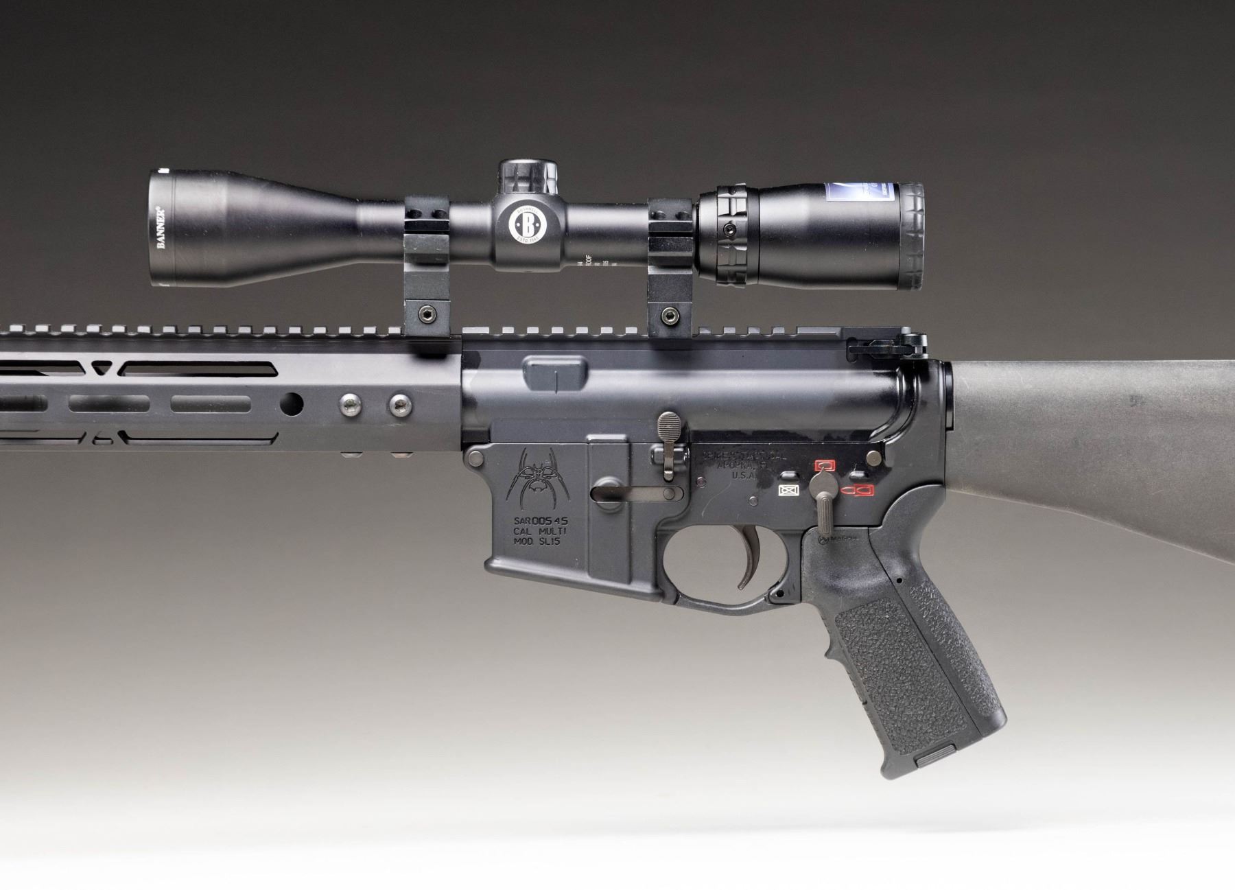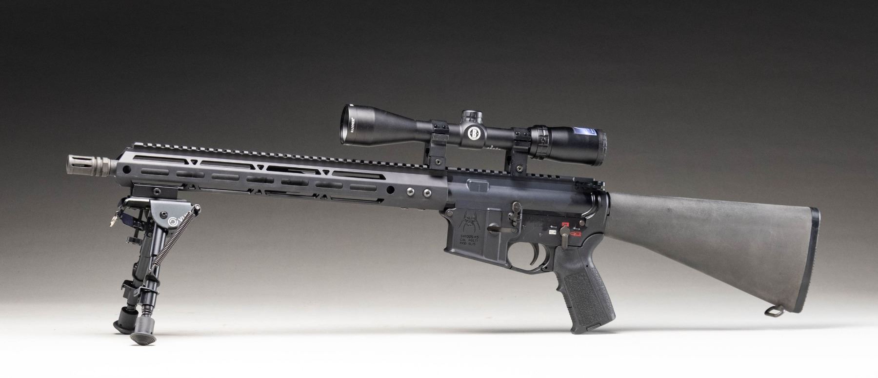 & BIPOD. Cal. 5.56 NATO. S# SAR00545. Bbl.16". Spikes Tactical model SL-15 carbine w/ full length handguard. Threaded muzzle w/ a2 style flash hider. Low profile gas block. Regulated top rail, providing almost 20" of optic mounting surface, w/ M-Lok slots on the sides. Currently sporting Harris-style folding & telescoping bipod at 6 O'clock at muzzle end & Bushnell 3x9x40 scope above receivers. Round forward assist & brass deflector. 3-position pictogram markings on both sides of lower receiver. UNATTACHED ACCESSORIES: green camo nylon transport bag. CONDITION: finish complete & consistent w/ only gentle signs of prior use. Bore is bright w/ strong rifling. Glass is clear w/ sharp reticle. Fire control mechanism appears to function correctly when cycled by hand. (25-6155/JZ). MODERN. $600-1,000.