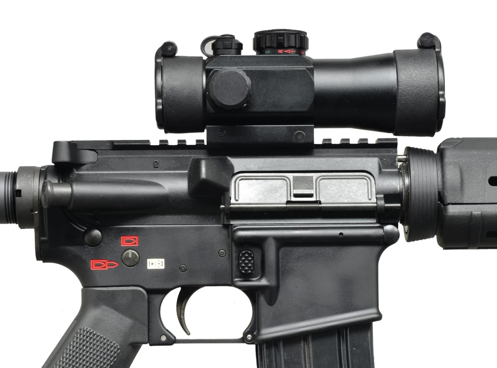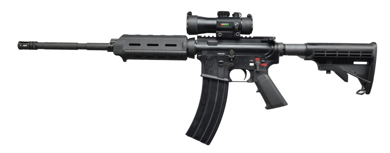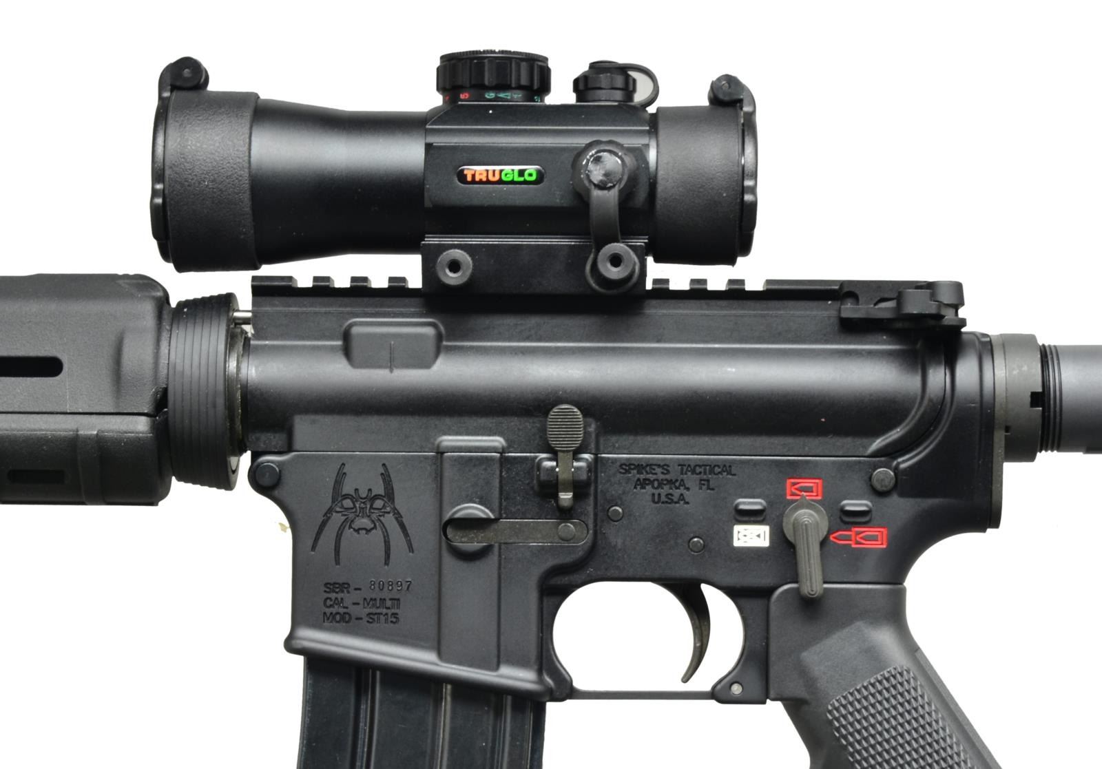 FURNITURE. Cal. 223. S# 80897. Bbl. 16". Spikes Tactical ST15 w/ M4 profile bbl. & A2 style flash hider. Dark black matte finish, typical of Spike builds. Low profile gas block w/ Magpul “MOE” front handguard w/ tapered delta ring. Flat top upper receiver w/ brass deflector & rnd. forward assist sporting a TruGlo electronic sight w/ flip up covers. Pictogram lower w/ left side controls. Spikes 6 position collapsible stock. Knurled extended mag. release. M16 Style bolt carrier. MAGS: 1-40 rd. metal. CONDITION: by all aspects, gun appears to be very gently used if any at all, no major blemishing on either finish or furniture, sight appears to be operational, bore is shiny w/ good rifling. Fire control mechanism appears to function correctly when cycled by hand. (21-431/JZ). MODERN. $600-1,000.