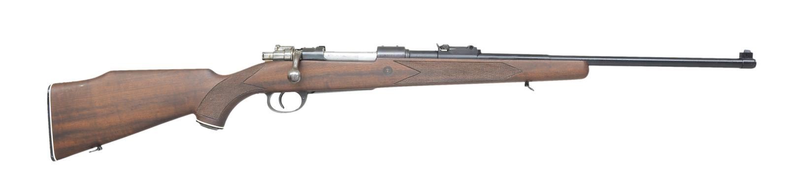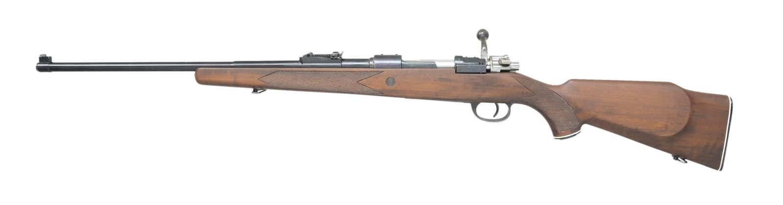 Cal. 7.65 ARG. S# A6379. Bbl. 22", fitted w/ tangent curve rear & military front sights. 1909 Action by DWM has been drilled & tapped for scope, otherwise is in original configuration including hinged floorplate w/ release in trigger guard bow. "Interarms" sporter stock w/ Monte Carlo right hand cheekpiece, checkering at grip & forend & plastic grip cap measures 14 1/4" over "Interarms" plastic buttplate. CONDITION: all major component numbers match. Metal w/ sprayed on black finish. Crest on receiver ring considerably worn, barely visible. Newer stock retains most of its original finish w/ some minor marks. Dark bore. Rifling evident. Mechanically good. (21-1935/MGM). CURIO. $200-400.