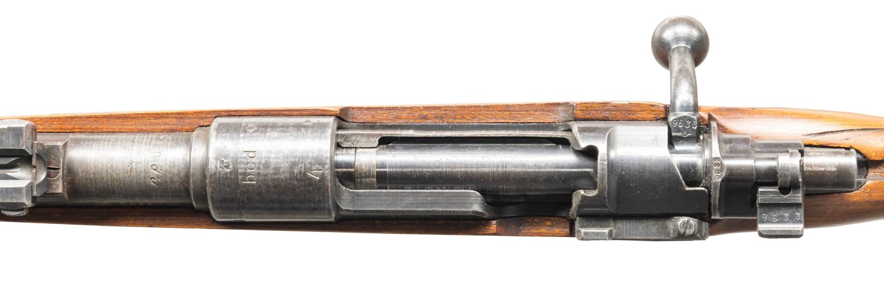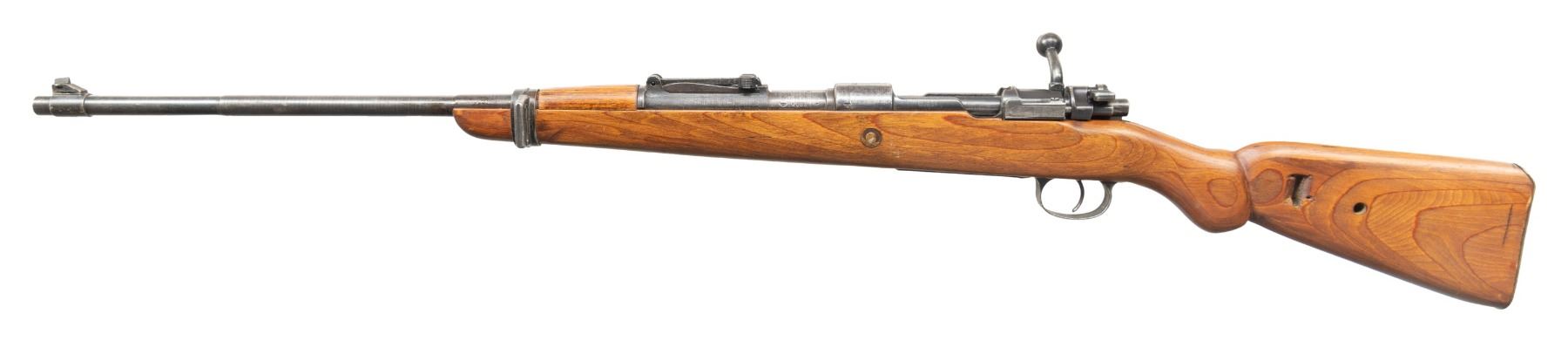 Cal. 8x57 (8mm Mauser). S# 9633V. Bbl. 23 1/2". Blade front sight without hood. Tangent rear sight graduated to 2000m. Matching numbers on bbl., band, floorplate & bolt parts. Receiver ring has bcd4 code. Blued finish. Cutdown laminated stock with thinned & altered appearance around butt. Band is loose & butt has a hole drilled through it. CONDITION: refinished, some deep scratches behind cutout, some chipping around sling cut, dings & handling marks. Metal retains 40% blue with overall edge wear, fading to gray & handling marks. Action functions properly when hand cycled. Bright near excellent bore. (25-6170/MJC). MODERN. $200-400.