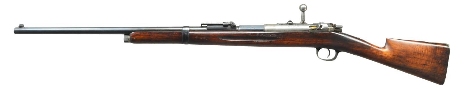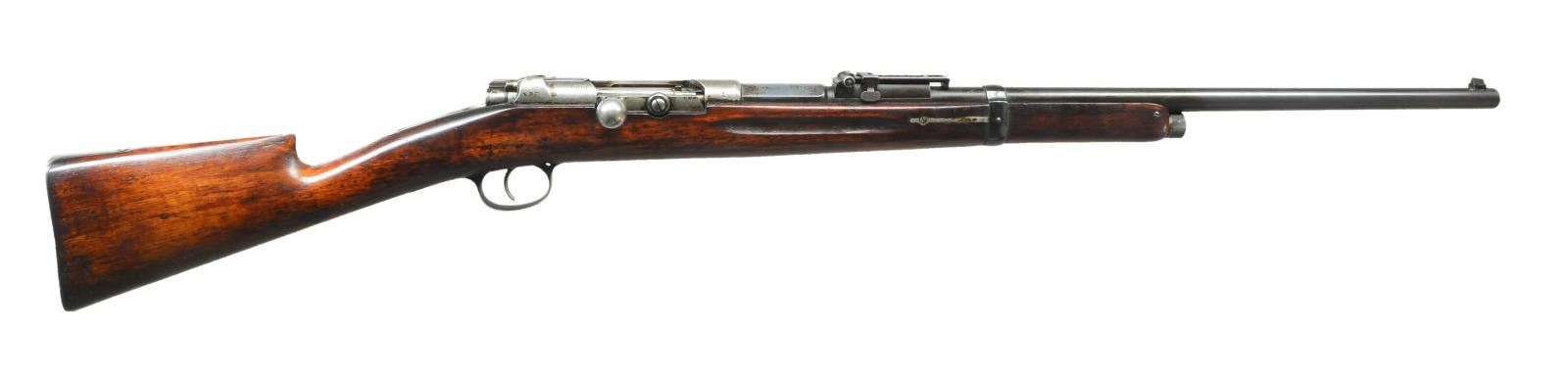 RIFLE. Cal. 11.15x60mmR (11mm Mauser). S# 7501z.(1888). Bbl. cut to 26" w/ reattached blade front sight & 16mm ladder rear sight. Matching numbered bbl., bolt & some screws. Walnut stock & mag. tube cut to approx. 5" in front of rear bbl. band. CONDITION: Good bbl. blue. Good in the white action w/ patina. Good stock finish w/ moderate marks. Very good bore. (01-21170/MD). ANTIQUE. $150-200.