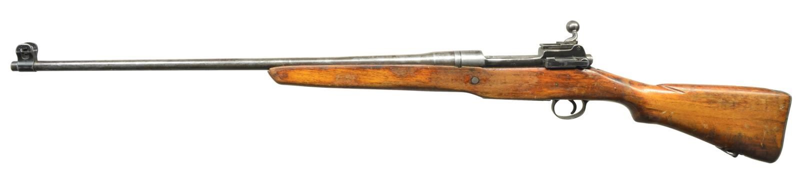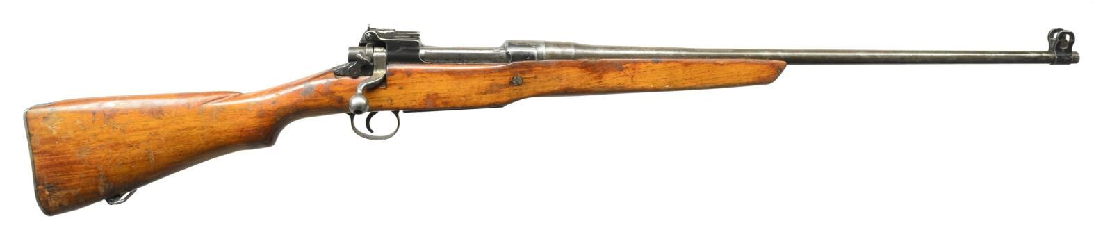 BOLT ACTION RIFLE. Cal. 30-06. S# 1263033. Bbl. 26". Bbl. markings are slightly obscure due to polishing, include flaming bomb 12-18. Ladder aperture rear sight graduated to 1,600yds. Blade front sight w/ protective ears. Receiver bridge has protective sight ears altered. Walnut stock has been cut at lower band & has significant removal of wood. Buttplate & buttstock have been thinned. CONDITION: stock has heavily worn thinning refinish w/ scratches & handling marks. Metal turning gray & patina w/ much of the original finish removed. Good bore w/ lightly worn lands. (21-4385/RW). MODERN. $150-250.