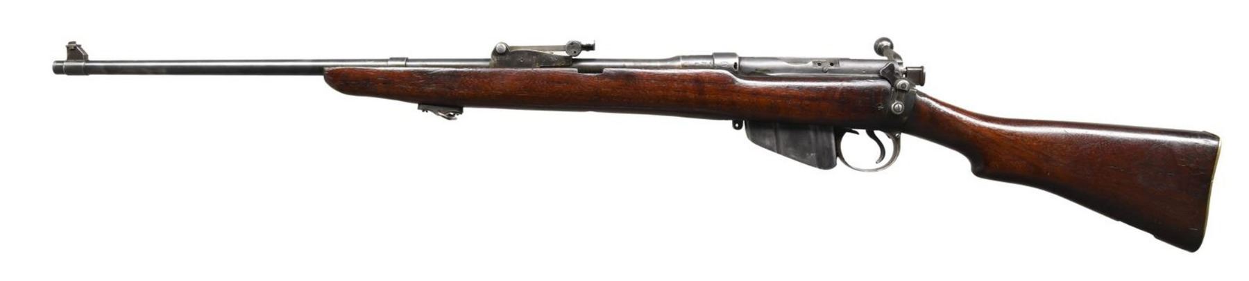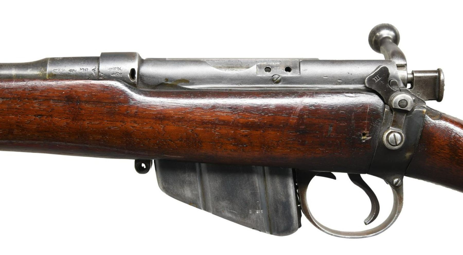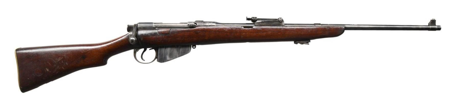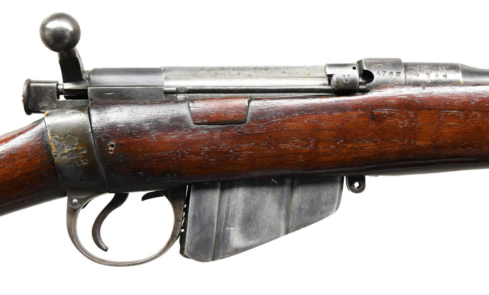 Cal. 303 Brit. S# 4763. Bbl 25". SHTLE III* bolt action rifle manufactured by Enfield. Last digit of year of manufacture on receiver is illegible. Receiver and barrel shank exhibit various British proofs. Metal components exhibit a blued finish, with a coat of lacquer present in some areas. Stock has been shortened, with the rear sling swivel having been removed and a new swivel added on the underside of the forend. Front & rear sight protective "ears" have been removed. Left side of receiver wall has been drilled and tapped. Upper buttplate screw is not present. MAGS: 1 10 rnd. CONDITION: metal components retain large amounts of their arsenal blue finish, exhibiting wear and thinning overall that shows through to gray patina. Dark bore, exhibiting fair rifling throughout. Wood furniture shows scattered marks from handling and storage, with a small purpose made hole on either side near the receiver socket. Right side of stock and buttstock exhibit arsenal repairs. (23-2569/MLW). CURIO. $300-450.