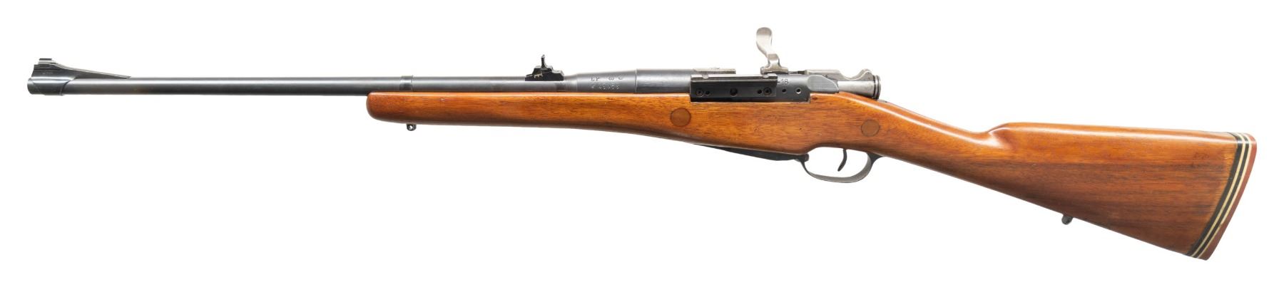 Cal. 8mm Lebel. S# E41073. Bbl. 21 1/2". Ramped Lyman gold bead front sight. Sporting style rear light. Left side of receiver has added commercial scope mount & two extra holes behind mount. Matching numbers on bbl. & floorplate. Three-shot mag. Bolt parts are mismatched with altered spoon style handle. Right side of action has aftermarket added manual safety. Bbl. has 1917 date with MAC arsenal markings & without N balle marking. Blued finish. Cutdown hardwood stock set with a few plugged areas, bottom mounted sling studs & White Line recoil pad. LOP: 13 5/8". CONDITION: sanded stock set has added finish with a hairline crack behind upper tang, some dings & handling marks. Magazine body is proud of wood & front action screw shows some notable slot damage. Metal retains 90% arsenal rework blue with some oxidation, edge wear, handling marks & fading. Action functions properly when hand cycled. Bright near excellent bore. (25-6585/MJC). MODERN. $75-150.