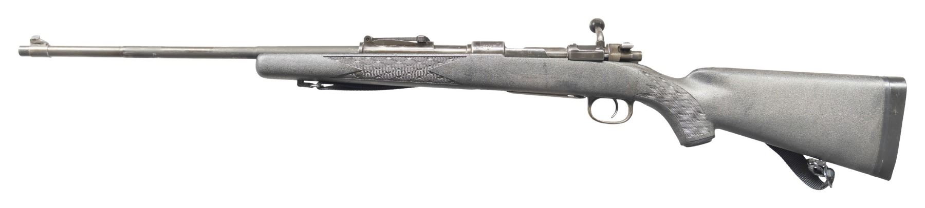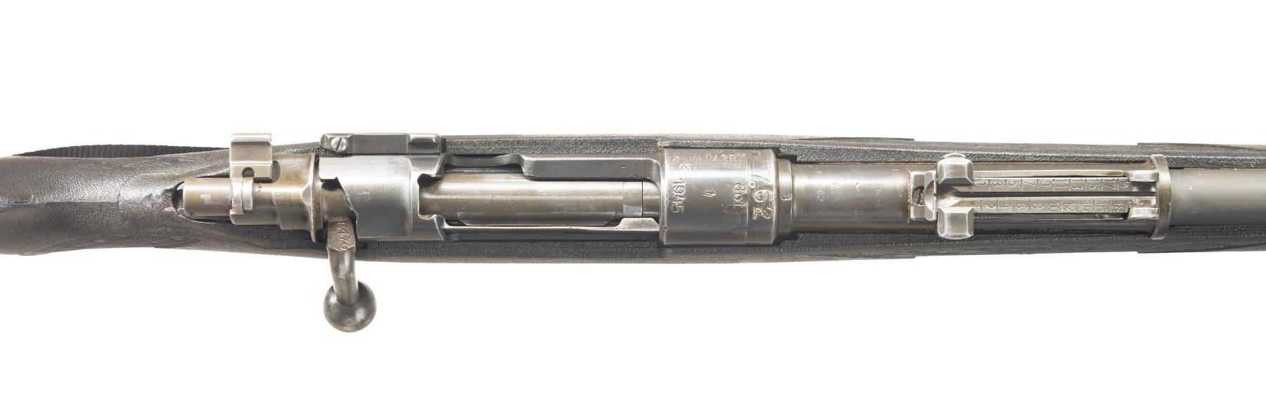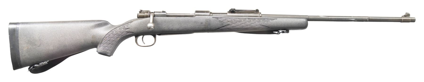 Cal. 7.62x51. S# 6470G. Bbl. 23 1/2". Standard K98k style sights without front sight hood. Matching numbers on receiver & bolt handle. Other parts unnumbered or mismatched. Right side of rear sight base has Armscorp import marking. Receiver ring has "dot 1945" markings with "7.62" cal. marking. Phosphate finish. Ramline black synthetic pistol grip stock with bottom mounted sling swivels, nylon sling & recoil pad. LOP: 14 1/8". CONDITION: stock shows some dings & handling marks. Metal retains 70% arsenal phosphate with some dings on receiver, scattered thinning, fading & edge wear. Action functions properly when hand cycled. Bright near excellent bore. (25-6584/MJC). MODERN. $150-225.